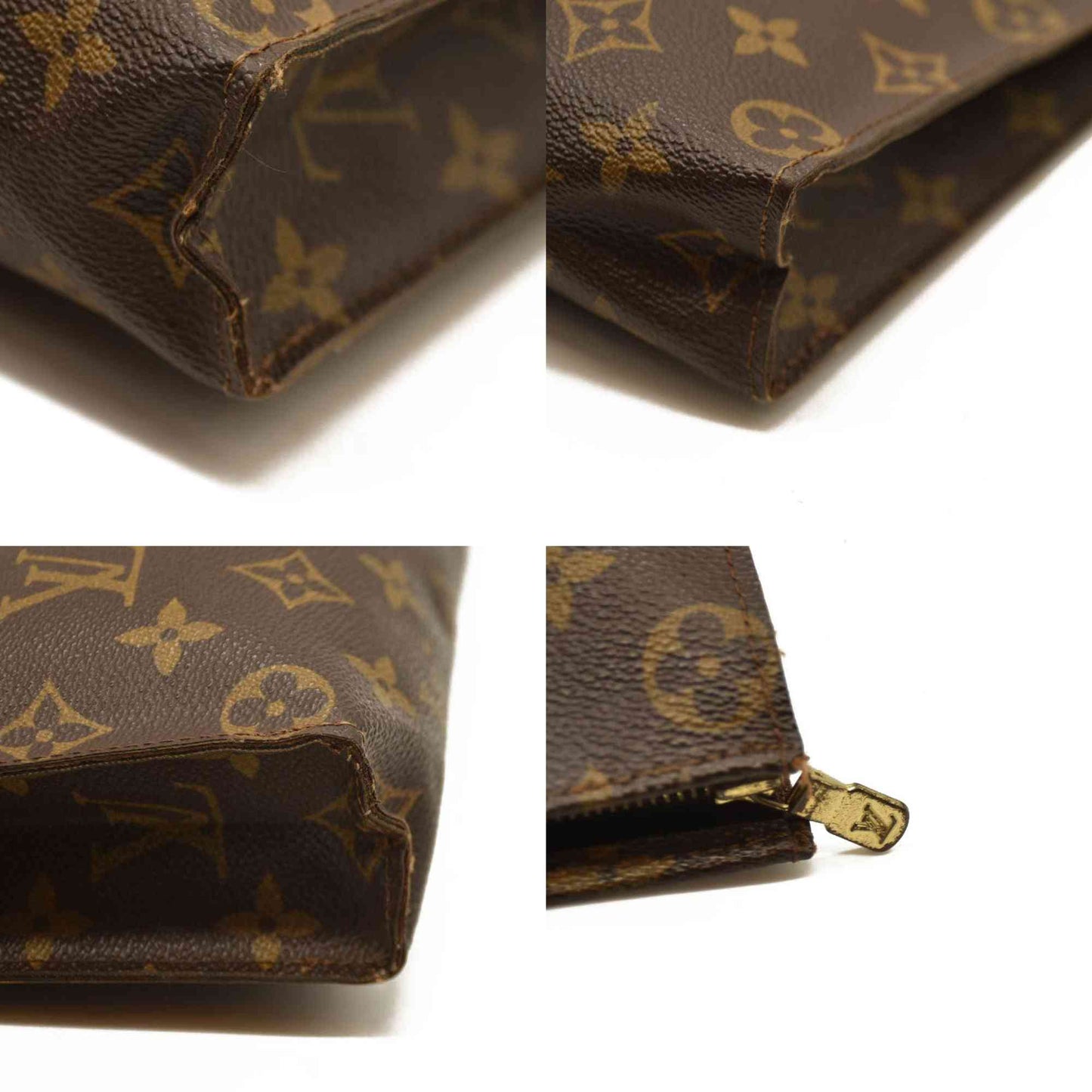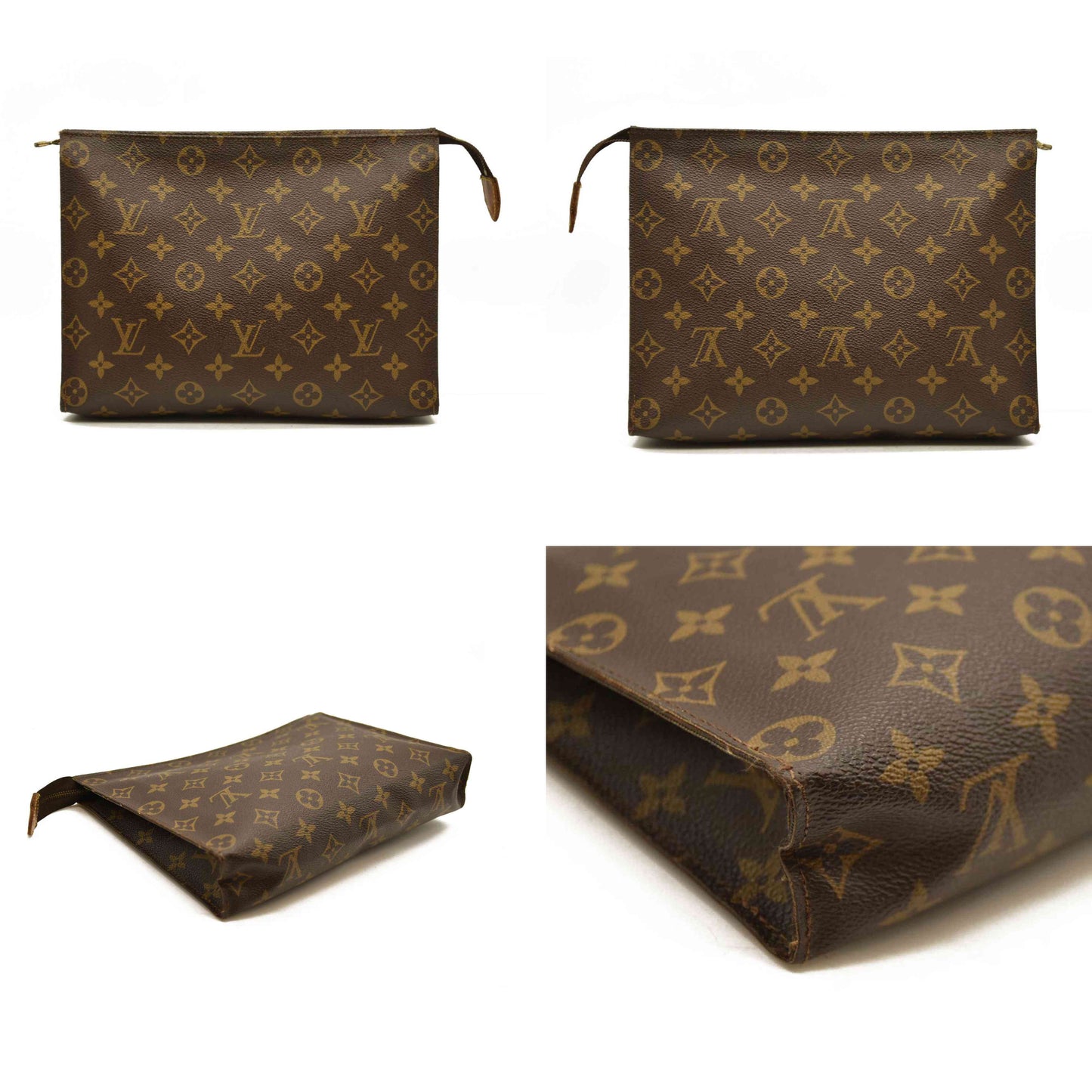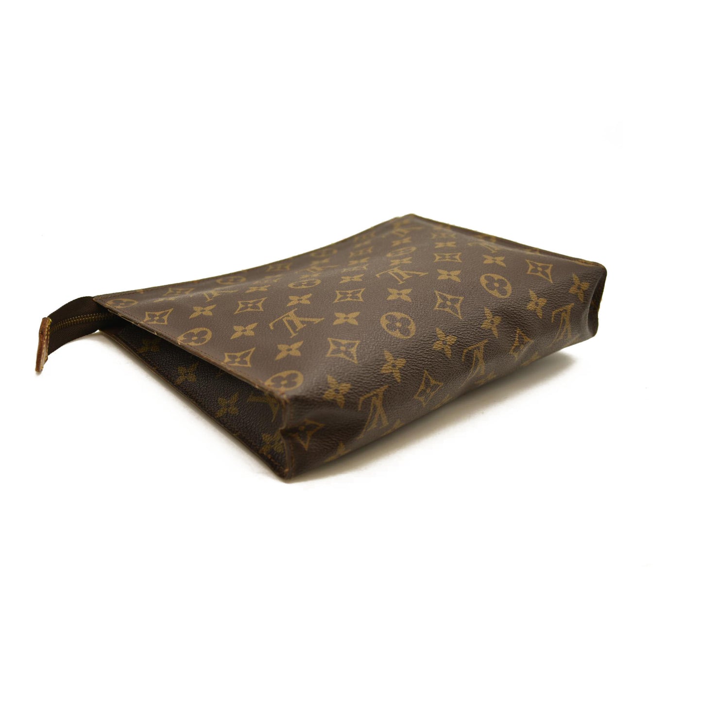 This is an authentic LOUIS VUITTON Monogram Toiletry Pouch 26. This handy travel accessory is crafted of traditional Louis Vuitton monogram on toile coated canvas. The pouch features a top overextended zipper that opens to a spacious vintage brown interior.