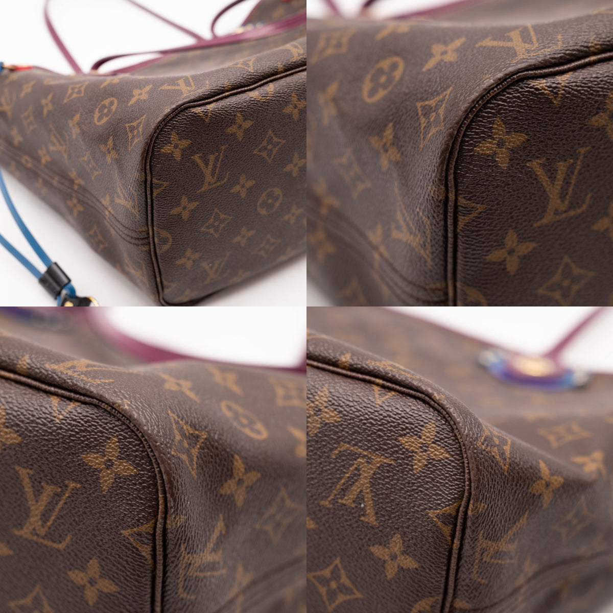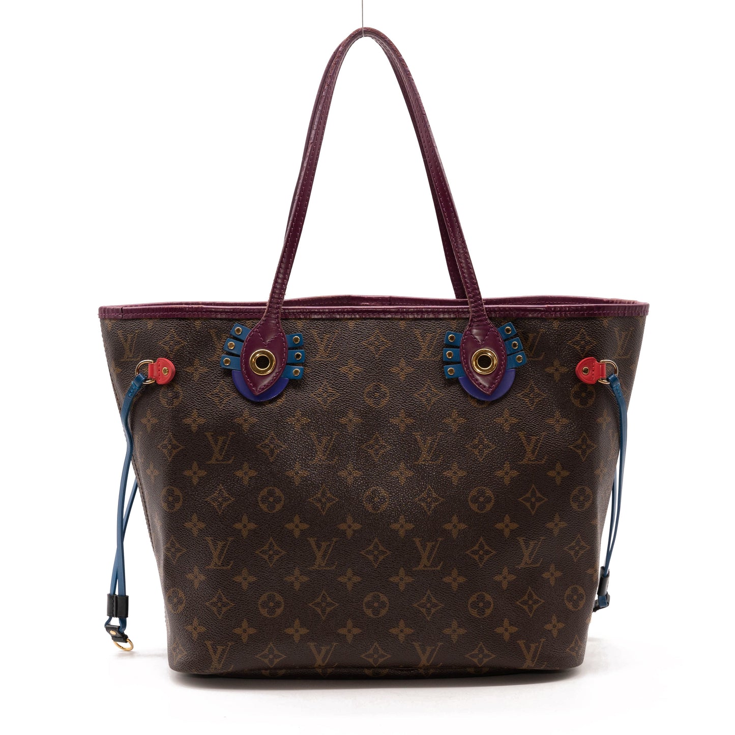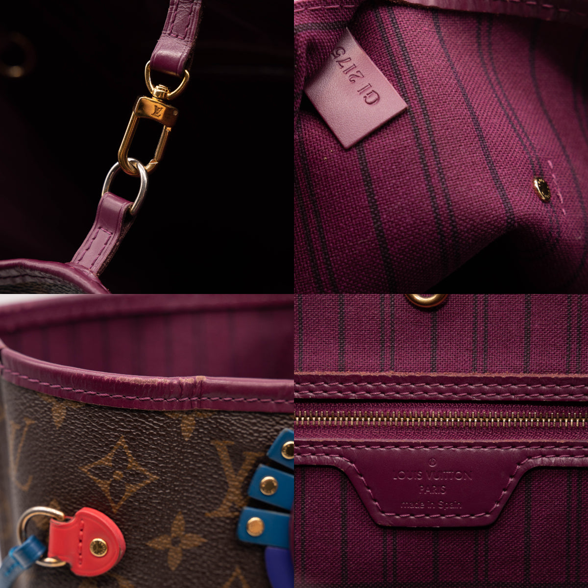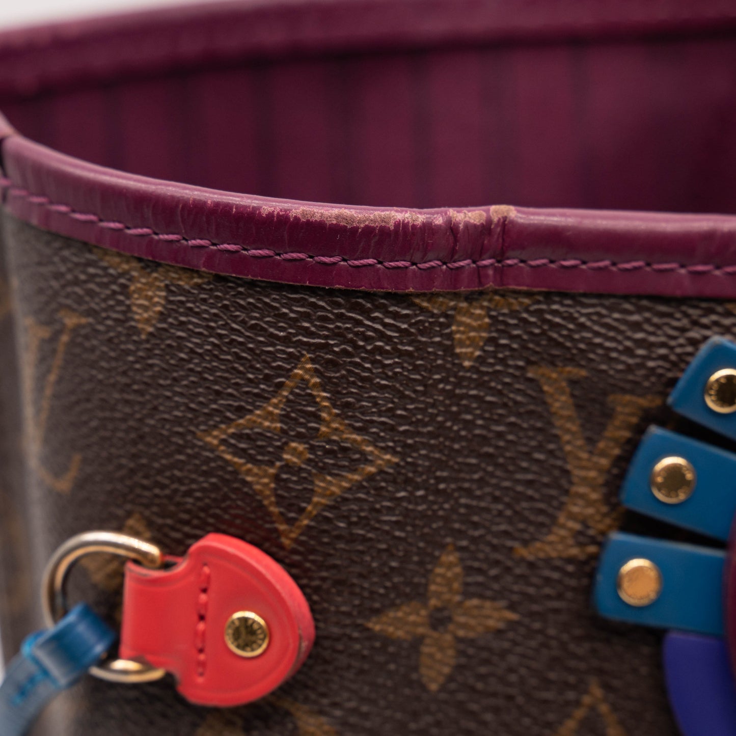 This is an authentic LOUIS VUITTON Monogram Totem Neverfull MM in Magenta. This ethnic, tribal-inspired Neverfull is crafted of traditional monogram on toile canvas. The bag features multiple colored accents including top trim and tall strap handles in magenta purple that can support 231 lbs, tribal shapes at the anchors in blue and purple and blue cinch side straps with bright pink anchors. The top is open to a magenta striped fabric interior with a hanging zipper pocket. Enjoy this limited edition Neverfull for everyday essentials, from Louis Vuitton!