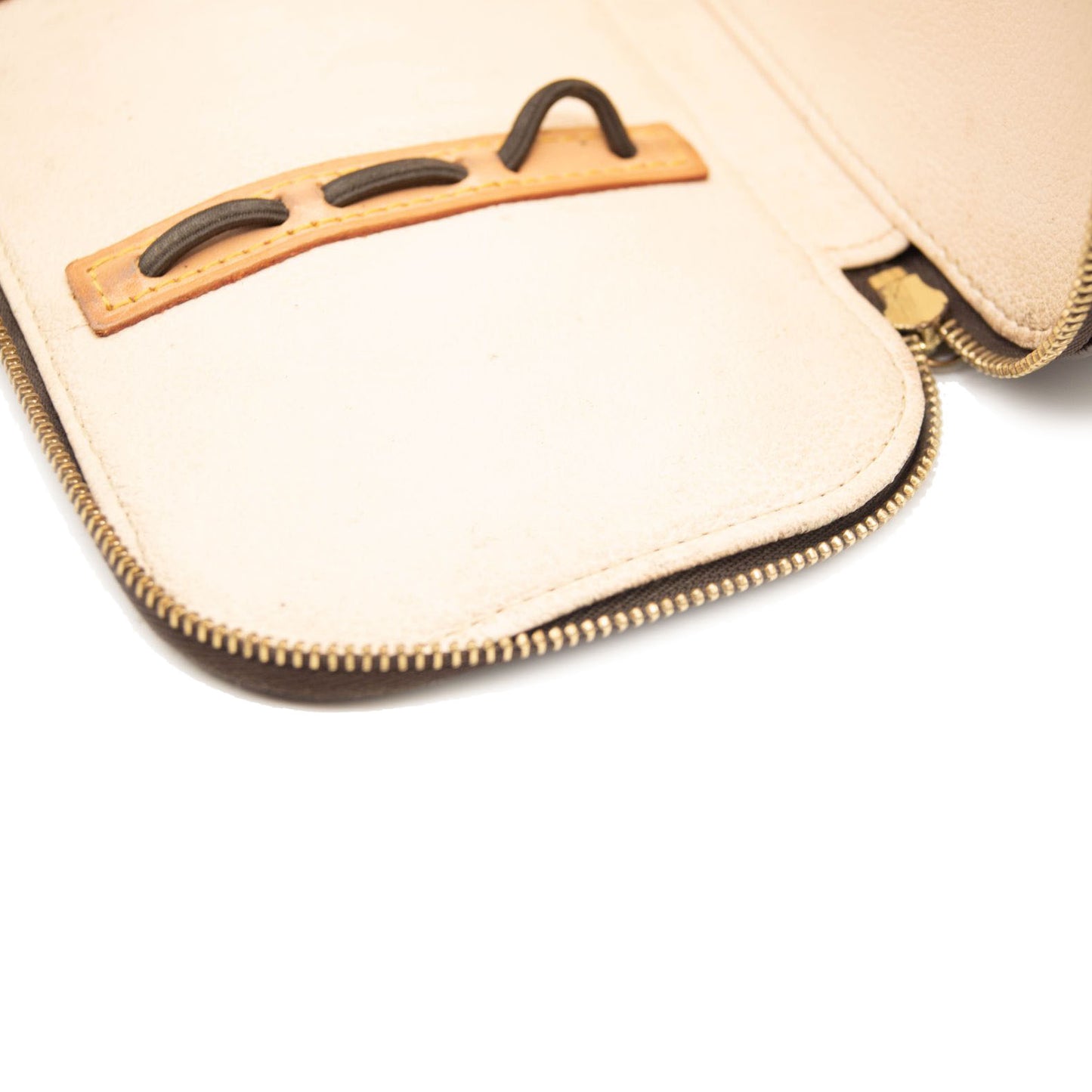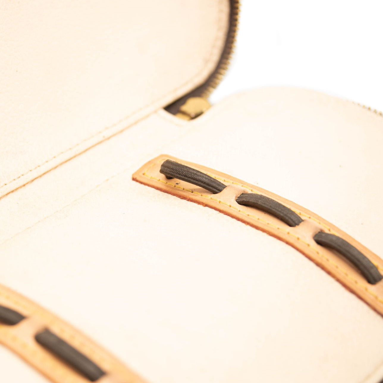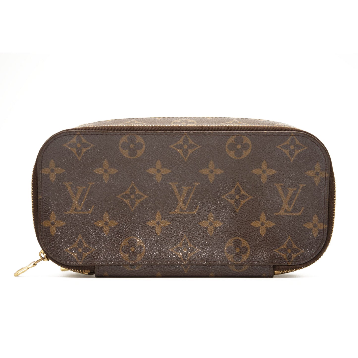 This is an authentic LOUIS VUITTON Monogram Trousse Blush PM. This is a chic, compact and sturdy jewelry case that is finely crafted of Louis Vuitton monogram on toile canvas. The case is a distinctive oval and features two sides both with a brass wrap around zipper that open to an ivory leather interior organized to hold your valuables. Enjoy this case for the right accent of luxury and style from Louis Vuitton!