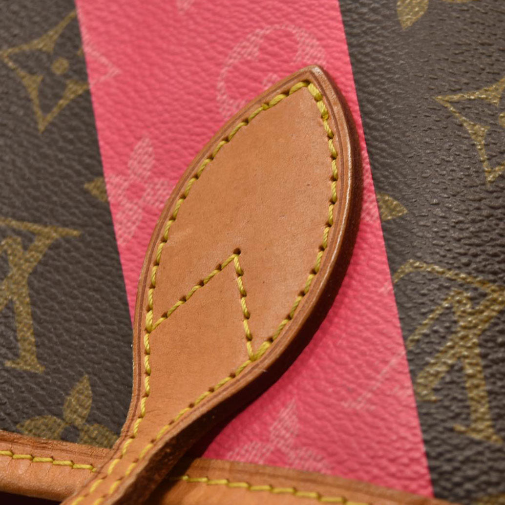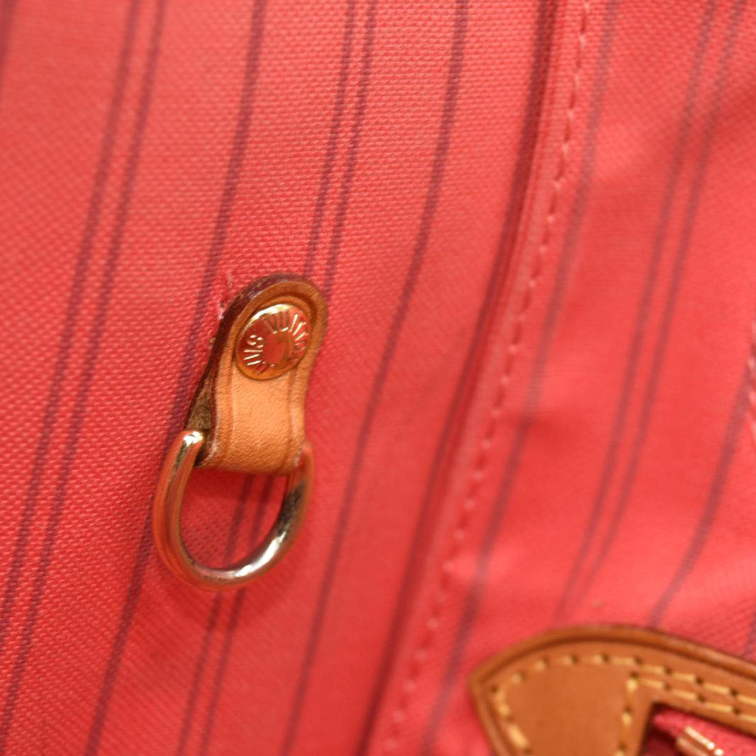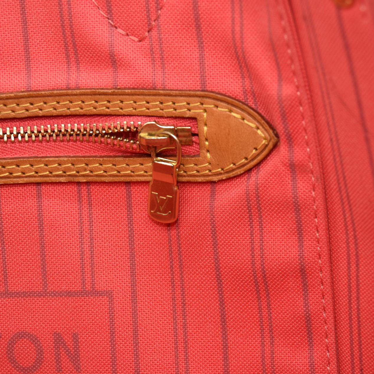 This is an authentic LOUIS VUITTON Monogram V Neverfull MM Grenade. This stylish tote is crafted of classic Louis Vuitton monogram on toile canvas in the medium size with a large pink V on the front. The shoulder bag features natural vachetta cowhide leather strap handles, trim and side cinch cords with polished gold hardware. The wide top is open to a striped pink fabric interior with a hanging zipper pocket and matching pochette.