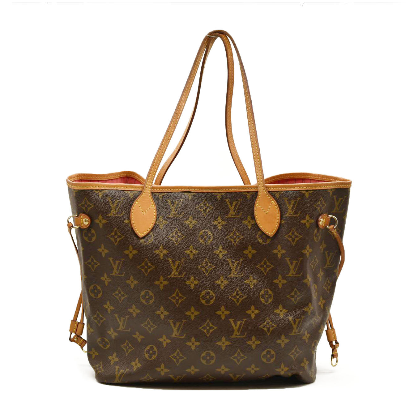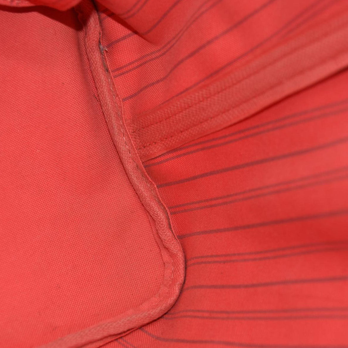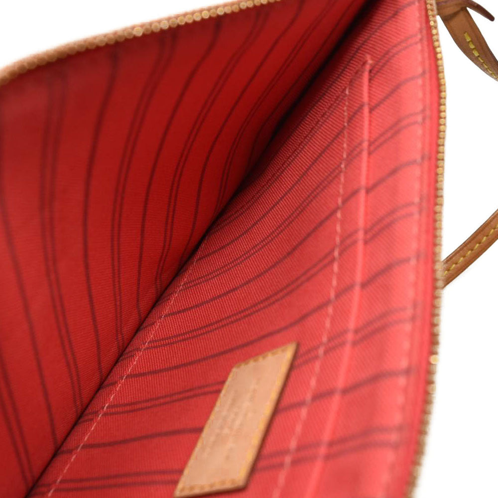 This is an authentic LOUIS VUITTON Monogram V Neverfull MM Grenade. This stylish tote is crafted of classic Louis Vuitton monogram on toile canvas in the medium size with a large pink V on the front. The shoulder bag features natural vachetta cowhide leather strap handles, trim and side cinch cords with polished gold hardware. The wide top is open to a striped pink fabric interior with a hanging zipper pocket and matching pochette.