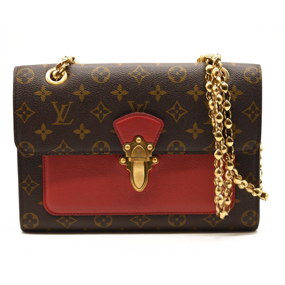This is an authentic LOUIS VUITTON Monogram Victoire in Cherry. This chic shoulder bag is crafted of Louis Vuitton monogram on toile canvas, with red calfskin leather side panels and a front pocket. The bag features a polished brass bijoux chain-link shoulder strap and a matching brass press lock for the crossover flap. This opens the bag to a partitioned red microfiber interior with a zipper compartment.