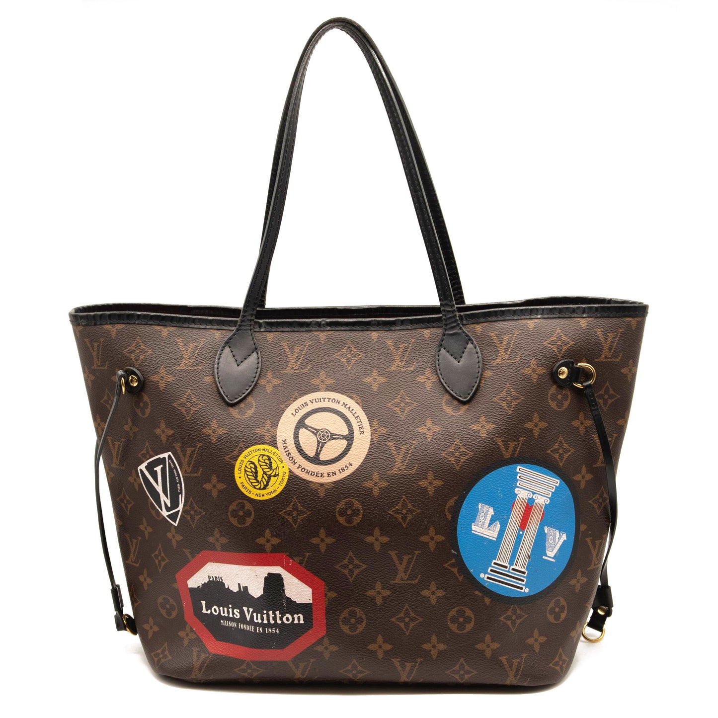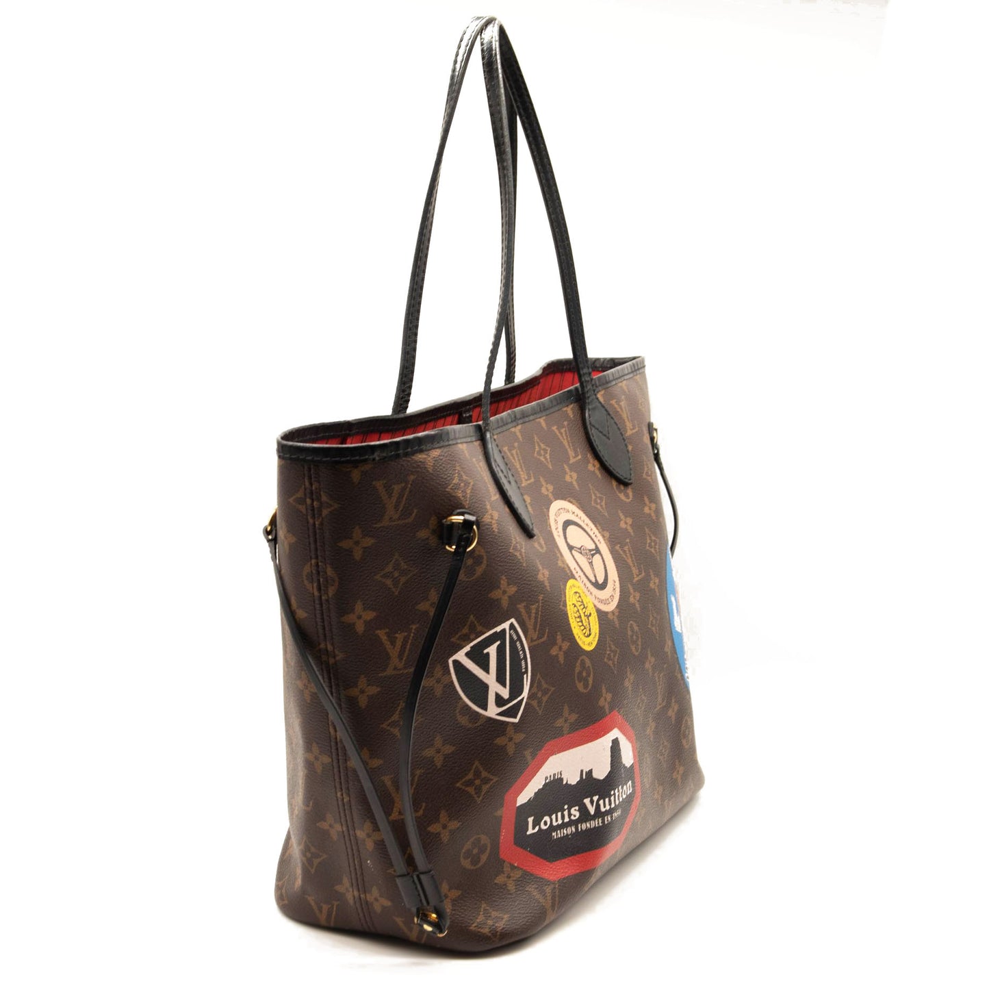 This is an authentic LOUIS VUITTON Monogram World Tour Neverfull MM. This chic tote is finely crafted of Louis Vuitton monogram on brown toile canvas. The tote features a playful look of classic stickers, black leather trim, and black leather shoulder straps. The wide top is open to a red striped fabric interior with a hanging zipper pocket