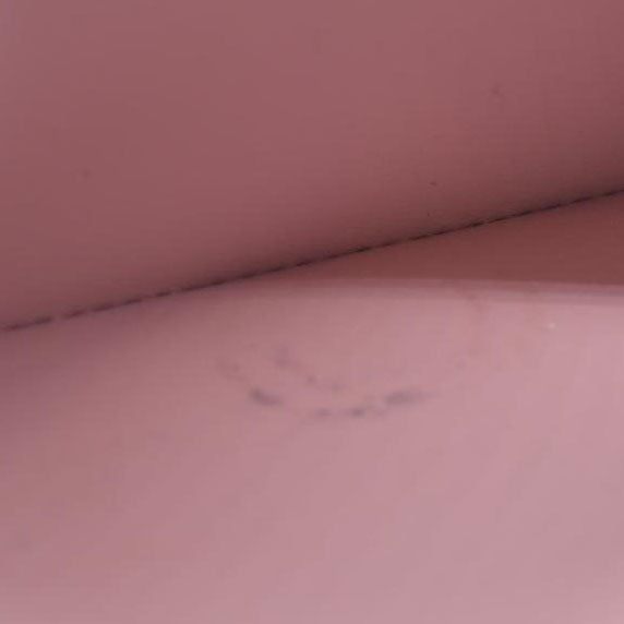 The exterior is rubbed with scratches. The corner has damage or break. There are rubbed marks on the inside. There are stains on the inside.