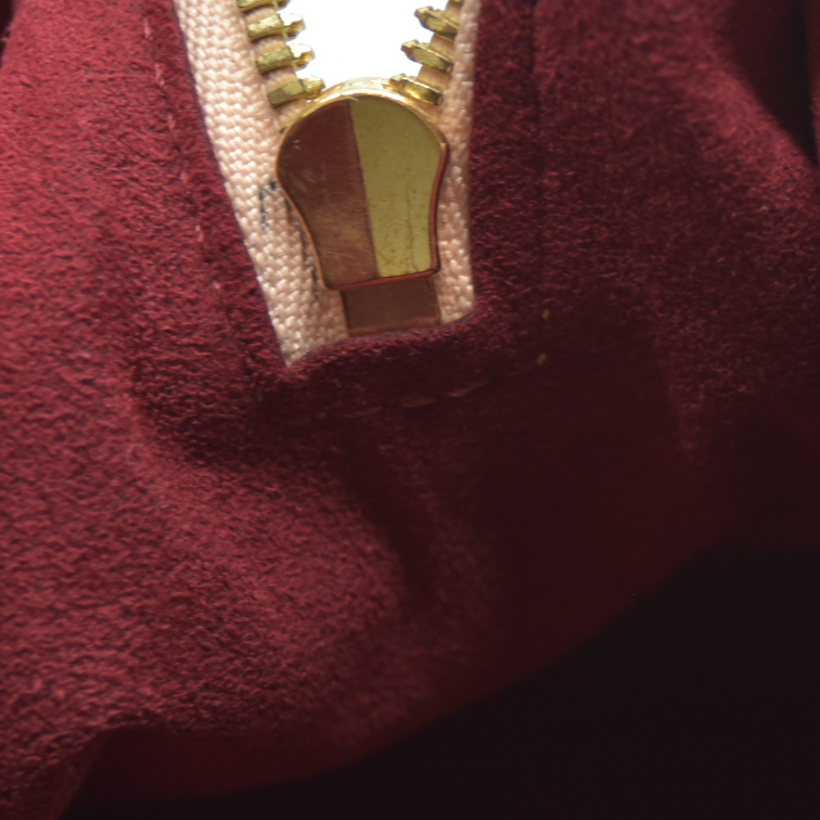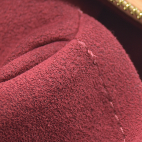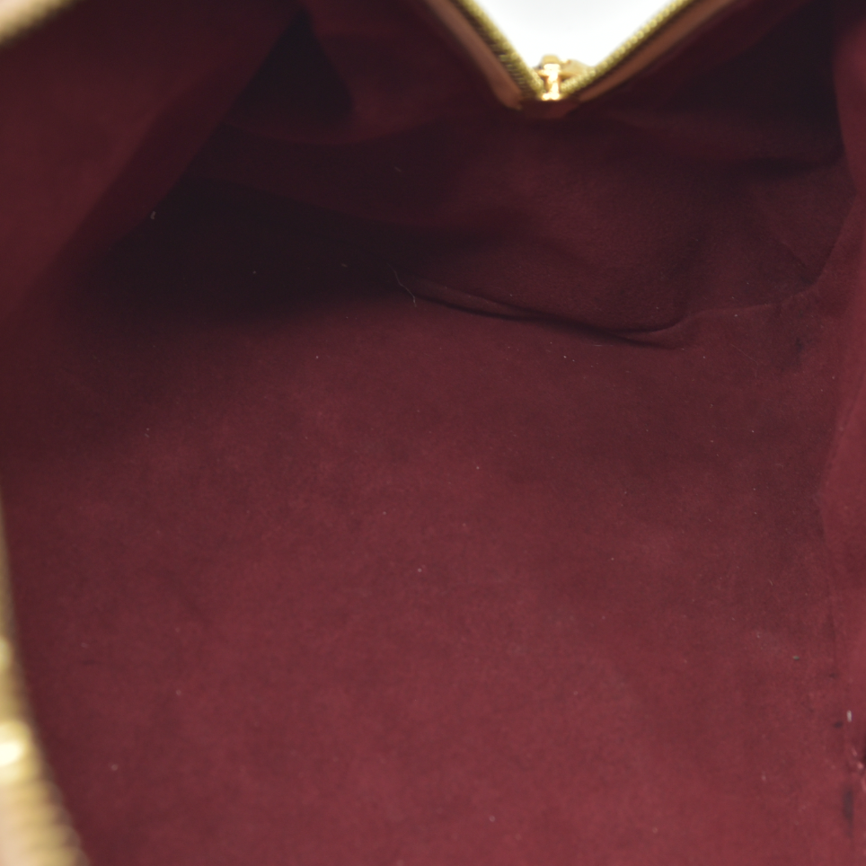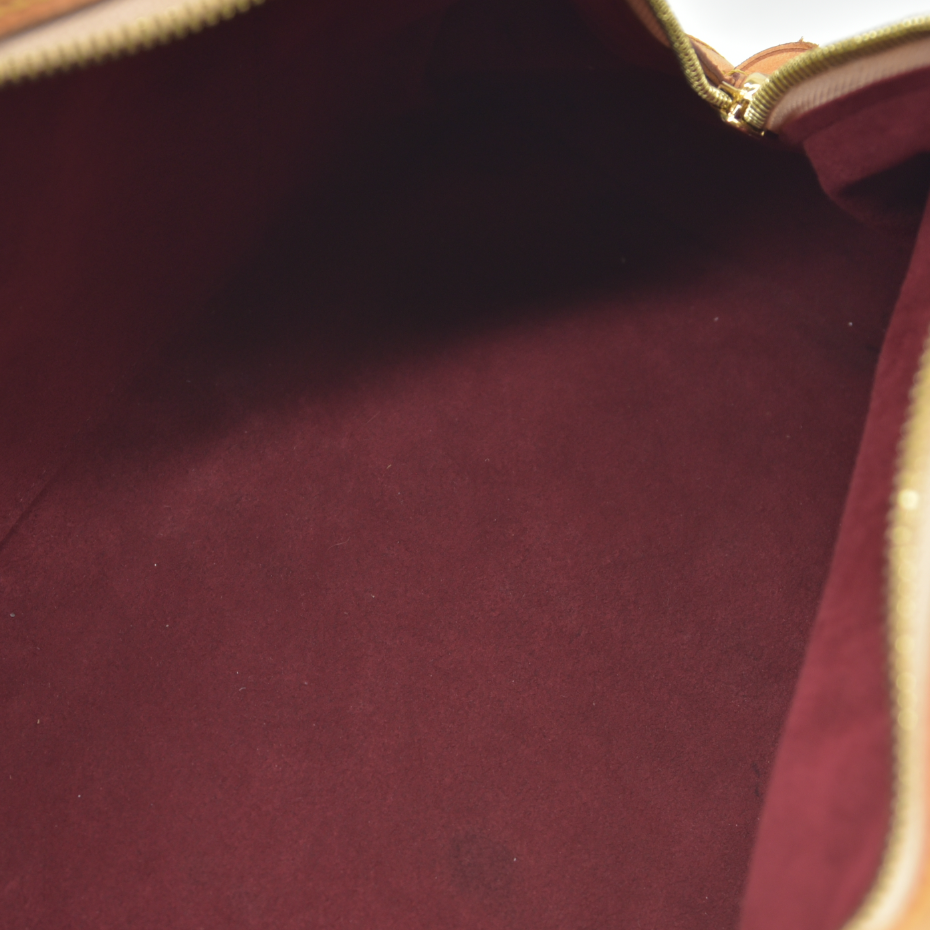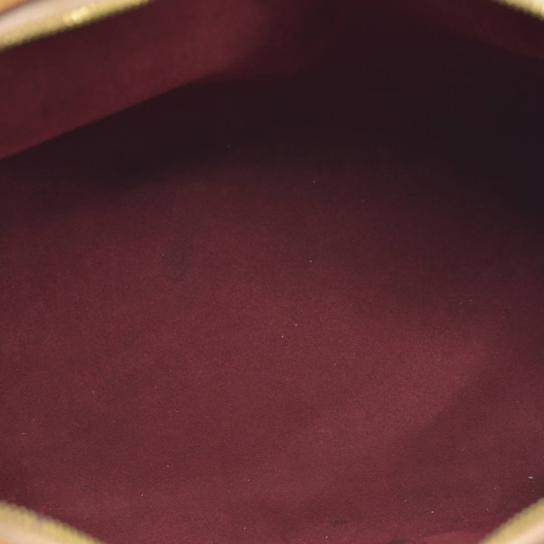 Heavy scuffs at exterior; moderate patina at handle; minor residue at interior; minor scratches at hardware; minor discoloration at interior and at hardware; shape has relaxed due to wear