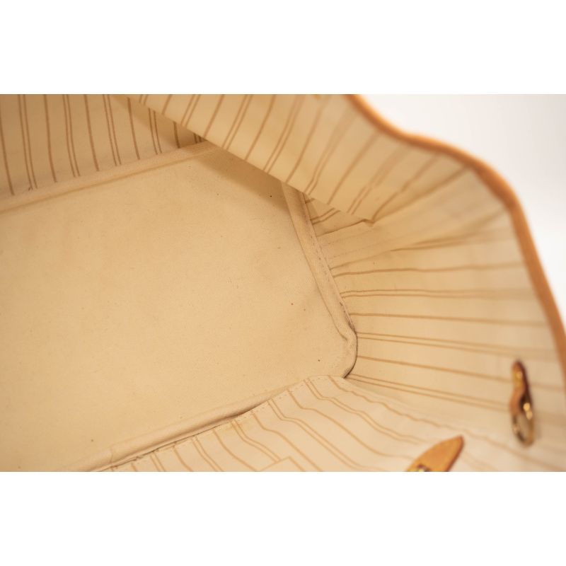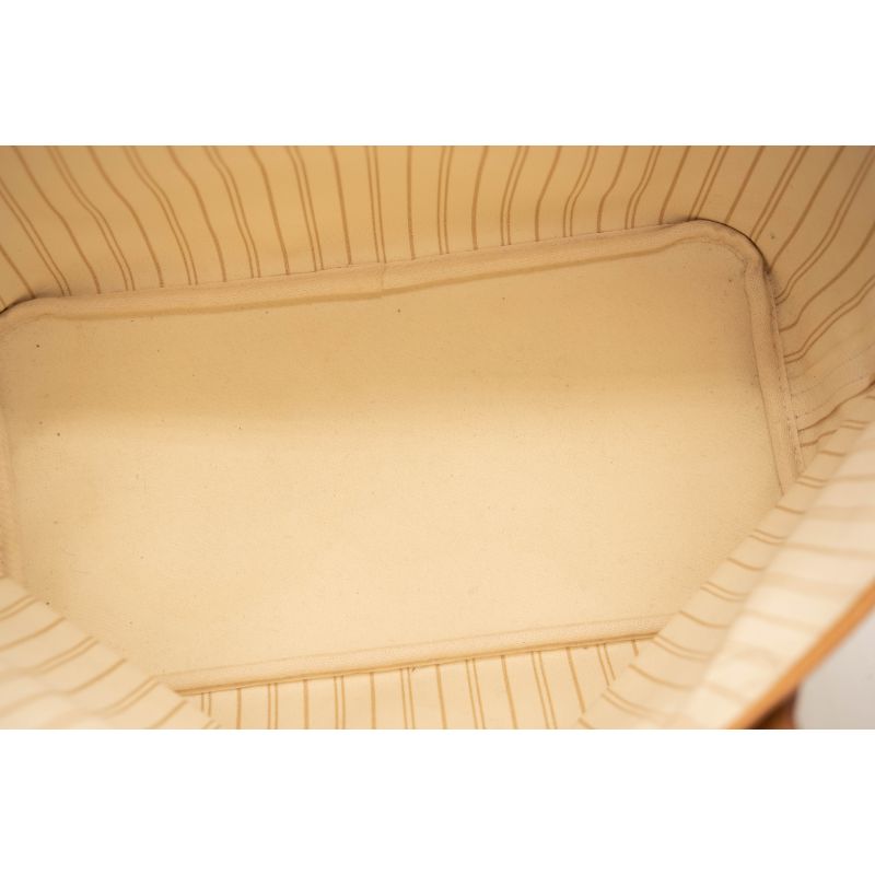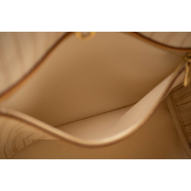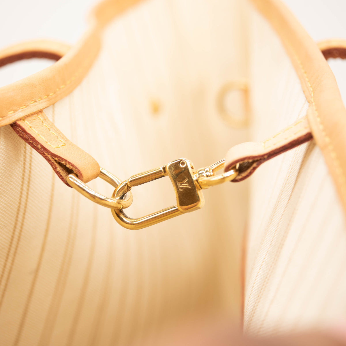 This is an authentic LOUIS VUITTON Damier Azur Neo Neverfull MM. This stylish tote is crafted of Louis Vuitton's signature Damier canvas in blue and white. This shoulder bag features vachetta cowhide leather trim including strap handles and side cinch-cords with polished brass hardware. The bag opens to a beige striped fabric interior with a hanging zipper pocket.