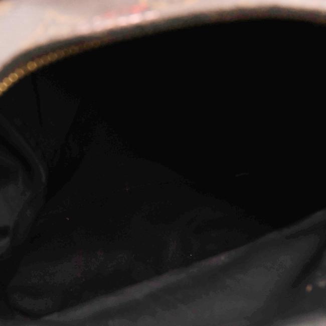 Details: Exterior has wear, marks, creasing, and signs of color loss from rubbing to front side, side edges, and top part is mostly faded. Signs of surface to monogram canvas along zipper trail and unnoticeable cracking to protective glazing of strap bases, handle bases, and bottom loop edges. Front leather tab and side tabs show fraying. Interior has wear and marks. Slight sitting smell. Front pocket lining has light wear. Hardware has scuffing with minor fading. Date code is shown in the picture. Dust bag is included.