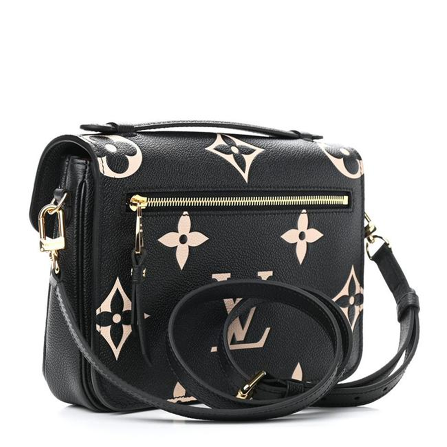 We guarantee this is an authentic LOUIS VUITTON Empreinte Monogram Giant Pochette Metis Black Beige or 100% of your money back. This popular crossbody handbag is featured in rich calfskin, embossed with a giant Louis Vuitton monogram in beige on black leather. The shoulder bag features a leather top handle, an optional adjustable leather shoulder strap, a rear zipper pocket, and a polished brass S-lock on the flap. This opens to a partitioned red microfiber interior.