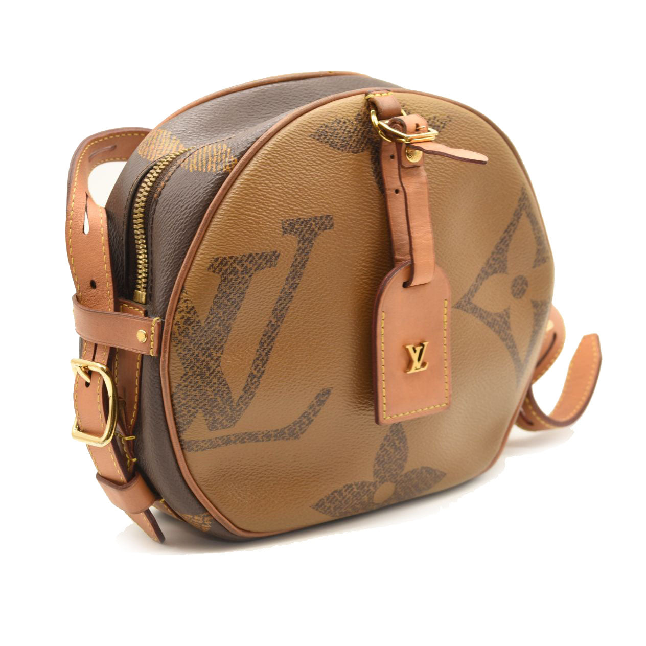 This is an authentic LOUIS VUITTON Reverse Monogram Giant Boite Chapeau Souple. This chic shoulder bag is crafted of Louis Vuitton oversized reverse monogram on coated canvas, with vachetta cowhide leather trim, a flat pocket, and an adjustable shoulder strap with polished brass hardware. The wrap-around zippers open to a black microfiber interior with a patch pocket.