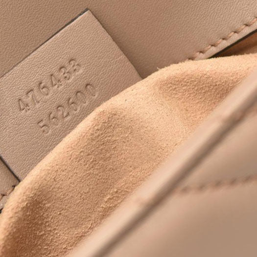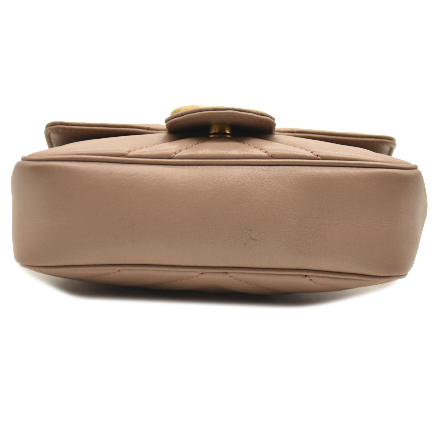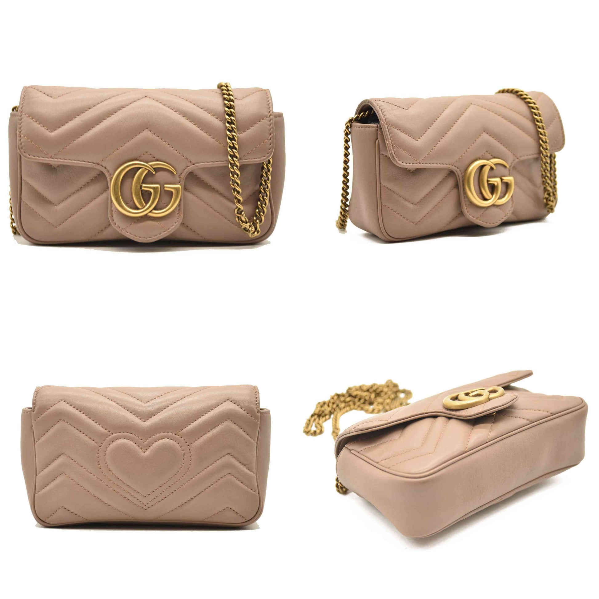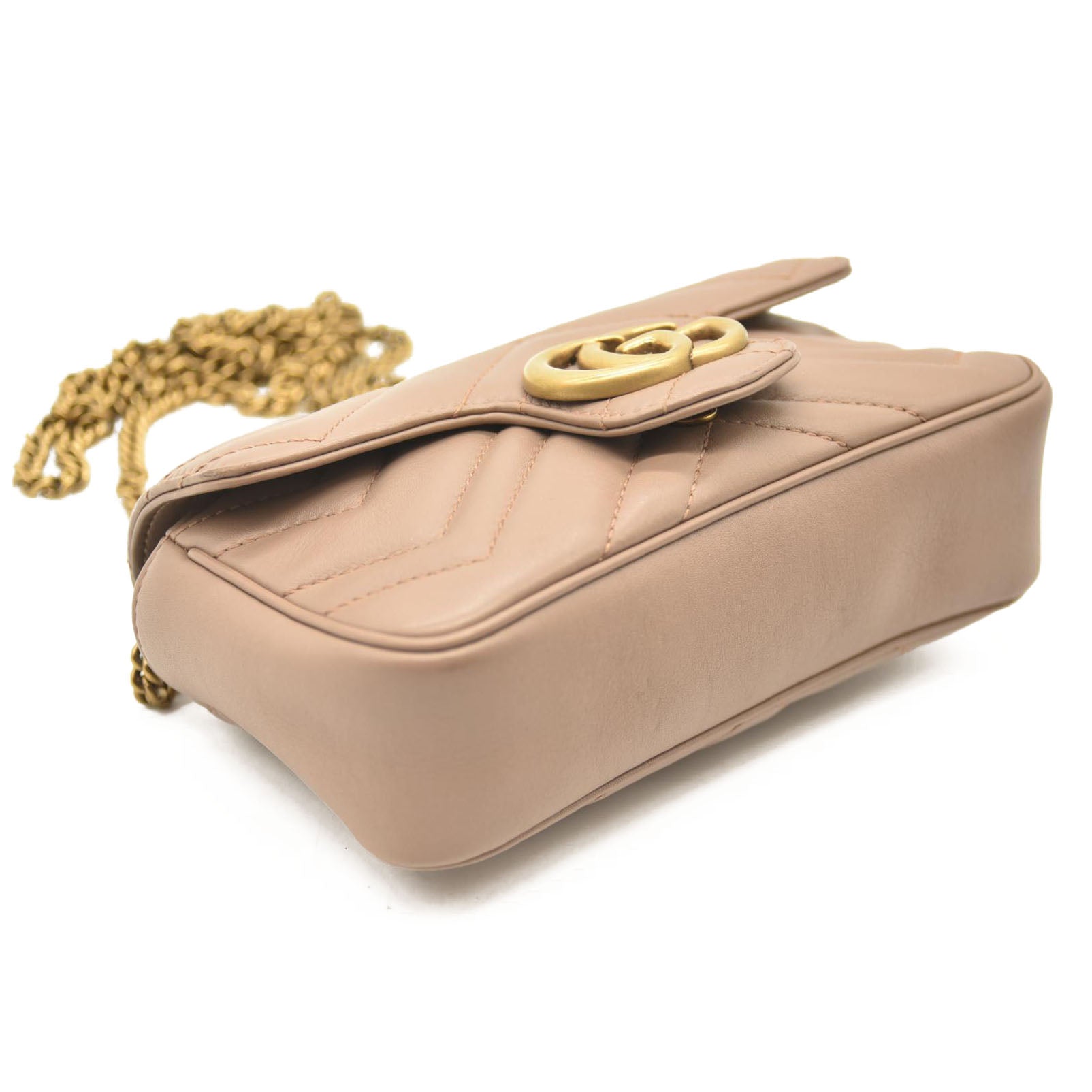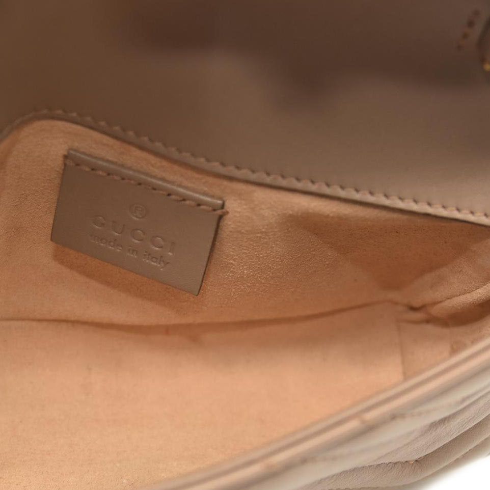 This is an authentic GUCCI Calfskin Matelasse Super Mini GG Marmont Shoulder Bag in Porcelain Rose. This shoulder bag is crafted of smooth and supple dark beige calfskin leather. This crossbody bag features an aged gold chain shoulder strap. The front crossover flap features an interlocking aged gold GG logo that opens to a light beige interior with a key chain.