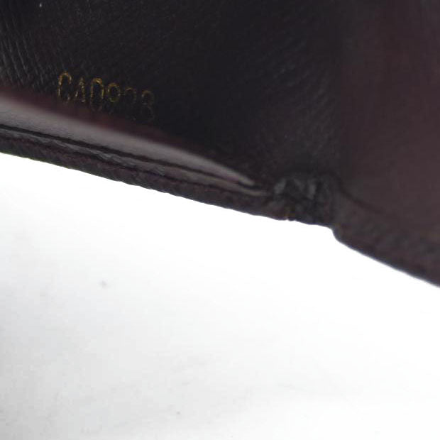 The exterior is rubbed with scratches. There are loose stitches around the folding area. There are rubbed marks on the inside. The inside of pocket is peeled.