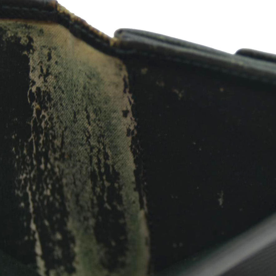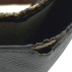 The date code/serial number is rubbed off and unable to be read. The exterior is rubbed with scratches. The exterior is showing stain. The inside of pocket/cash compartment are peeled. There are rubbed marks on the inside.