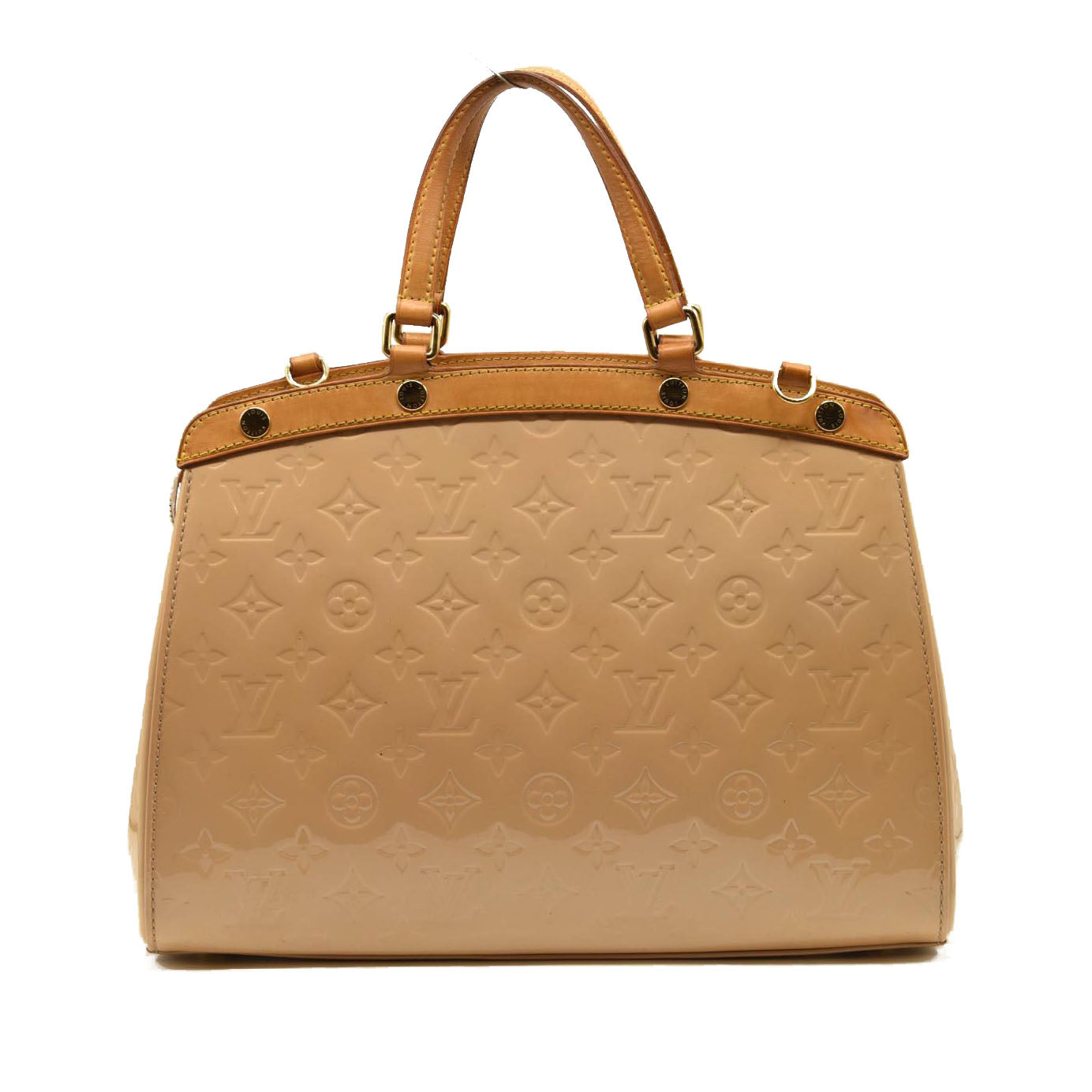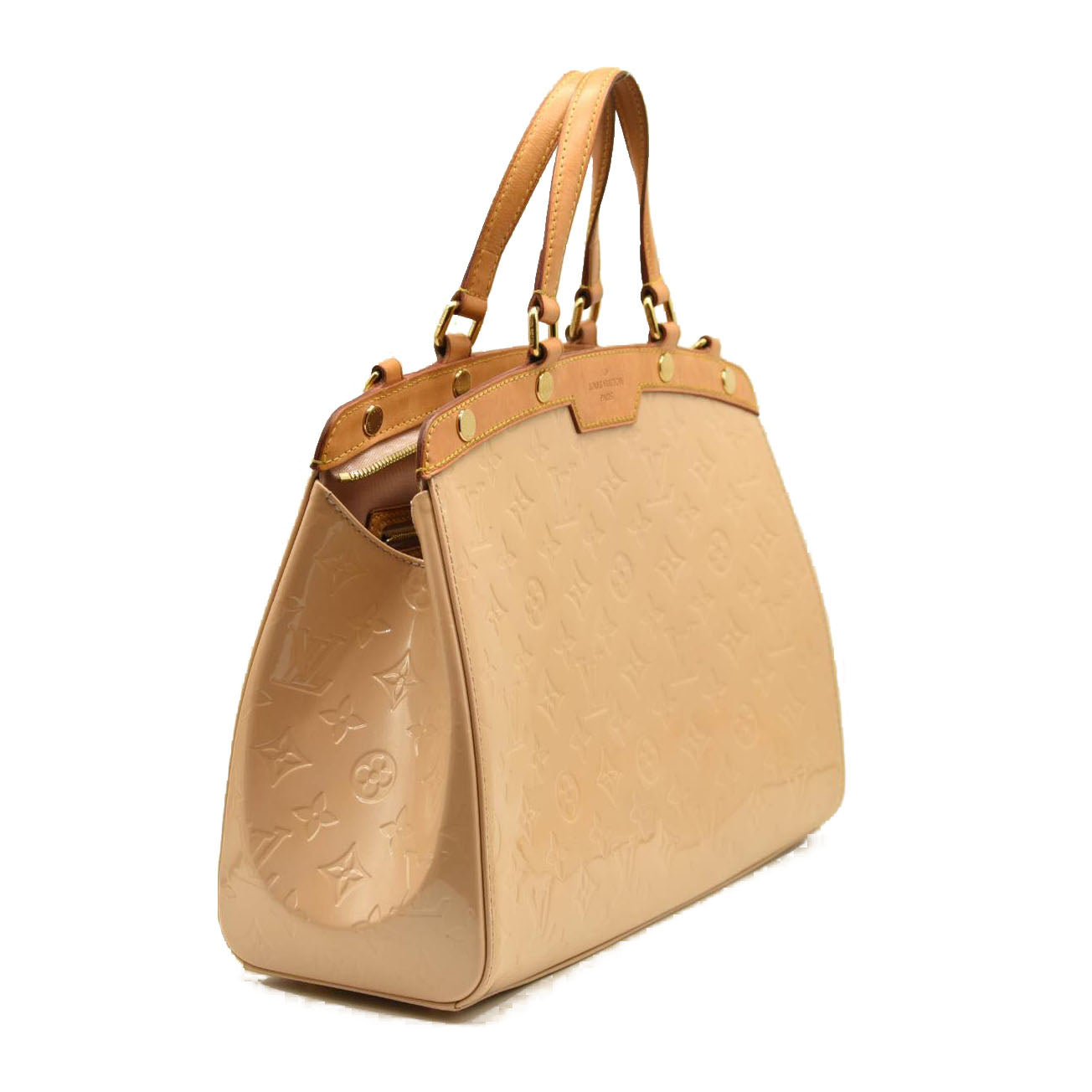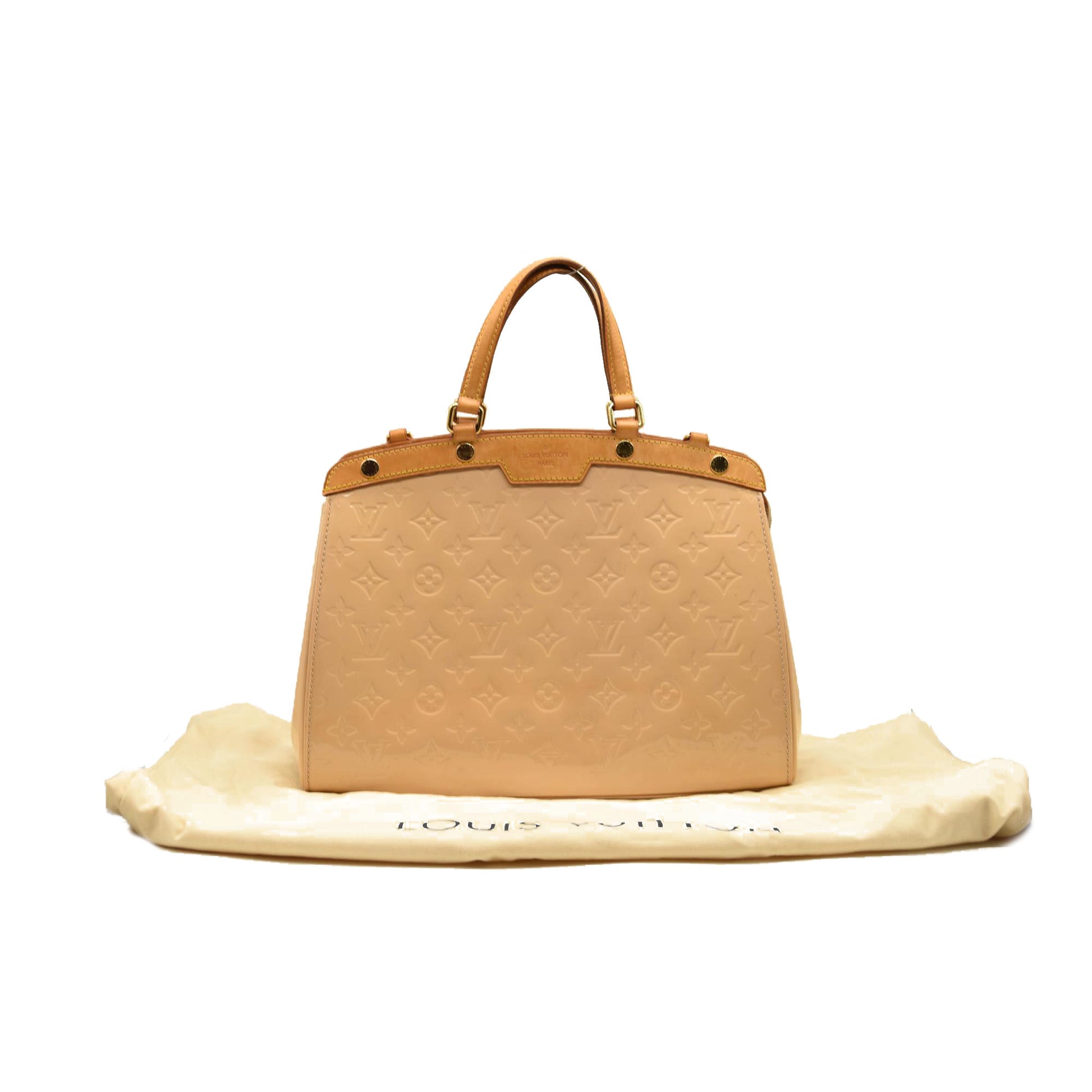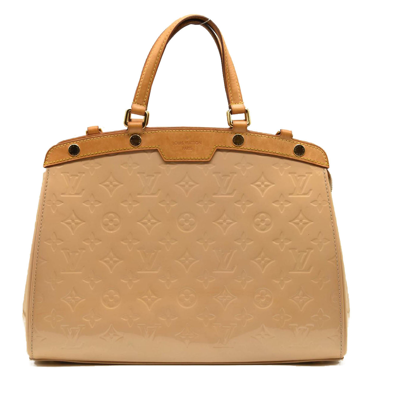 This is an authentic LOUIS VUITTON Vernis Brea MM in Rose Florentin. This sophisticated tote is crafted of beige monogram-embossed patent leather with vachetta leather handles, leather trim, and brass hardware. The top zipper opens to a beige canvas interior with zipper and patch pockets.