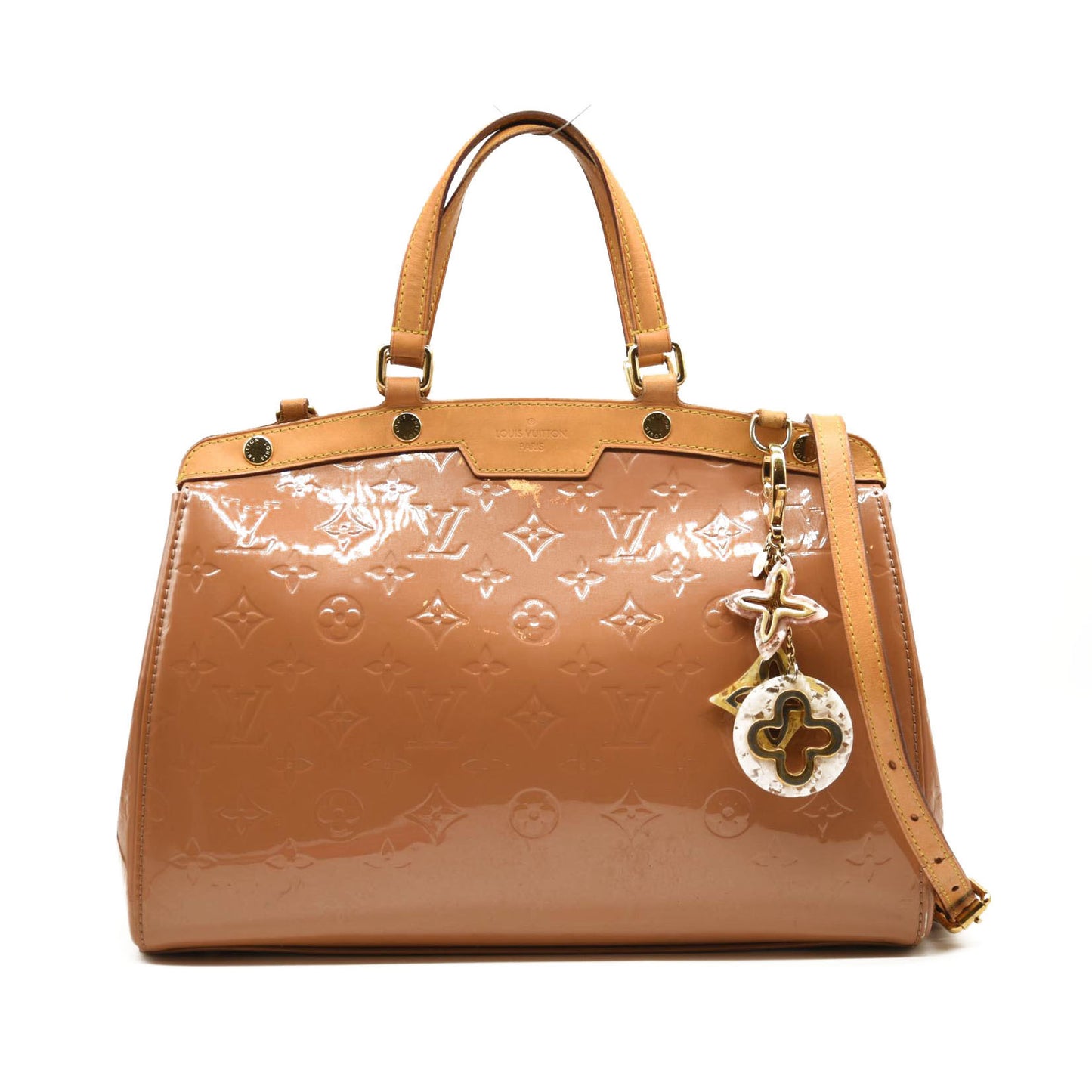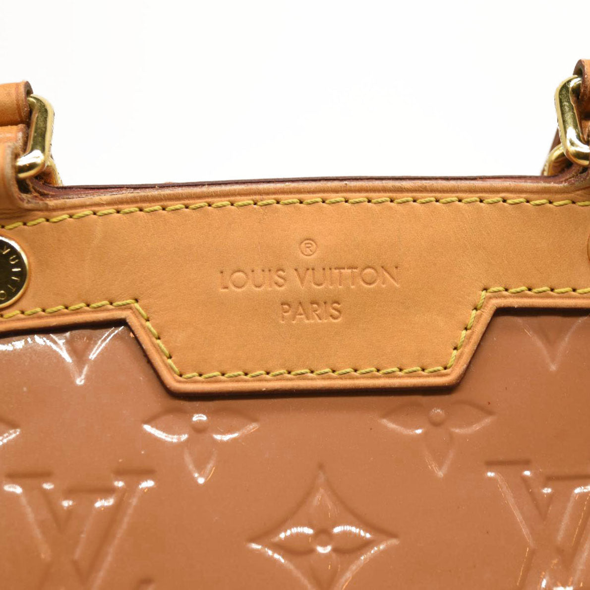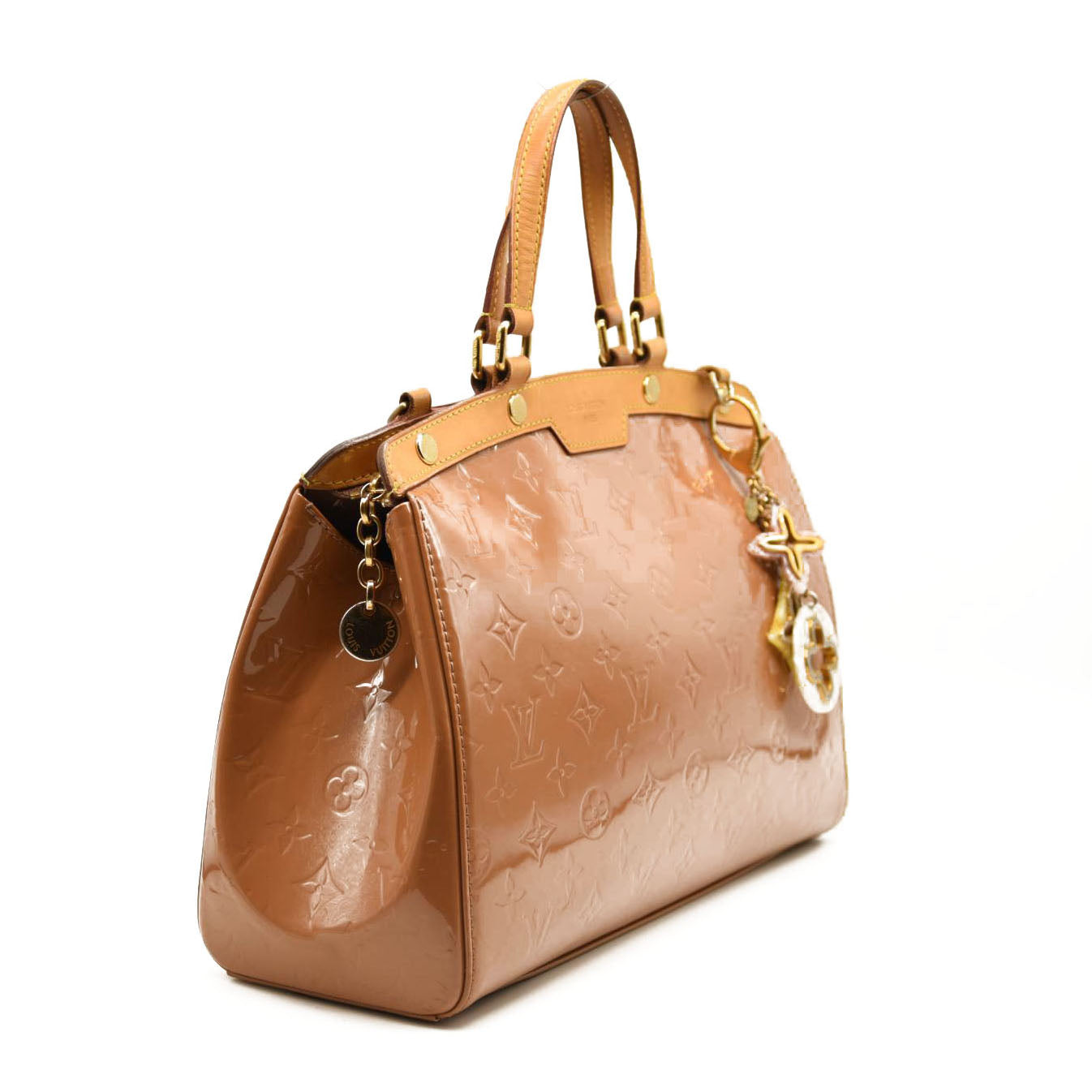 This is an authentic LOUIS VUITTON Vernis Brea MM in Rose Velours. This sophisticated tote is crafted of pink monogram-embossed patent leather with vachetta leather handles, leather trim, and brass hardware. The top zipper opens to interior of beige canvas with zipper and patch pockets.