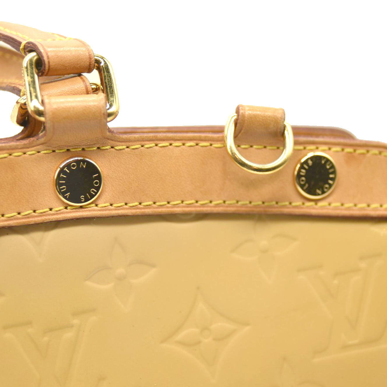 This is an authentic LOUIS VUITTON Vernis Brea MM in Rose Angelique. This is a sophisticated tote that is designed to be beautiful and practical. Crafted of glossy monogram embossed rose pink vernis patent leather, this features trim of natural vachetta cowhide leather including top handles, a shoulder strap, and a top frame. The bag has brass hardware including handle rings, four feet for durability, and a double wrap around zipper. The interior is lined in a pink canvas with zipper and patch pockets. This phenomenal bag will be a true treasure for any Louis Vuitton aficionado!