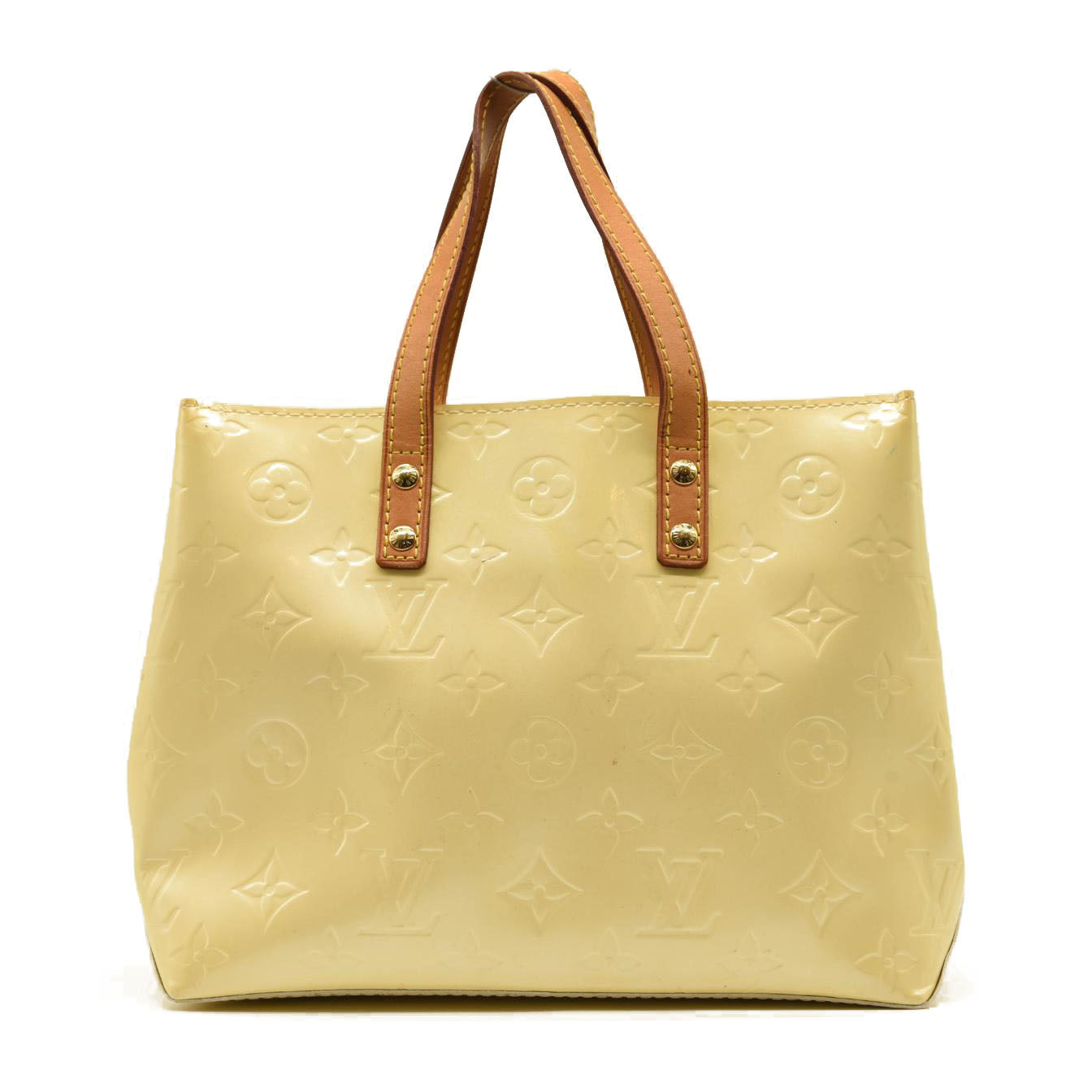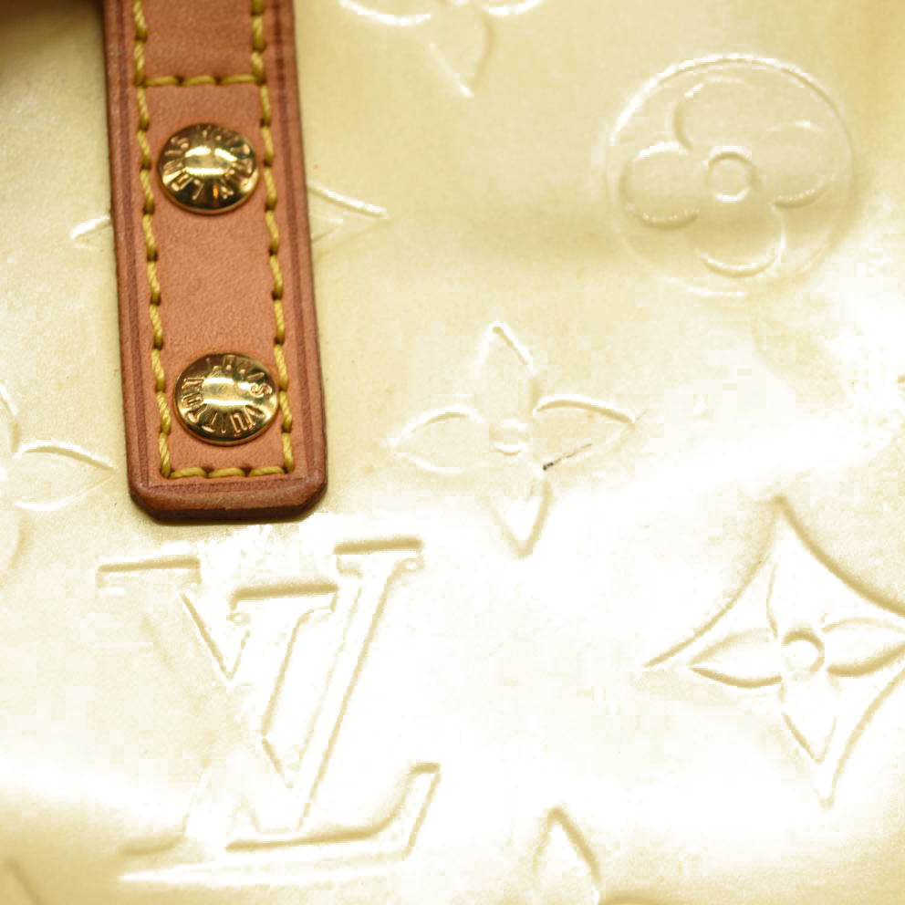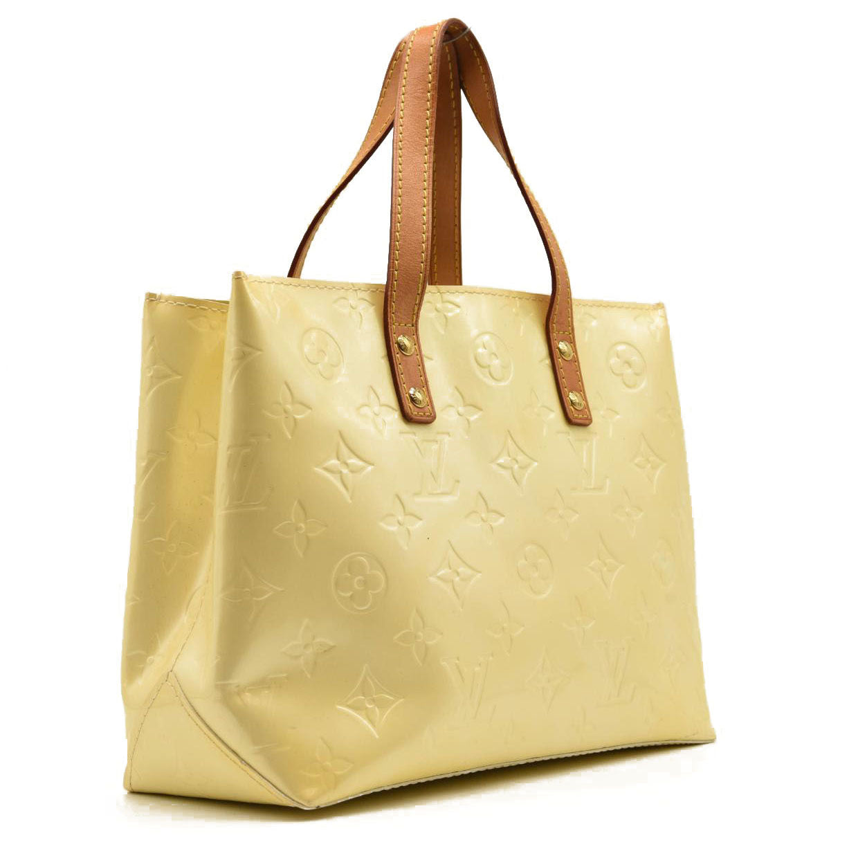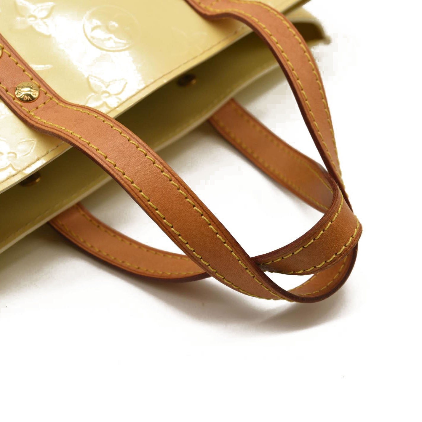 This is an authentic LOUIS VUITTON Vernis Reade PM in Beige. This stylish handbag is crafted of Louis Vuitton monogram embossed vernis patent leather. The bag features vachetta cowhide leather strap top handles, and opens to a grey fabric interior with a zipper pocket.