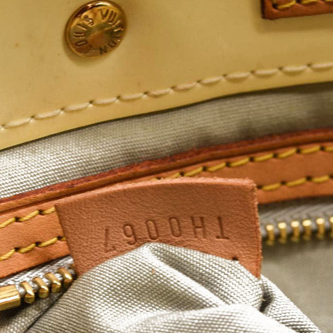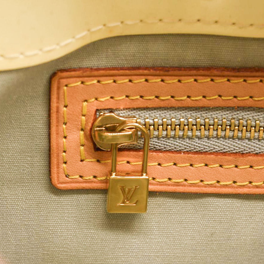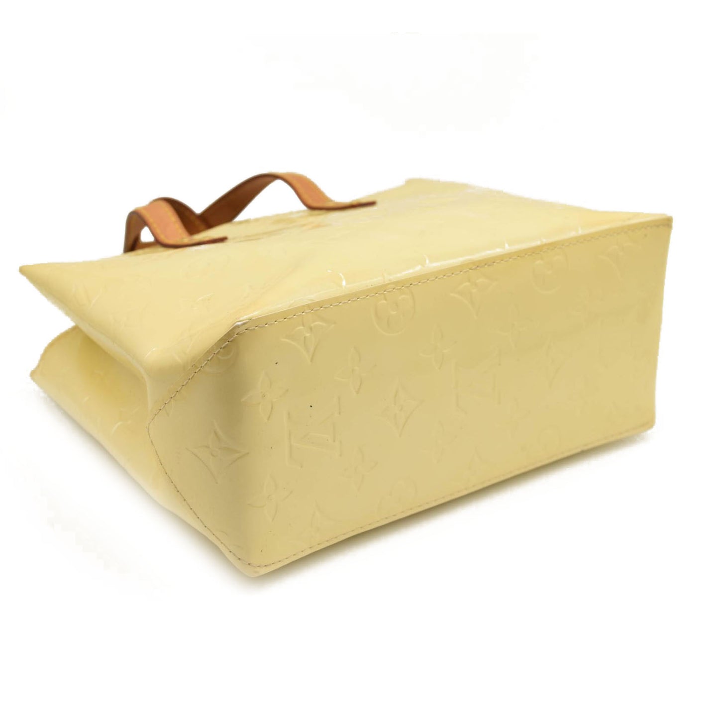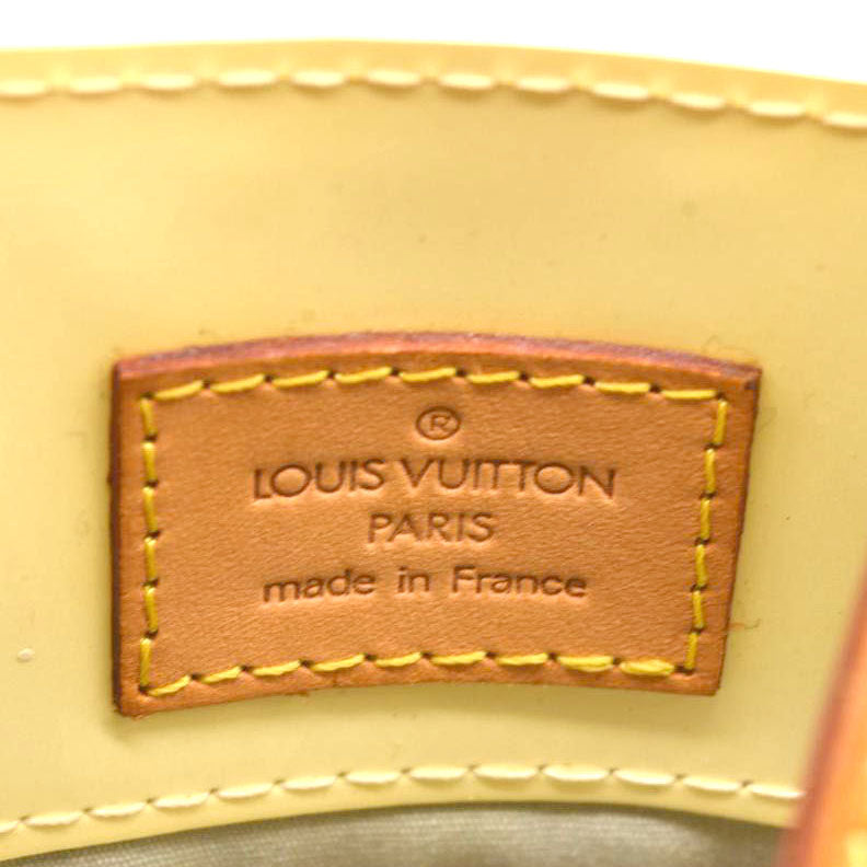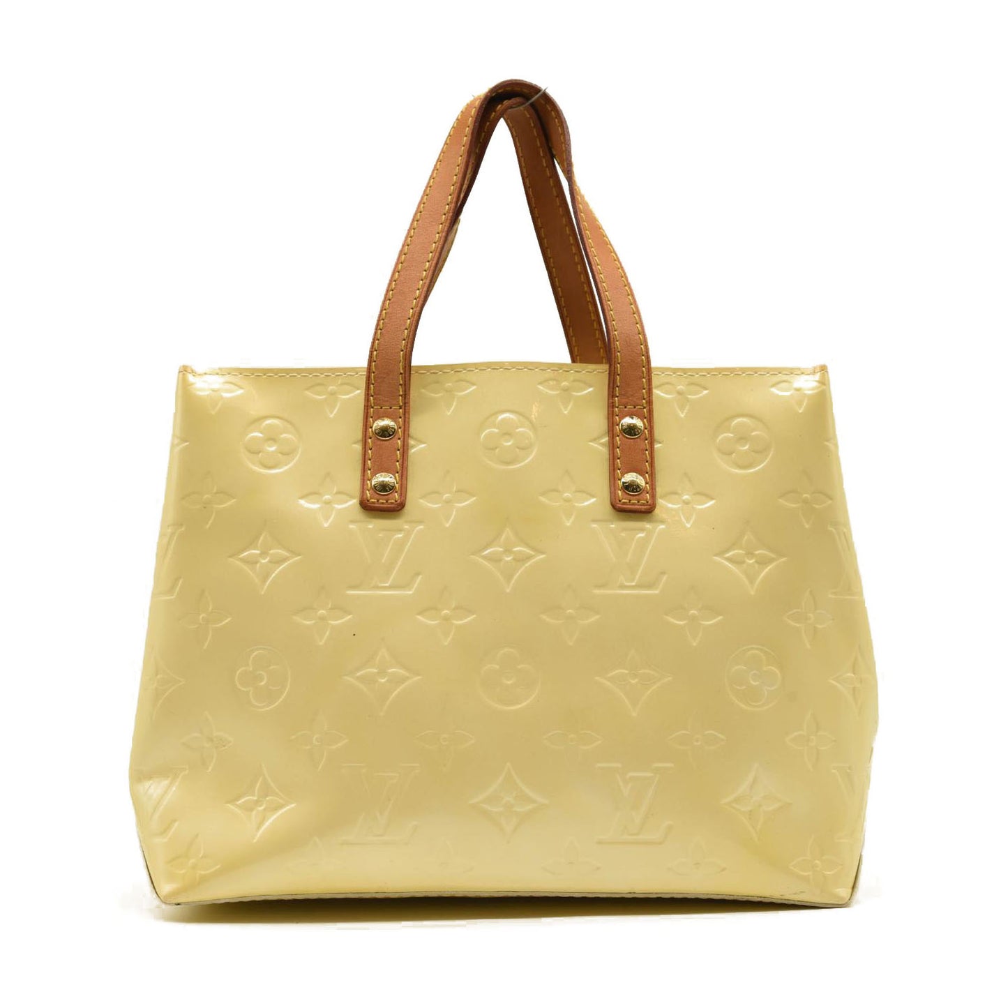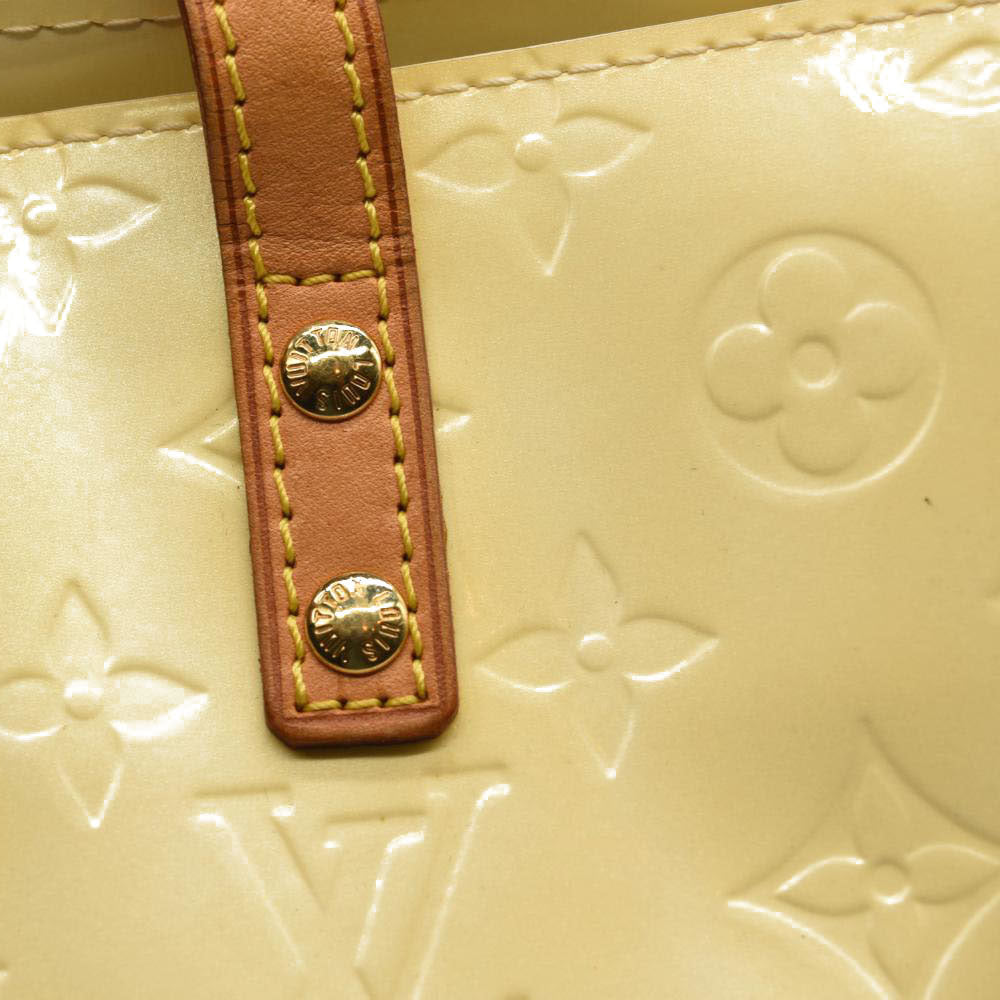 This is an authentic LOUIS VUITTON Vernis Reade PM in Beige. This stylish handbag is crafted of Louis Vuitton monogram embossed vernis patent leather. The bag features vachetta cowhide leather strap top handles, and opens to a grey fabric interior with a zipper pocket.
