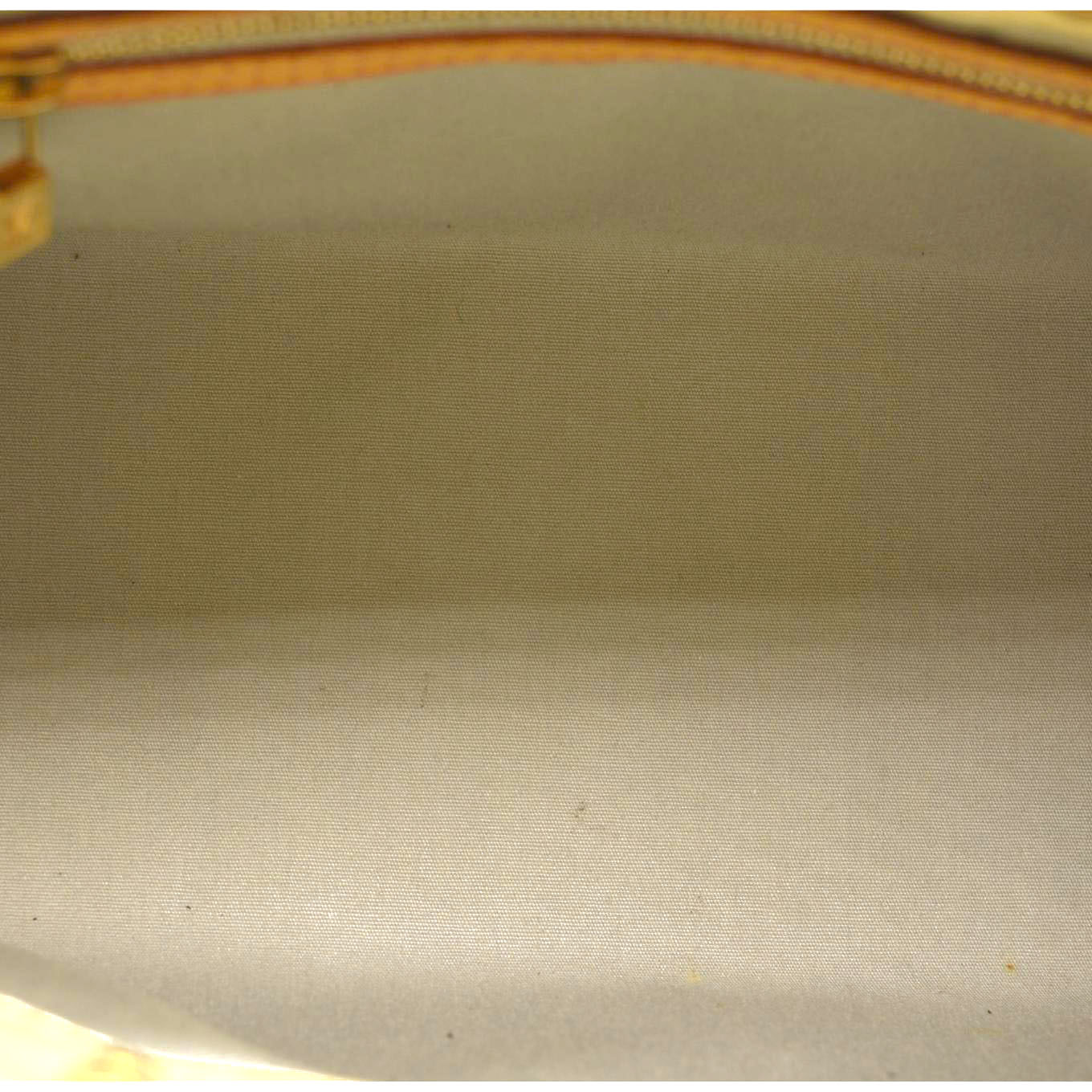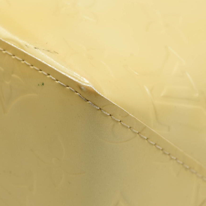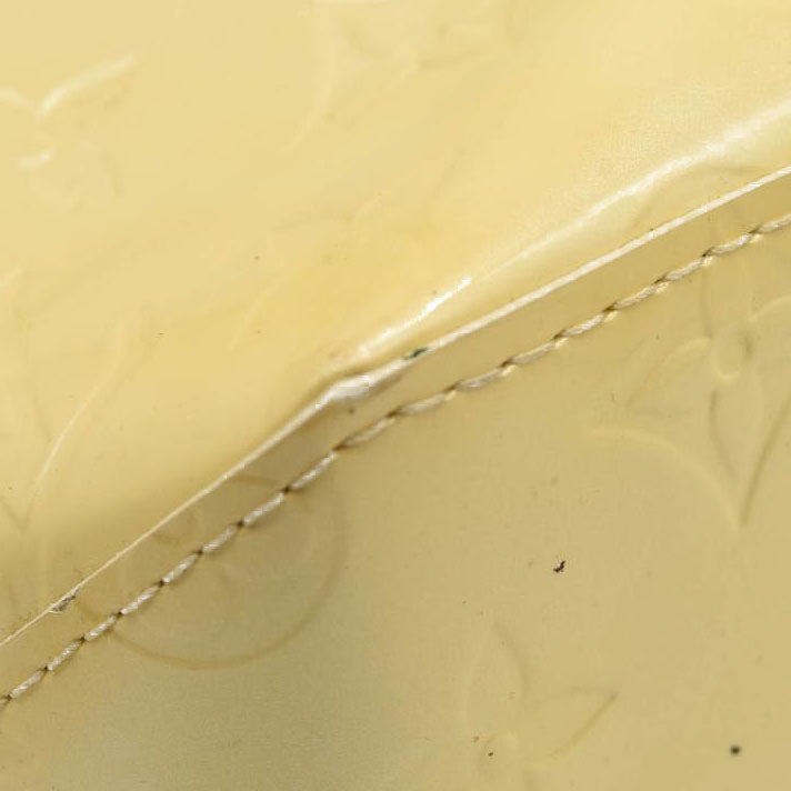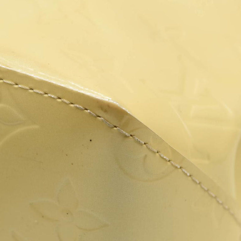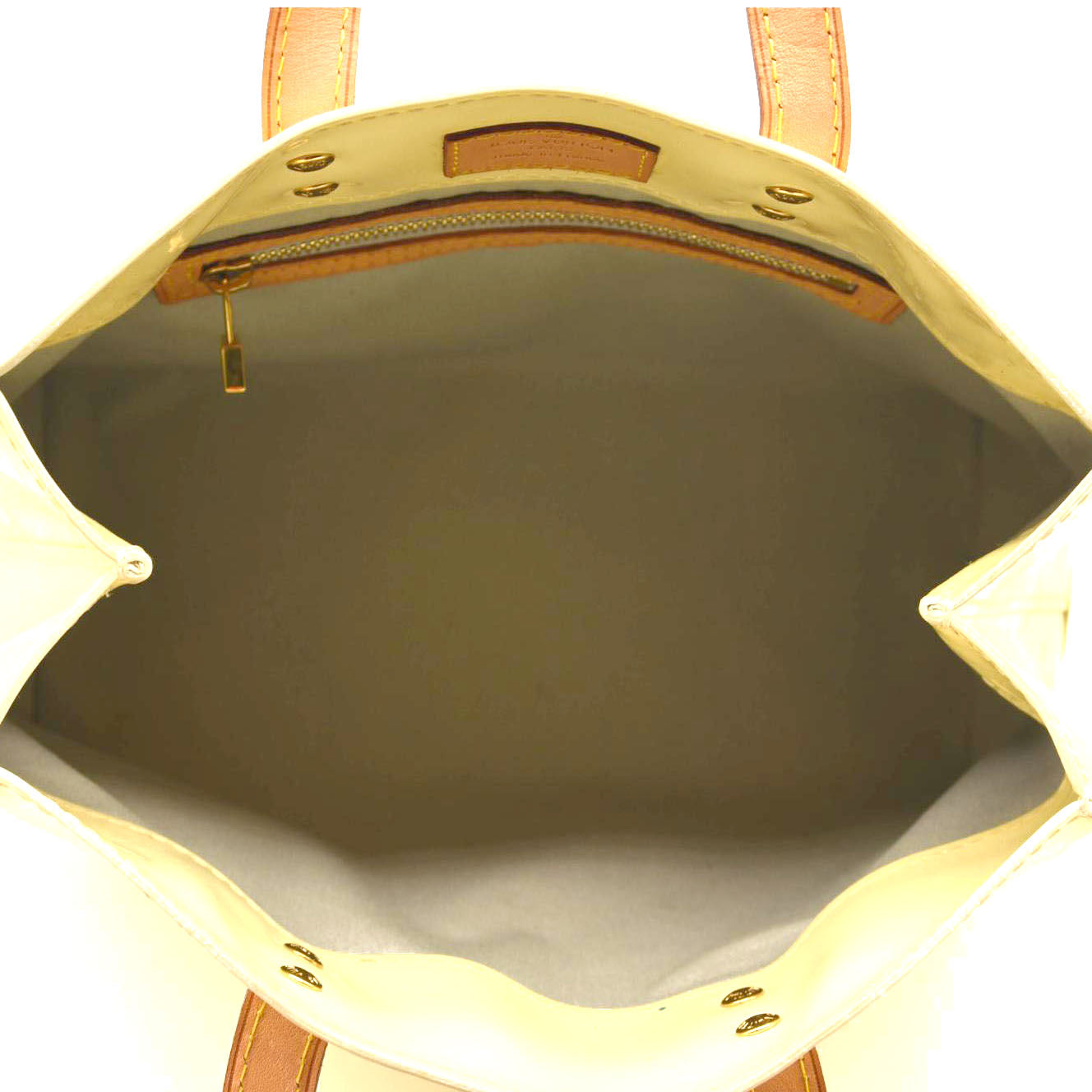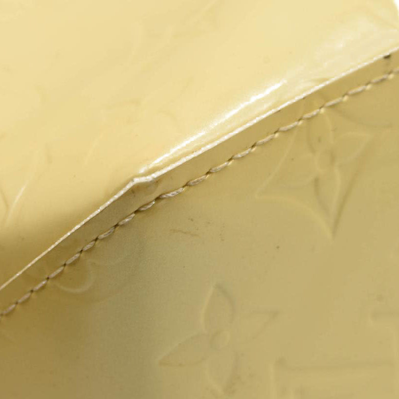 This is an authentic LOUIS VUITTON Vernis Reade PM in Beige. This stylish handbag is crafted of Louis Vuitton monogram embossed vernis patent leather. The bag features vachetta cowhide leather strap top handles, and opens to a grey fabric interior with a zipper pocket.