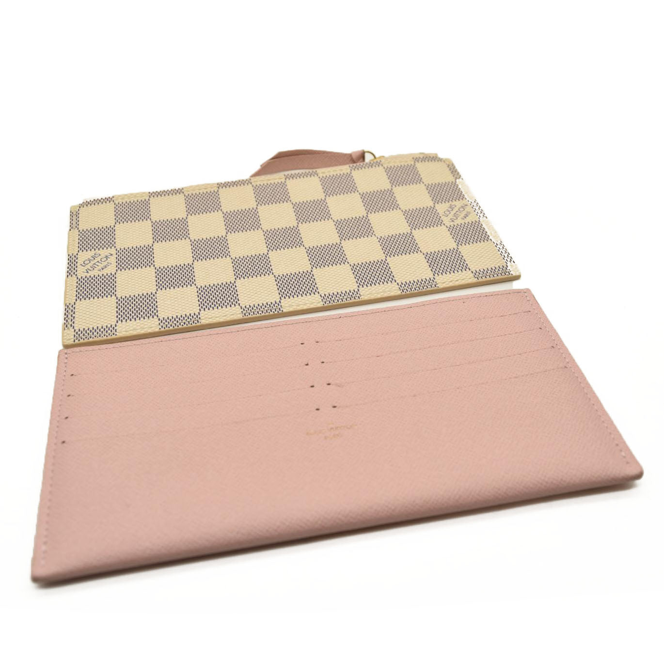 This is an authentic LOUIS VUITTON Damier Azur Pochette Felicie Chain Wallet in Rose Ballerine. This stylish wallet is crafted of classic Louis Vuitton Damier white and blue-coated canvas. The wallet features a structured base and an envelope style front-facing flap opens with a gold snap to a light pink fabric interior with a patch pocket and two removable inserts.