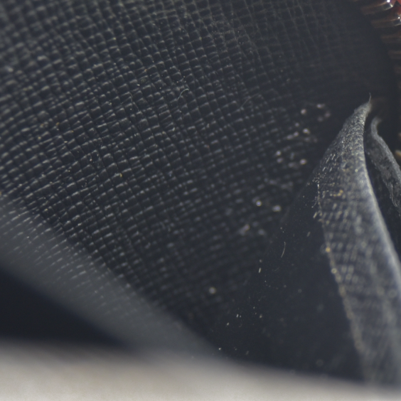The exterior is rubbed with scratches. There are loose stitches around the folding area. There are rubbed marks on the inside.