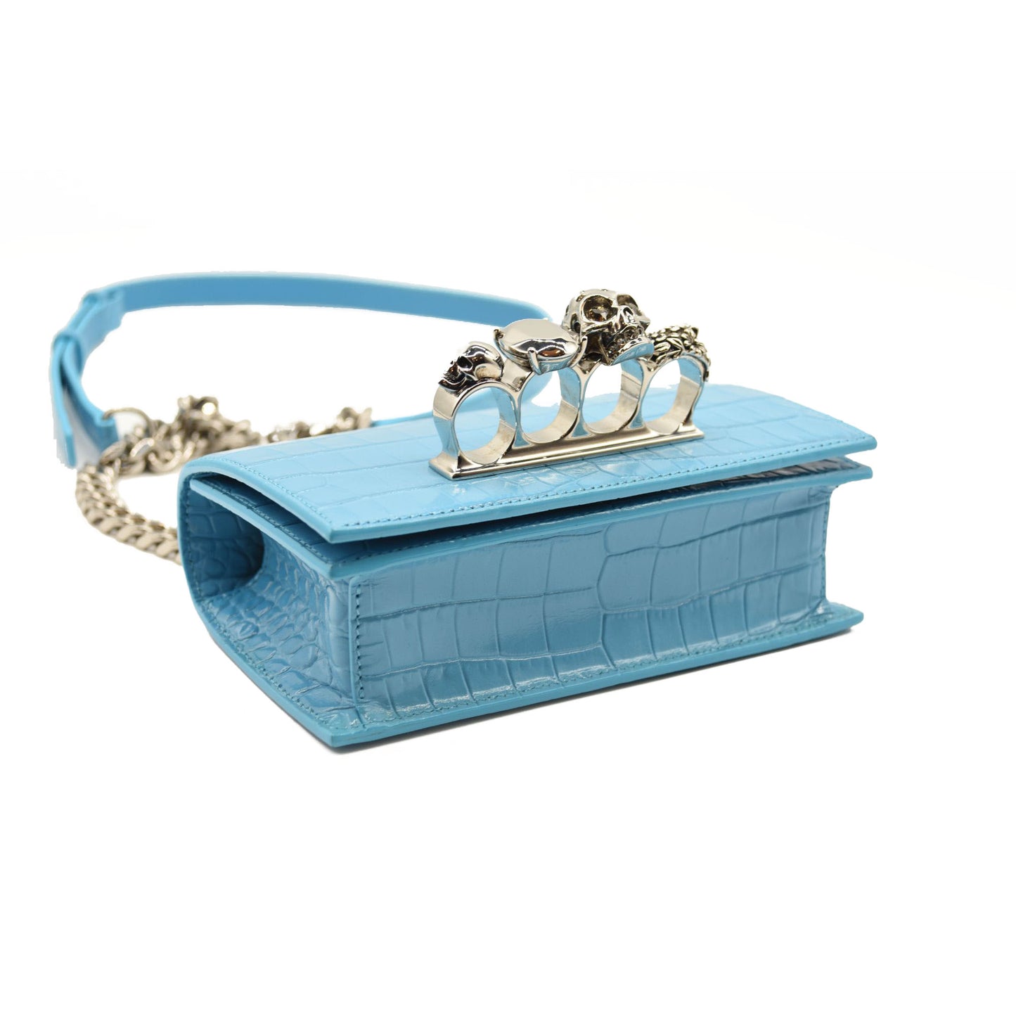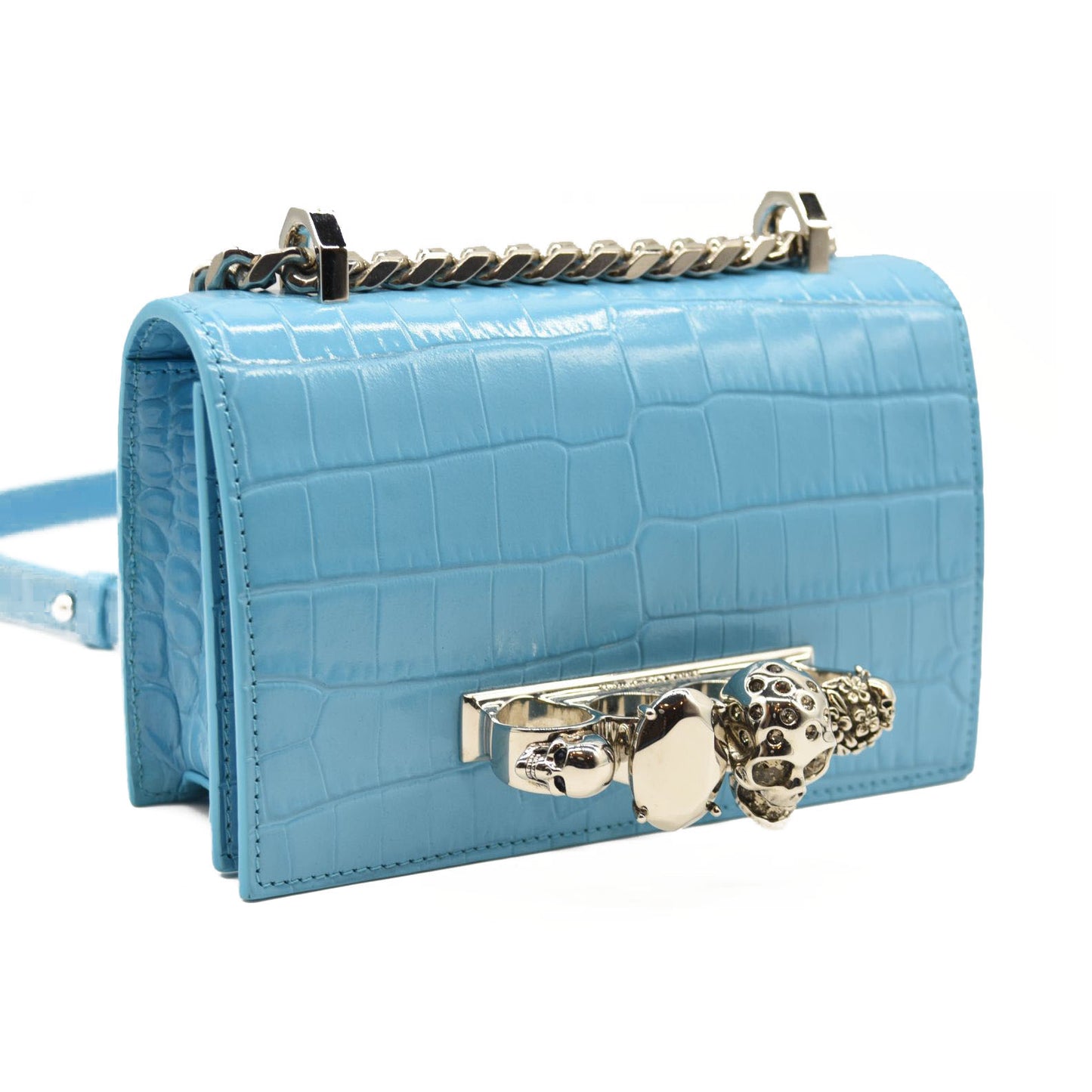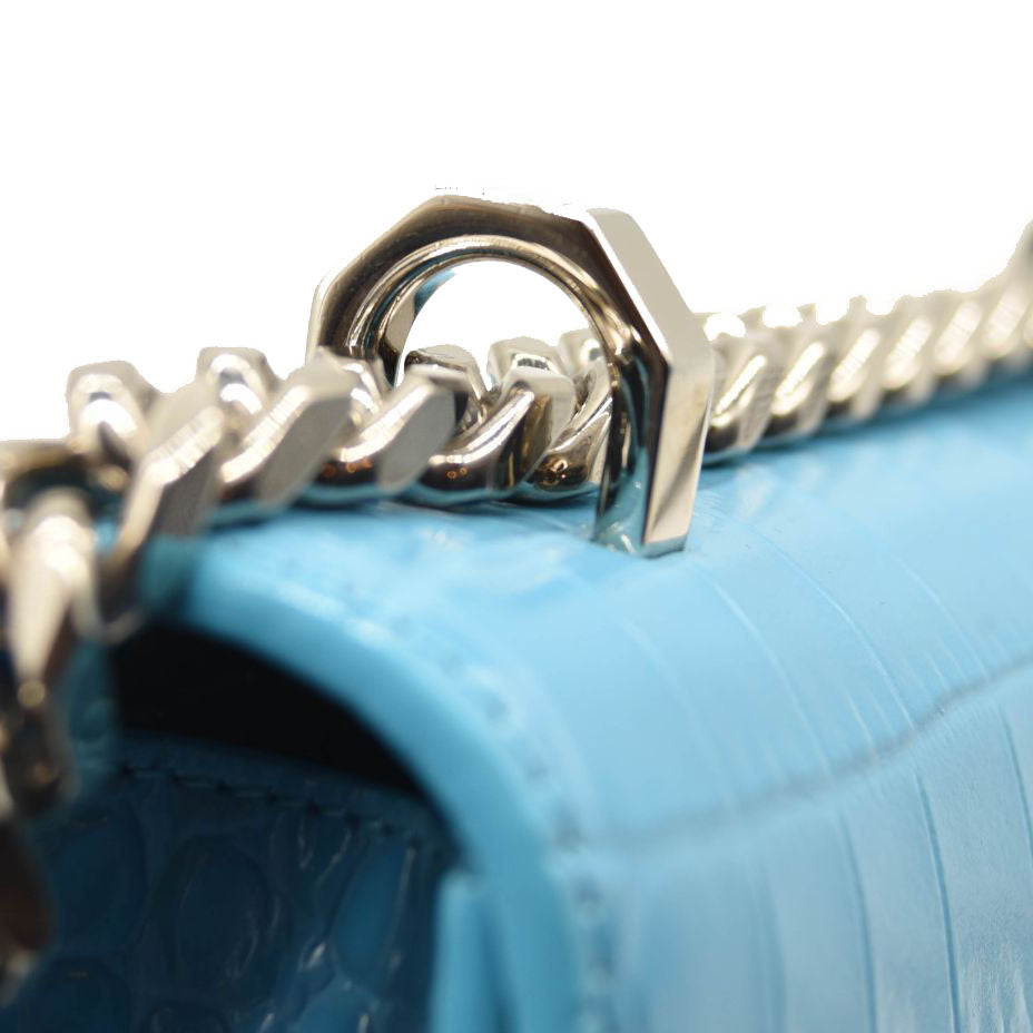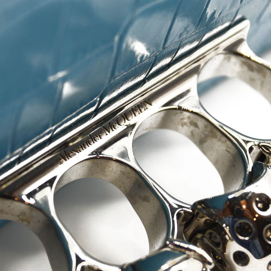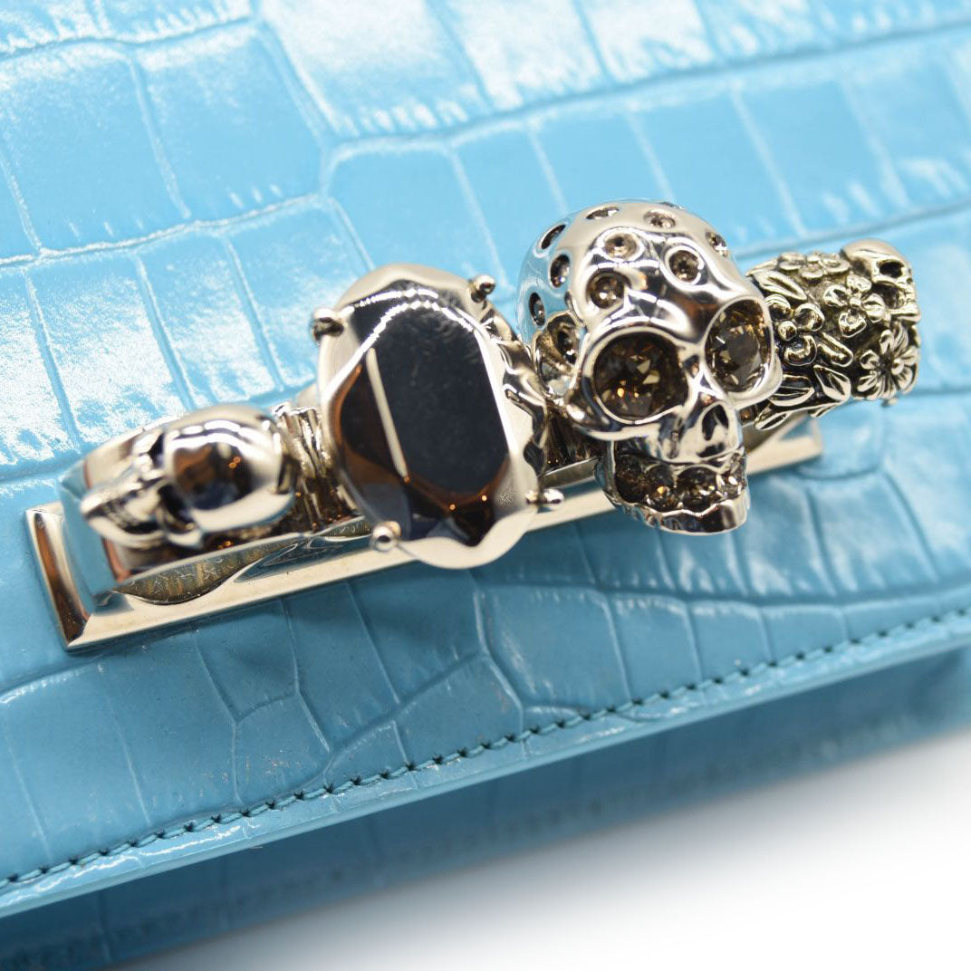 This is an authentic ALEXANDER MCQUEEN Shiny Crocodile Embossed Jeweled Satchel in Blue. This chic shoulder bag is crafted of crocodile embossed calfskin in blue. The bag features a polished silver chain shoulder strap with a smooth leather shoulder pad and the front flap features the signature Alexander McQueen skeletal knuckle embellishments.