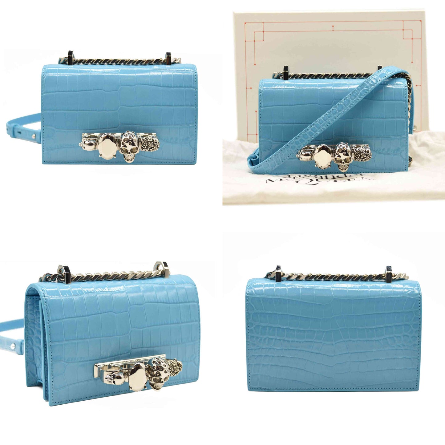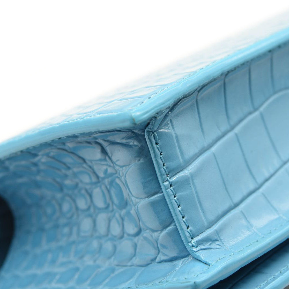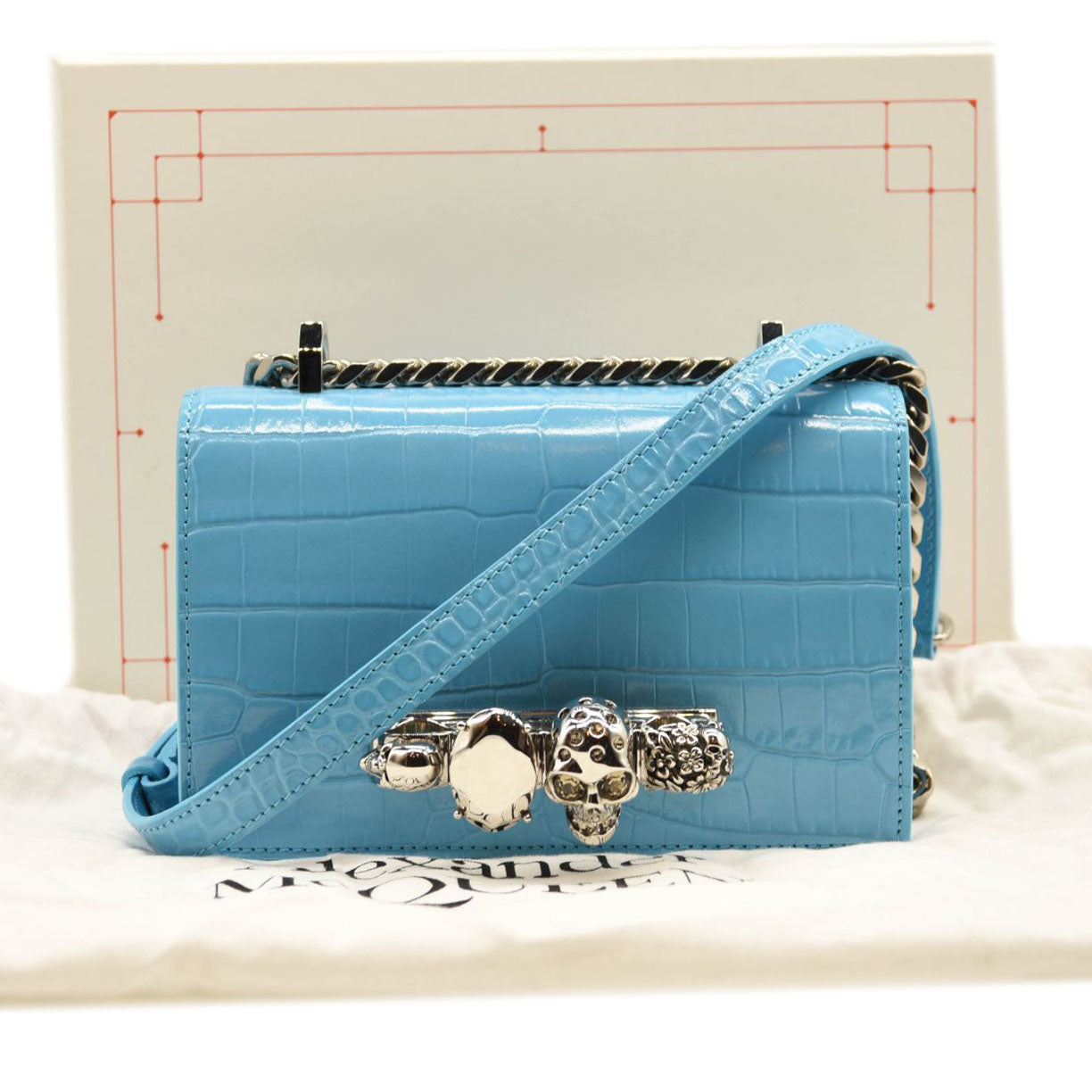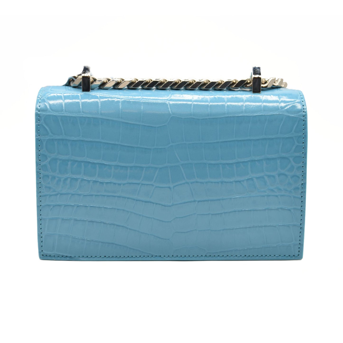 This is an authentic ALEXANDER MCQUEEN Shiny Crocodile Embossed Jeweled Satchel in Blue. This chic shoulder bag is crafted of crocodile embossed calfskin in blue. The bag features a polished silver chain shoulder strap with a smooth leather shoulder pad and the front flap features the signature Alexander McQueen skeletal knuckle embellishments.