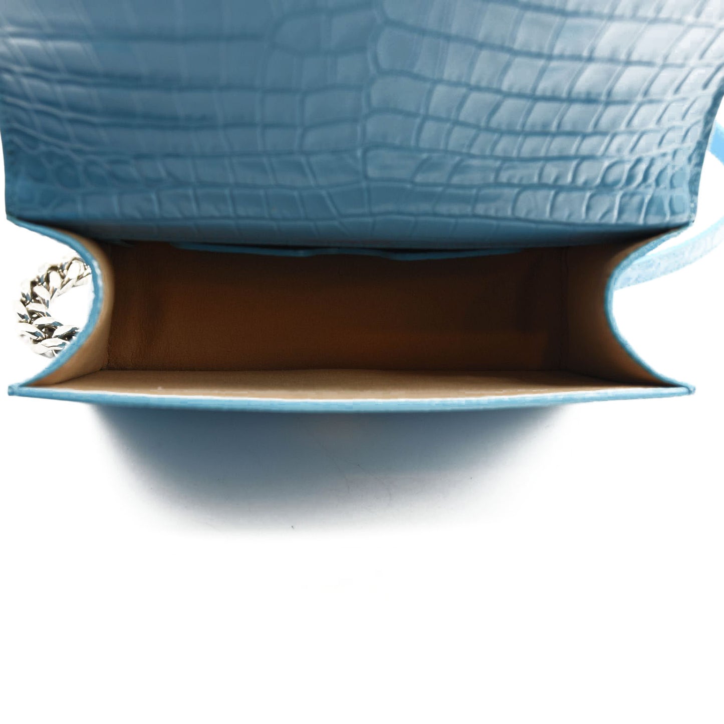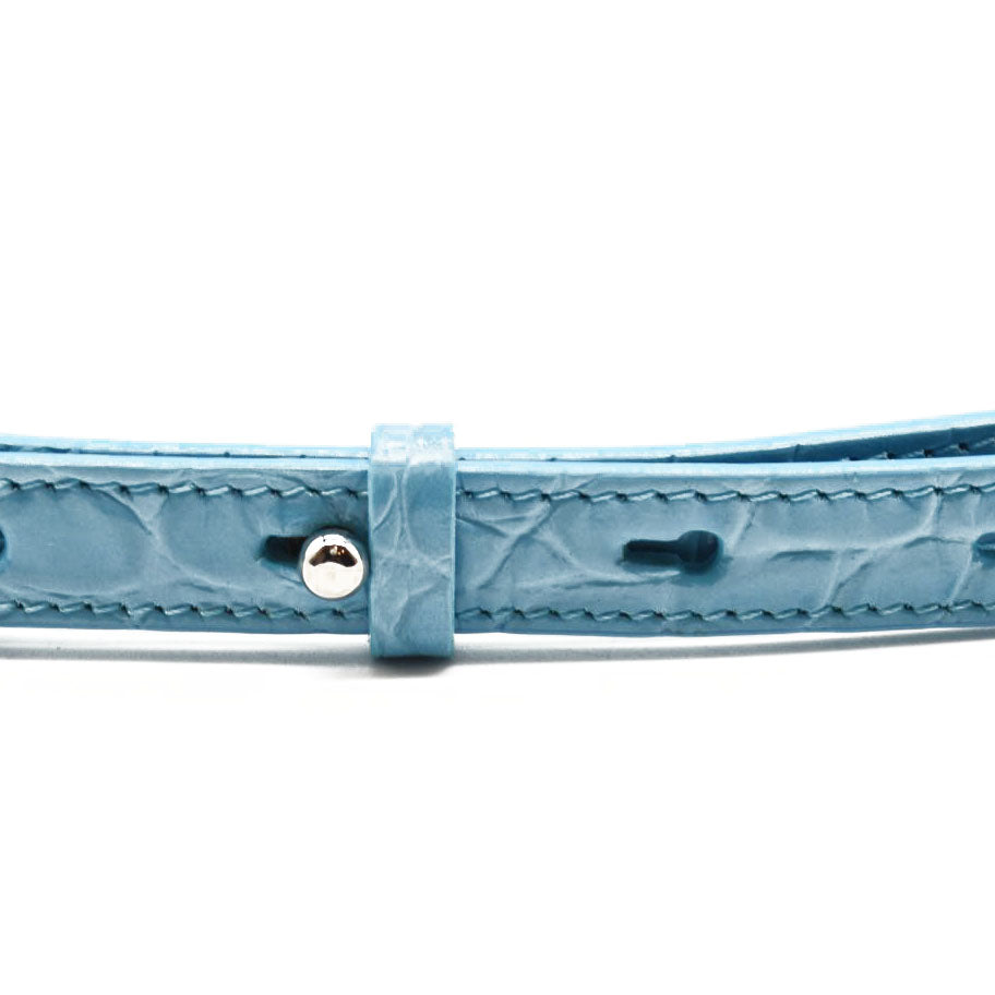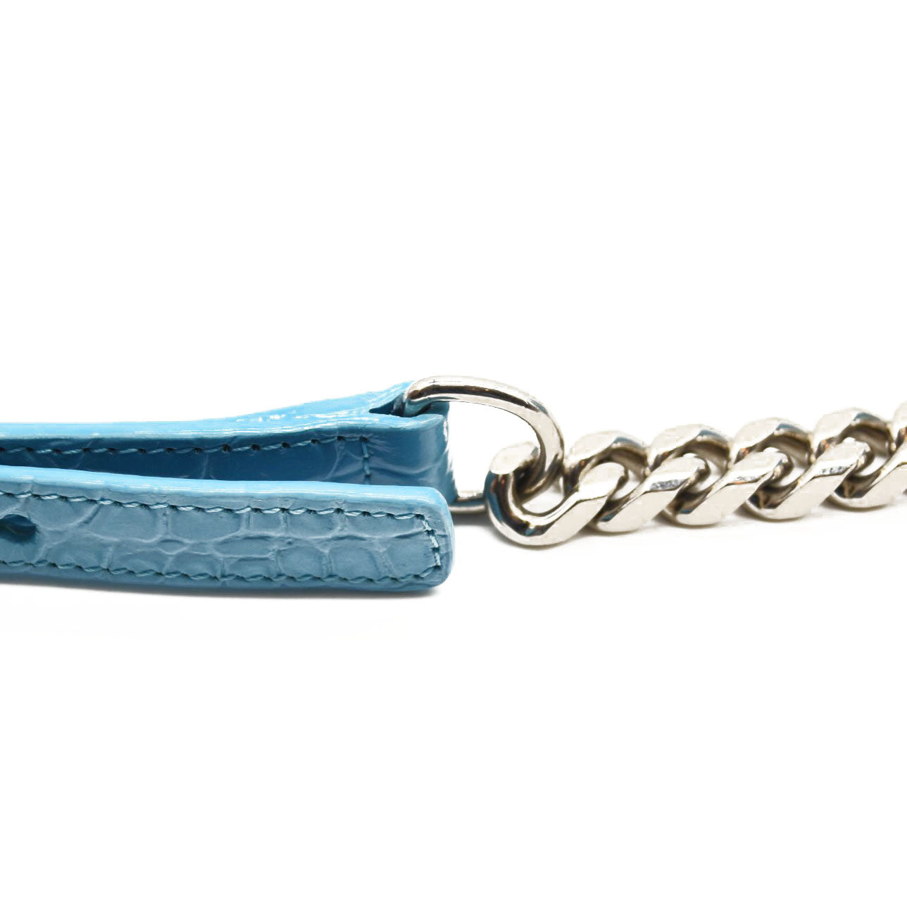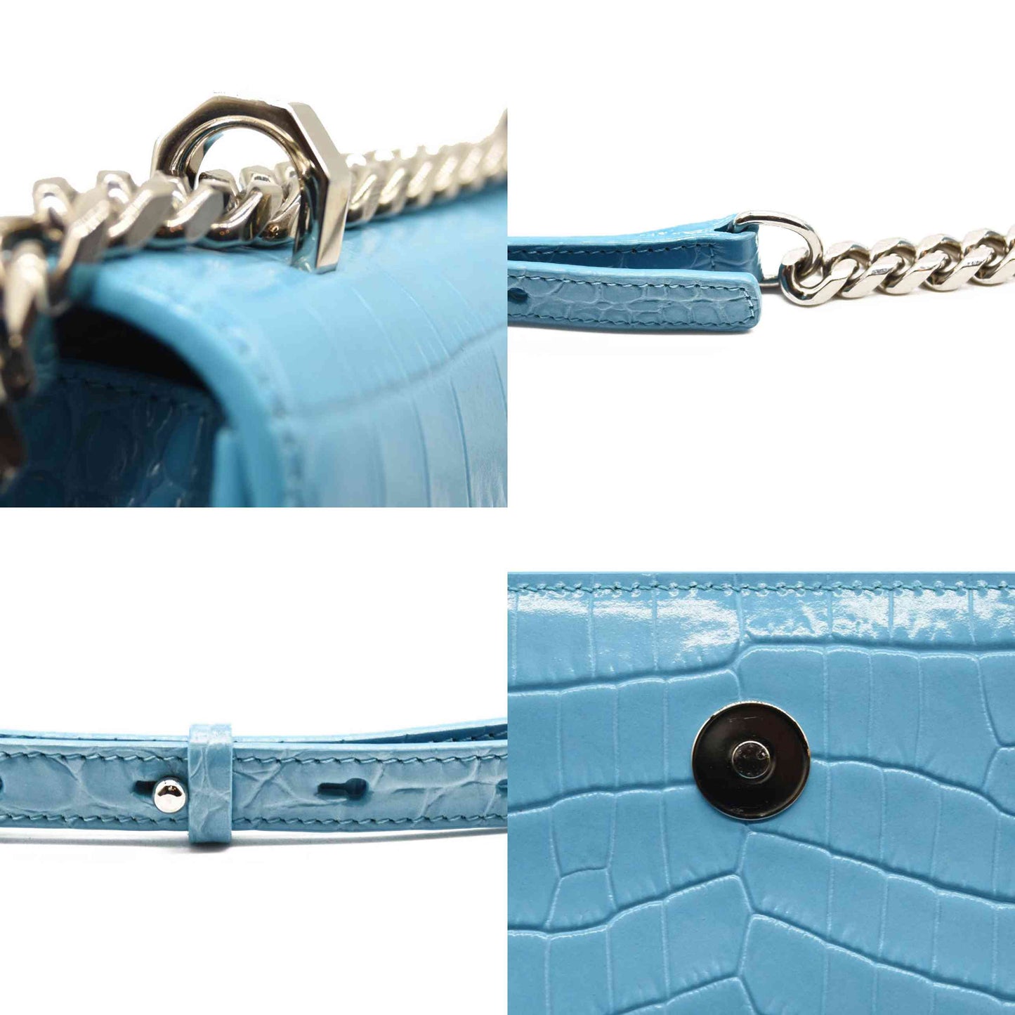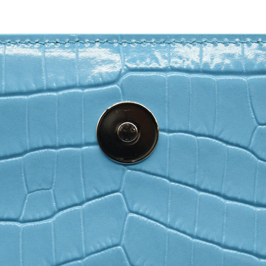 This is an authentic ALEXANDER MCQUEEN Shiny Crocodile Embossed Jeweled Satchel in Blue. This chic shoulder bag is crafted of crocodile embossed calfskin in blue. The bag features a polished silver chain shoulder strap with a smooth leather shoulder pad and the front flap features the signature Alexander McQueen skeletal knuckle embellishments.