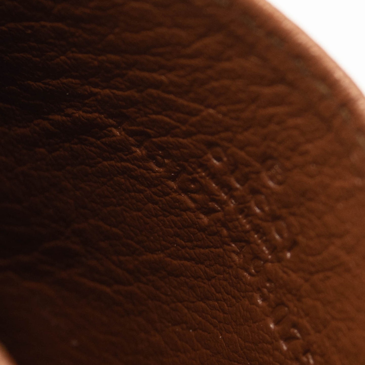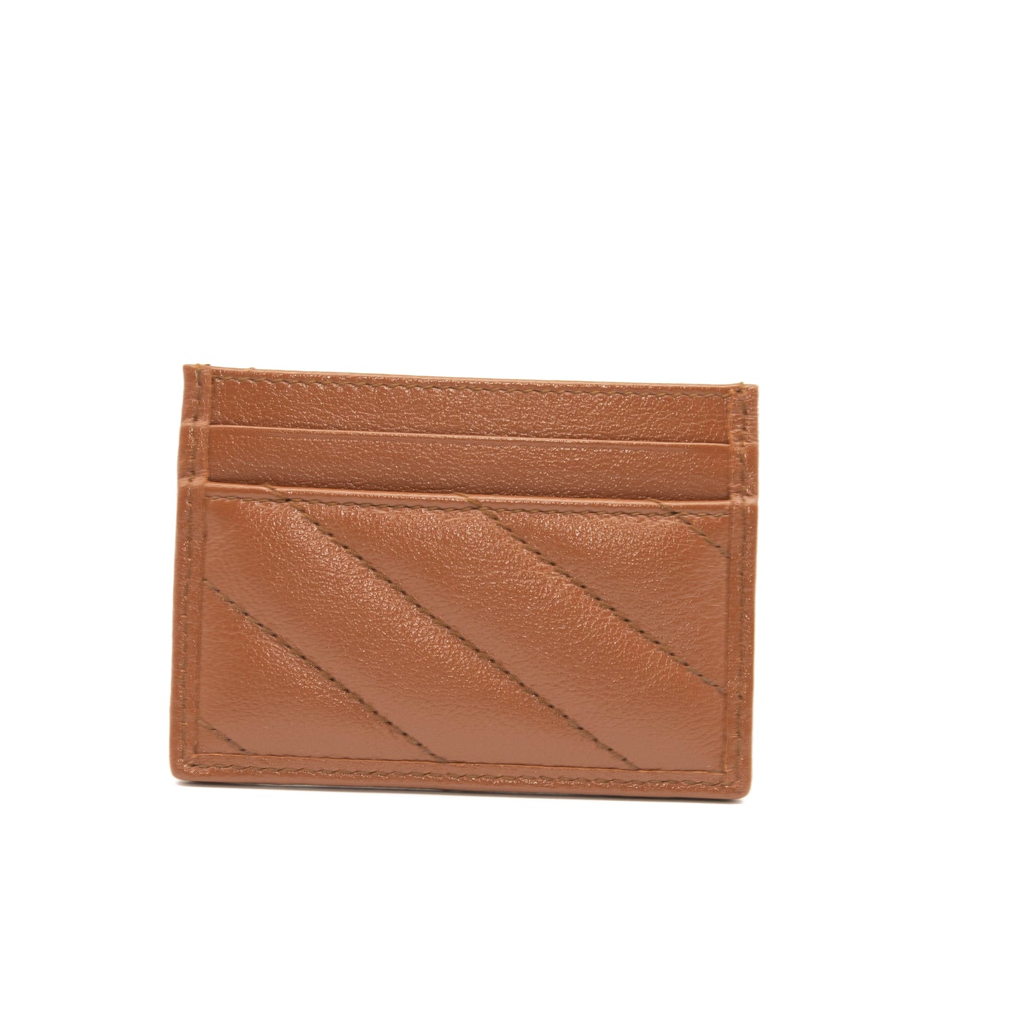 Quilted leather card holder in brown. Logo plaque at face. Four card slots and one note slot. Tonal leather lining. Antiqued gold-tone hardware. Approx. 4" length x 3" height.