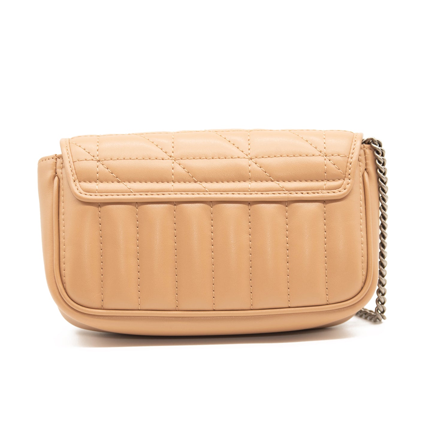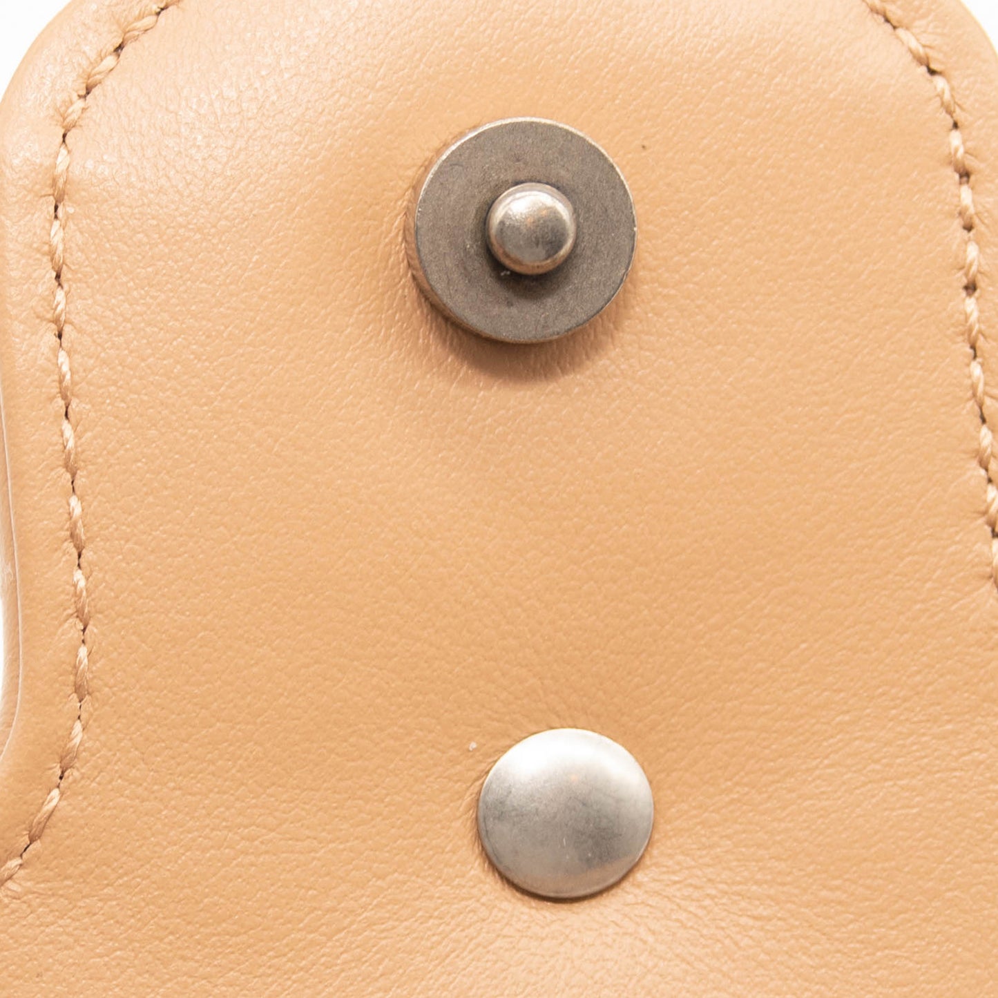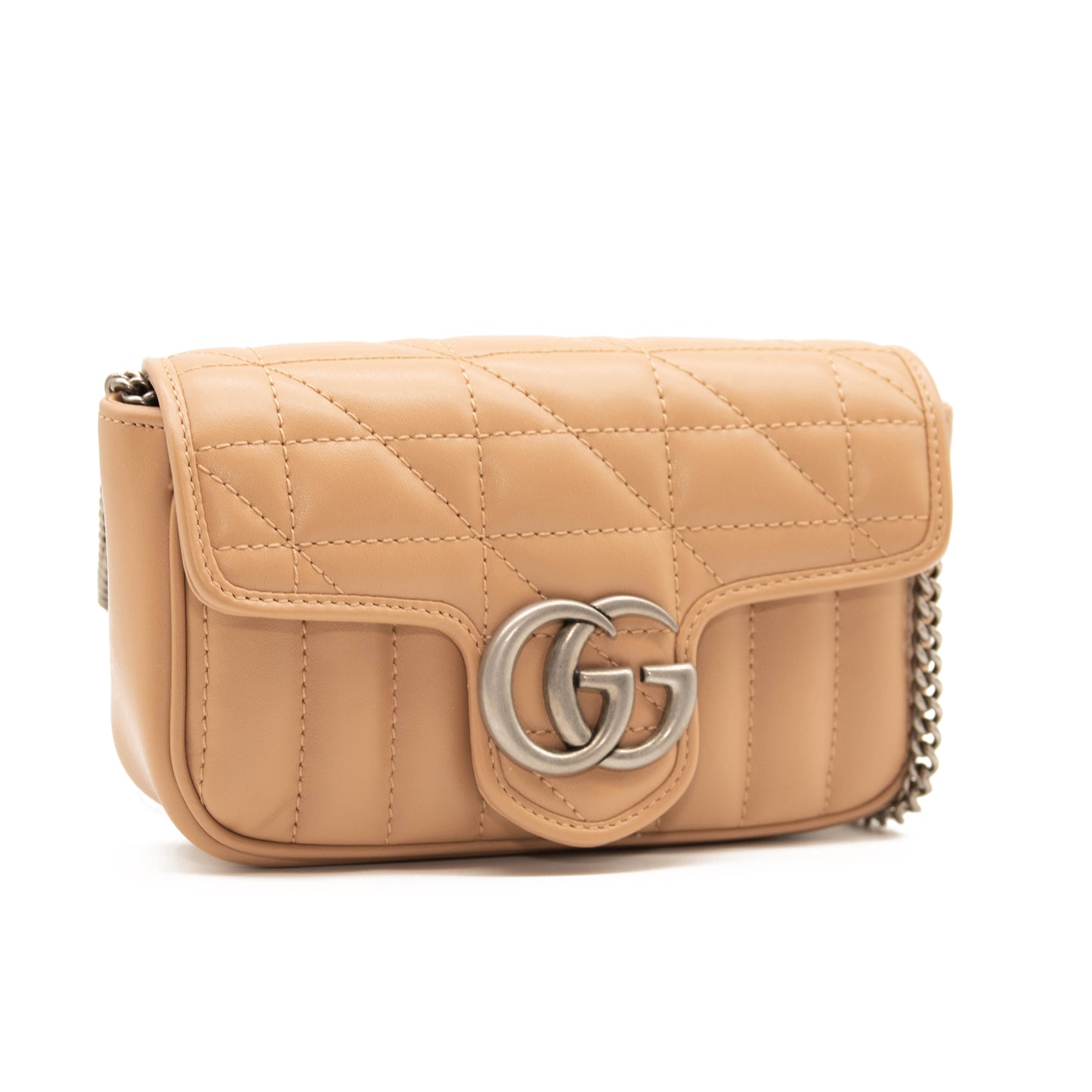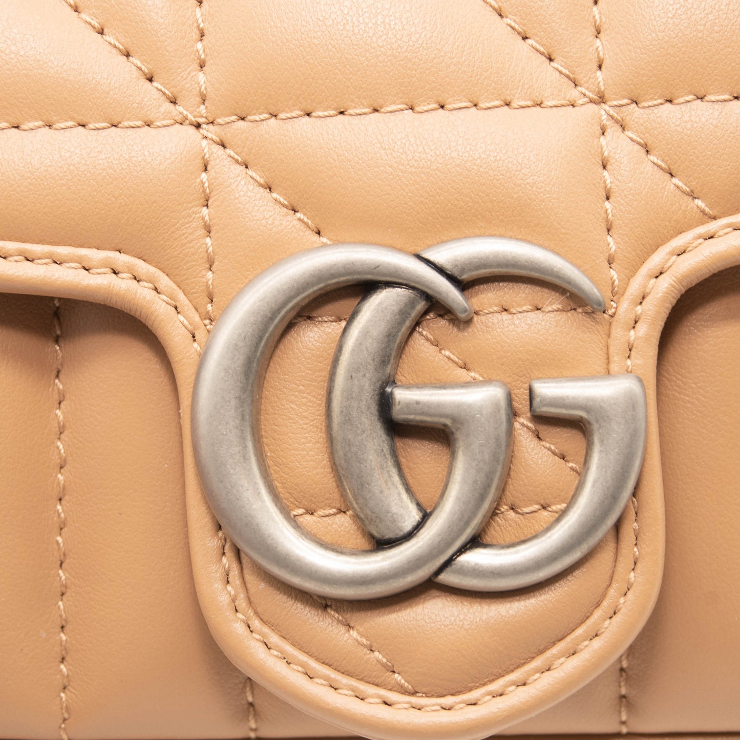 Super mini versions of emblematic accessories channel the House's whimsical narrative. Synonymous with its monogram hardware and matelasse finish, this shoulder bag plays with the GG Marmont's signature elements with a new take on the recognizable quilted design that mixes diagonal and vertical motifs. Appearing since the '70s, the Double G is showcased in an antique silver tone against rose beige leather.