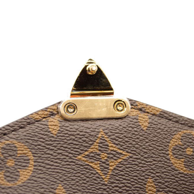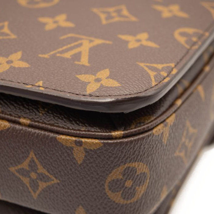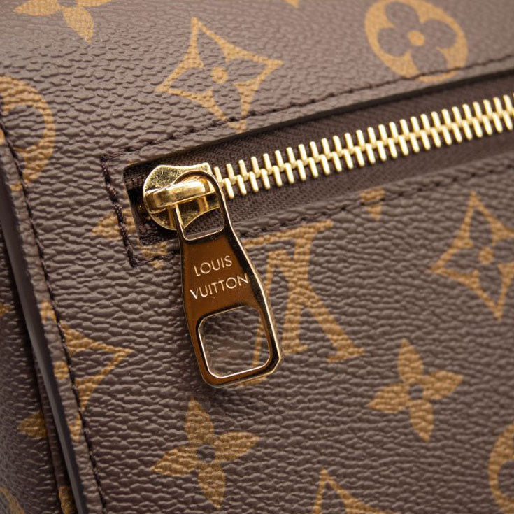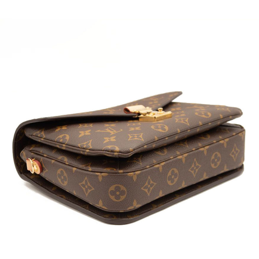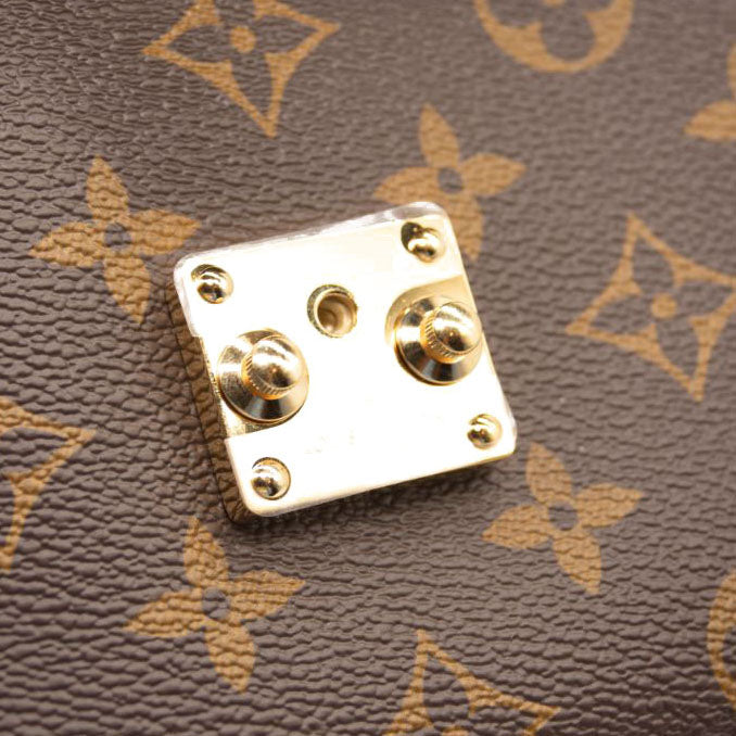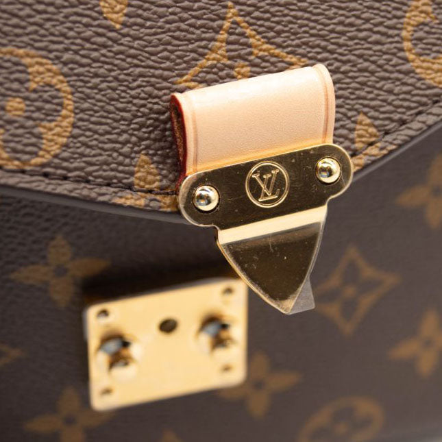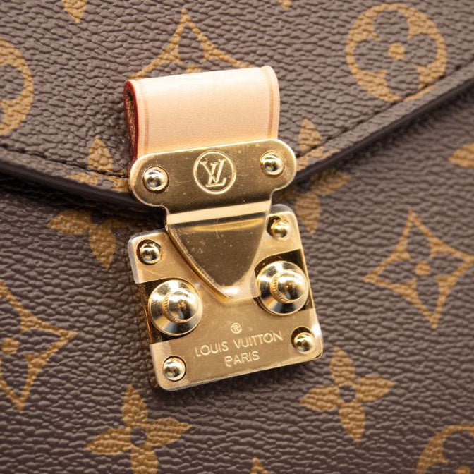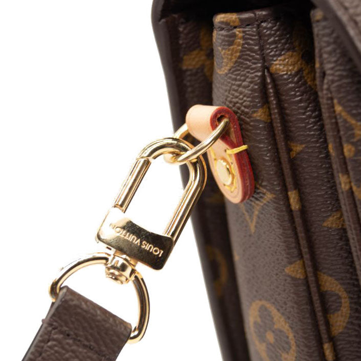 This is an authentic LOUIS VUITTON Monogram Pochette Metis. This chic handbag is finely crafted of classic Louis Vuitton monogram toile canvas. The bag features a vachetta cowhide leather top handle and a rear zipper pocket. The envelope-style crossover flap opens with a polished brass S-lock to a partitioned brown microfiber interior.