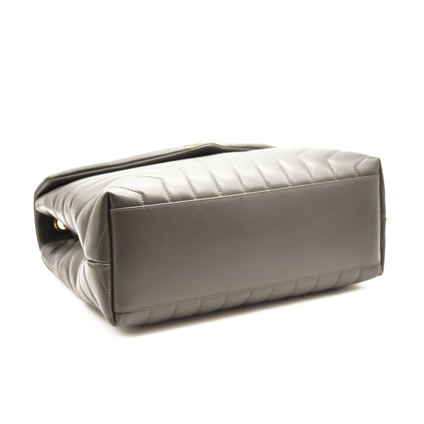 This is an authentic SAINT LAURENT Calfskin Y Quilted Monogram Medium Loulou Chain Satchel in Storm. This elegant shoulder bag is crafted of chevron-quilted calfskin leather in gray. The bag features gold chain-link shoulder straps with leather shoulder pads and a matching brass YSL monogram detail on the crossover flap. The bag opens with a magnetic snap to a partitioned black fabric interior with pockets.