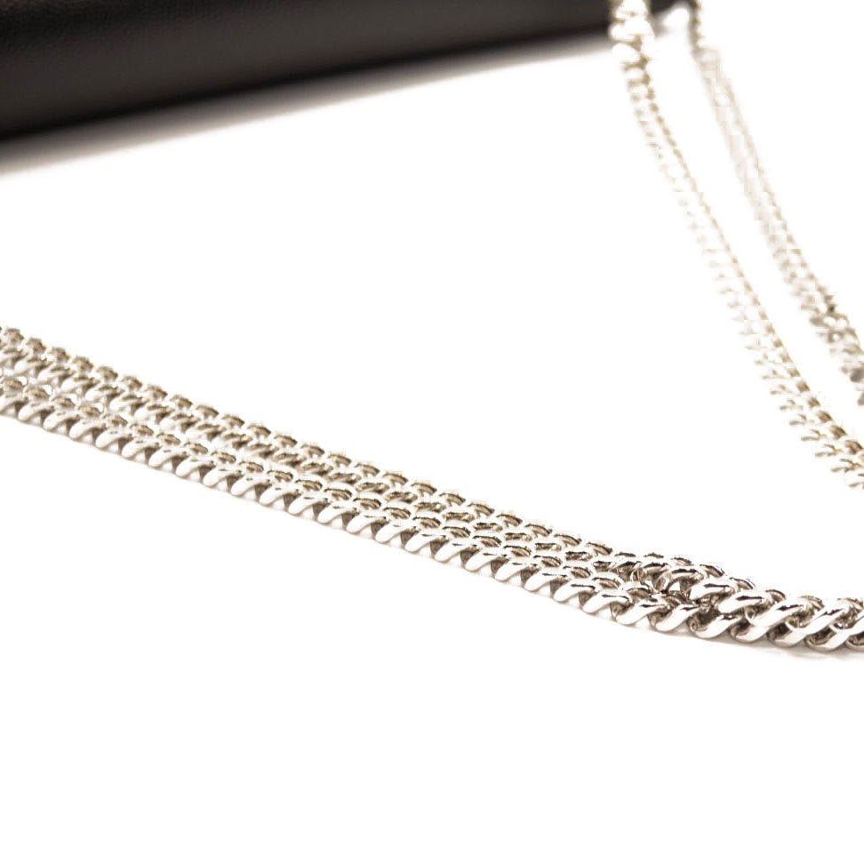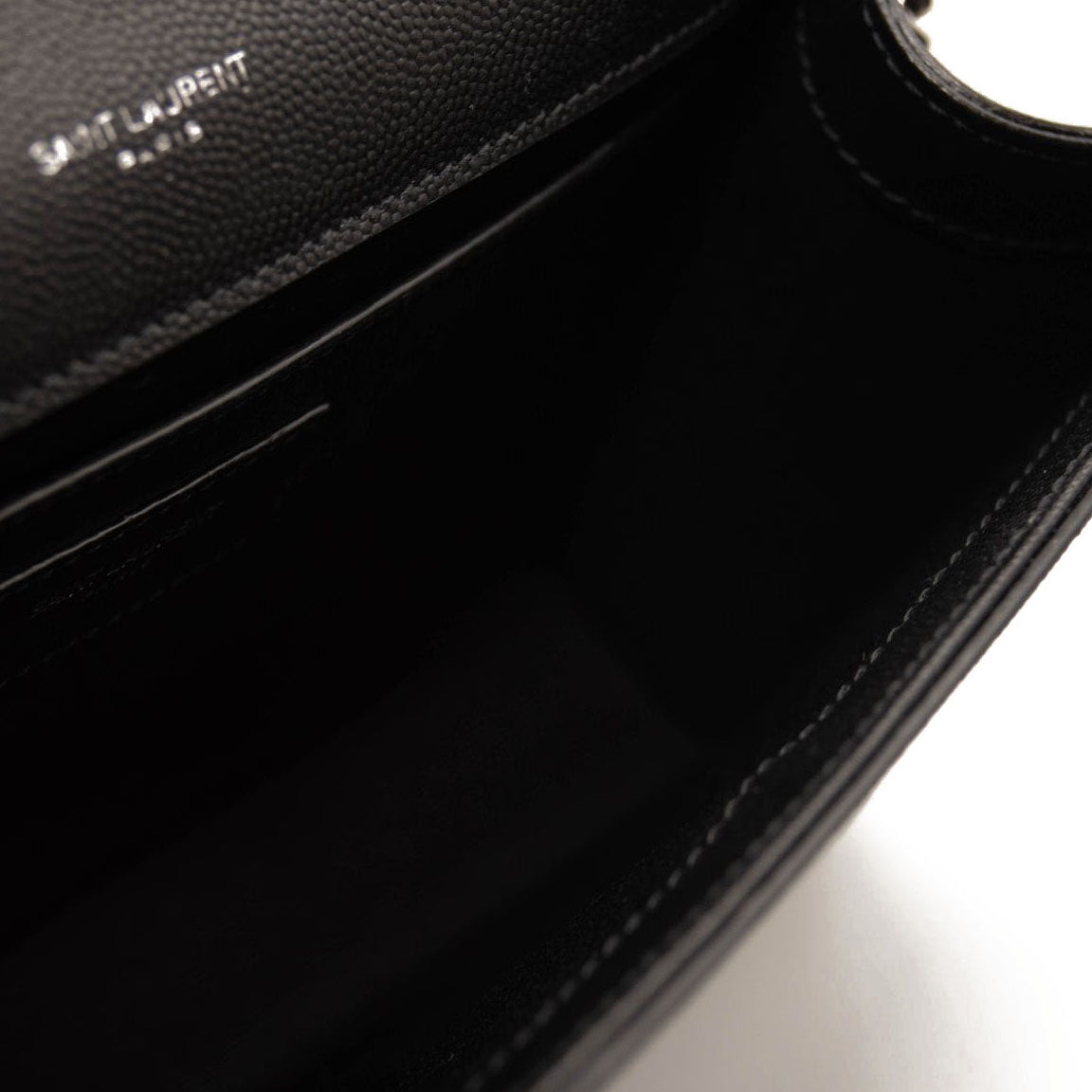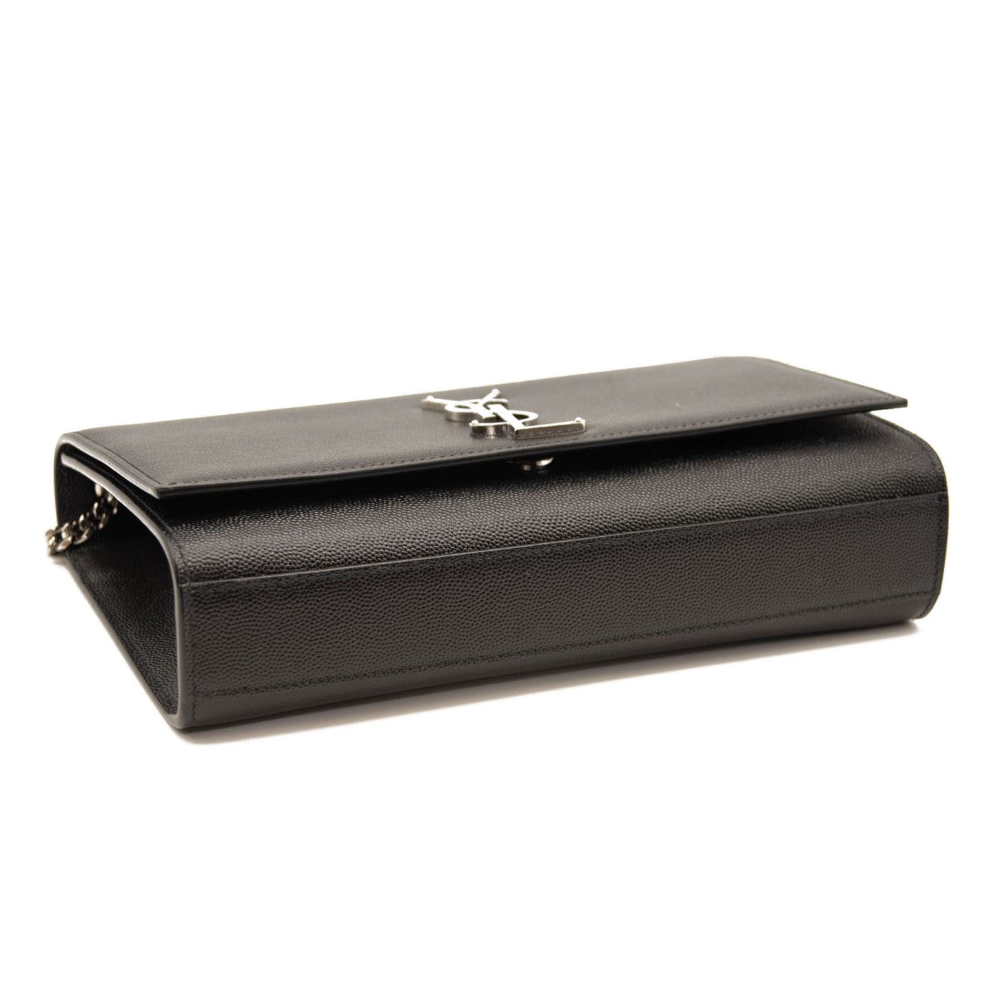 This is an authentic SAINT LAURENT Grain De Poudre Medium Classic Monogram Kate Satchel in Black. This stylish shoulder bag is crafted of finely textured calfskin leather in black. The bag features a silver chain-link shoulder strap and a matching YSL logo on the front. The crossover flap opens to a black fabric interior with a small patch pocket.