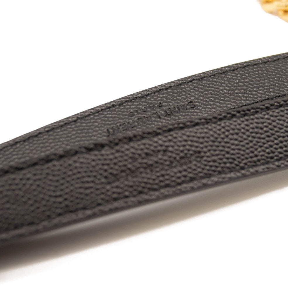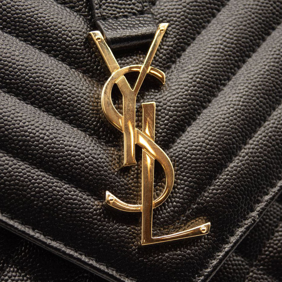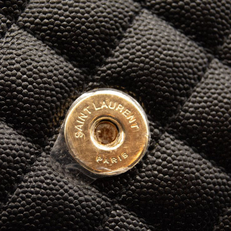 This is an authentic SAINT LAURENT Grain De Poudre Textured Mixed Matelasse Triquilt Medium Monogram Satchel in Black. This elegant shoulder bag is crafted of grained calfskin leather in black. The bag features a large exterior flat pocket, gold chain-link shoulder straps with leather shoulder pads and an envelope style flap with a gold YSL monogram closure. This opens with a magnetic snap to a black fabric interior with a patch pocket.