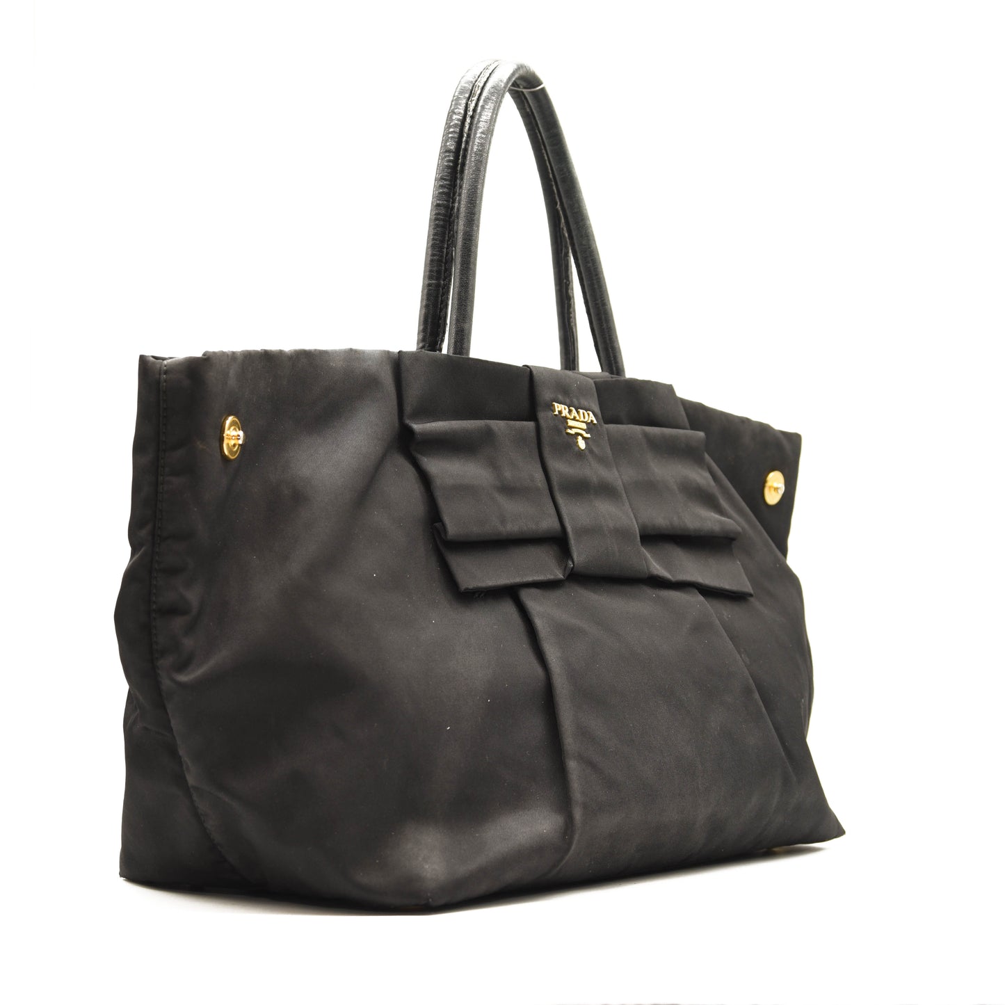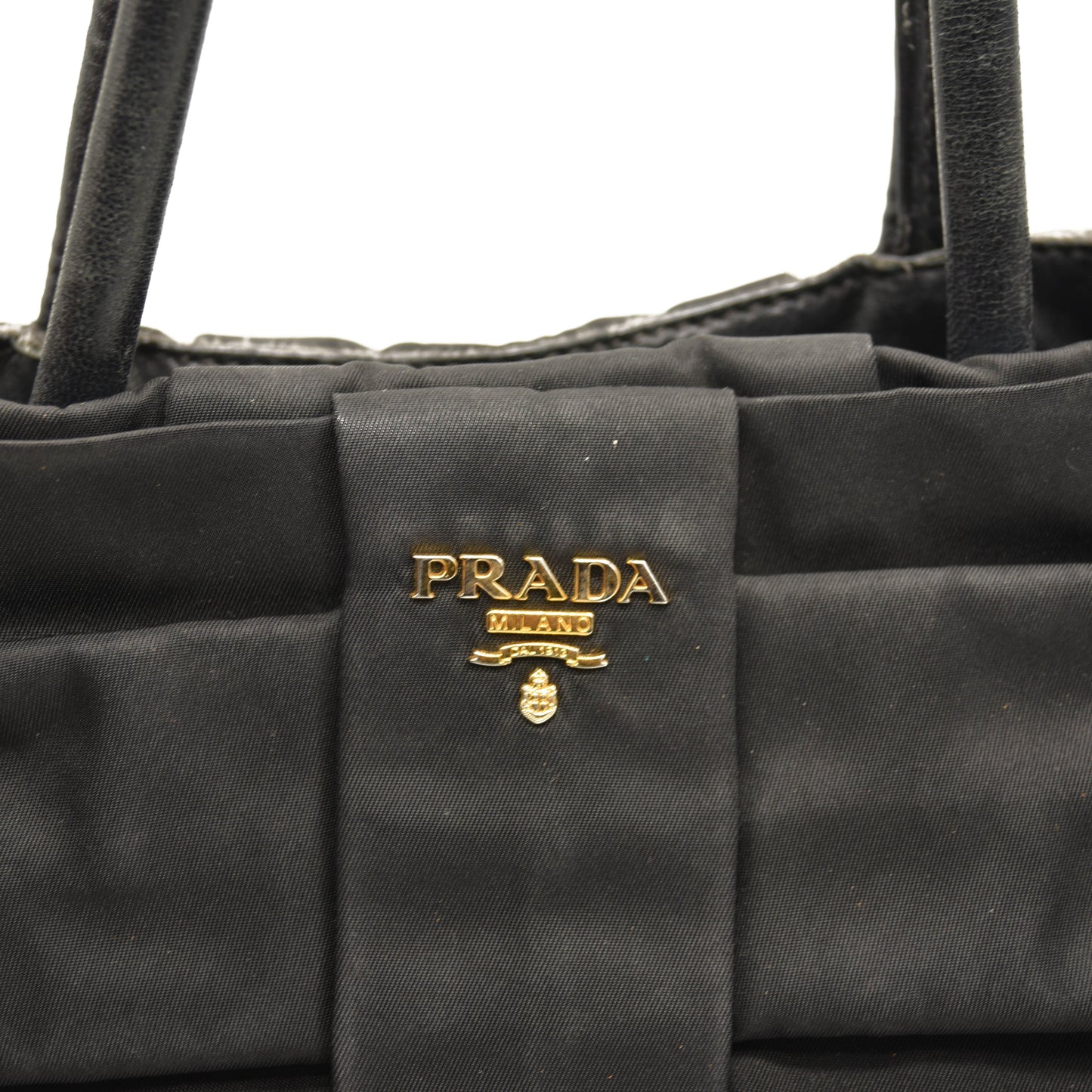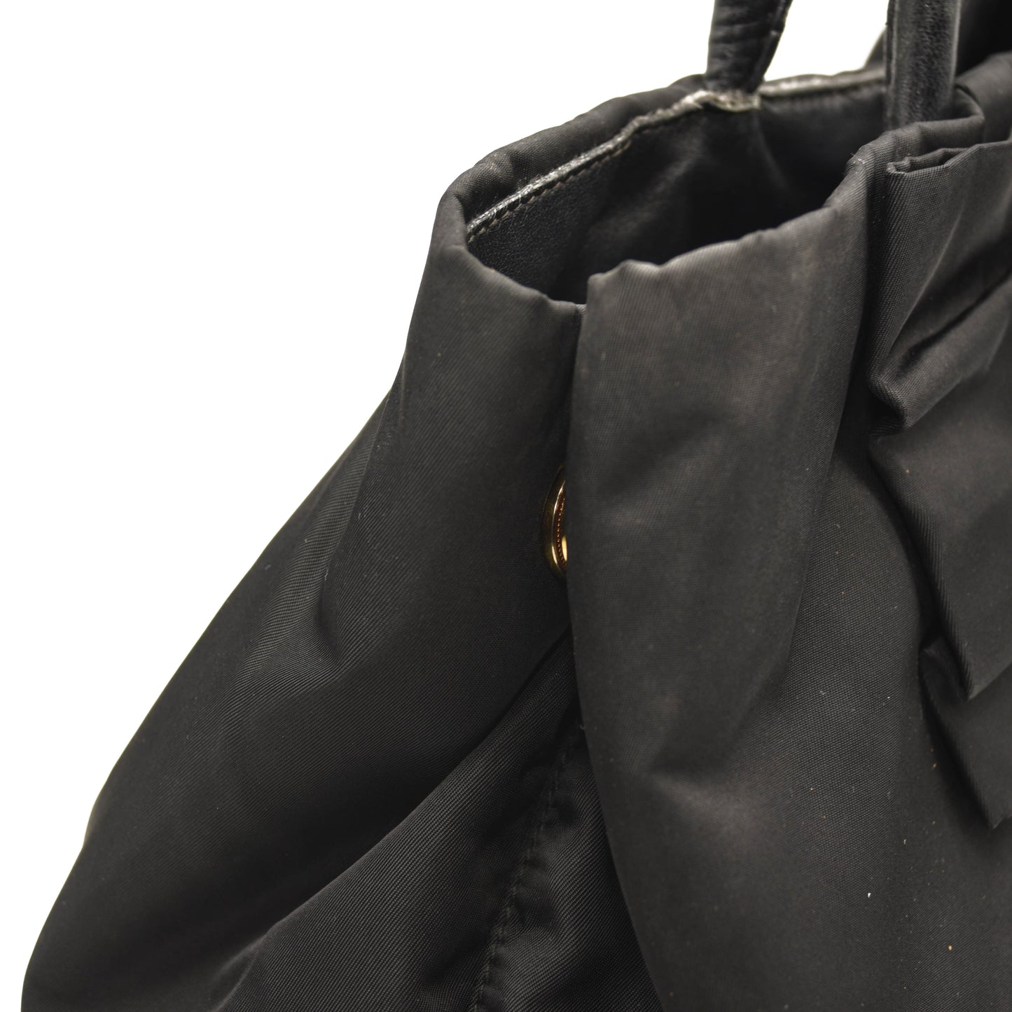 This is an authentic PRADA Tessuto Fiocco Bow Tote Black. This chic satchel is crafted of fine pleated nappa calfskin leather. The bag features rolled leather top handles, a leather shoulder strap with silver clasps, and a top zipper. This top zipper opens to a Prada monogram fabric interior. This is a marvelous tote that is ideal for everyday use, only from Prada!