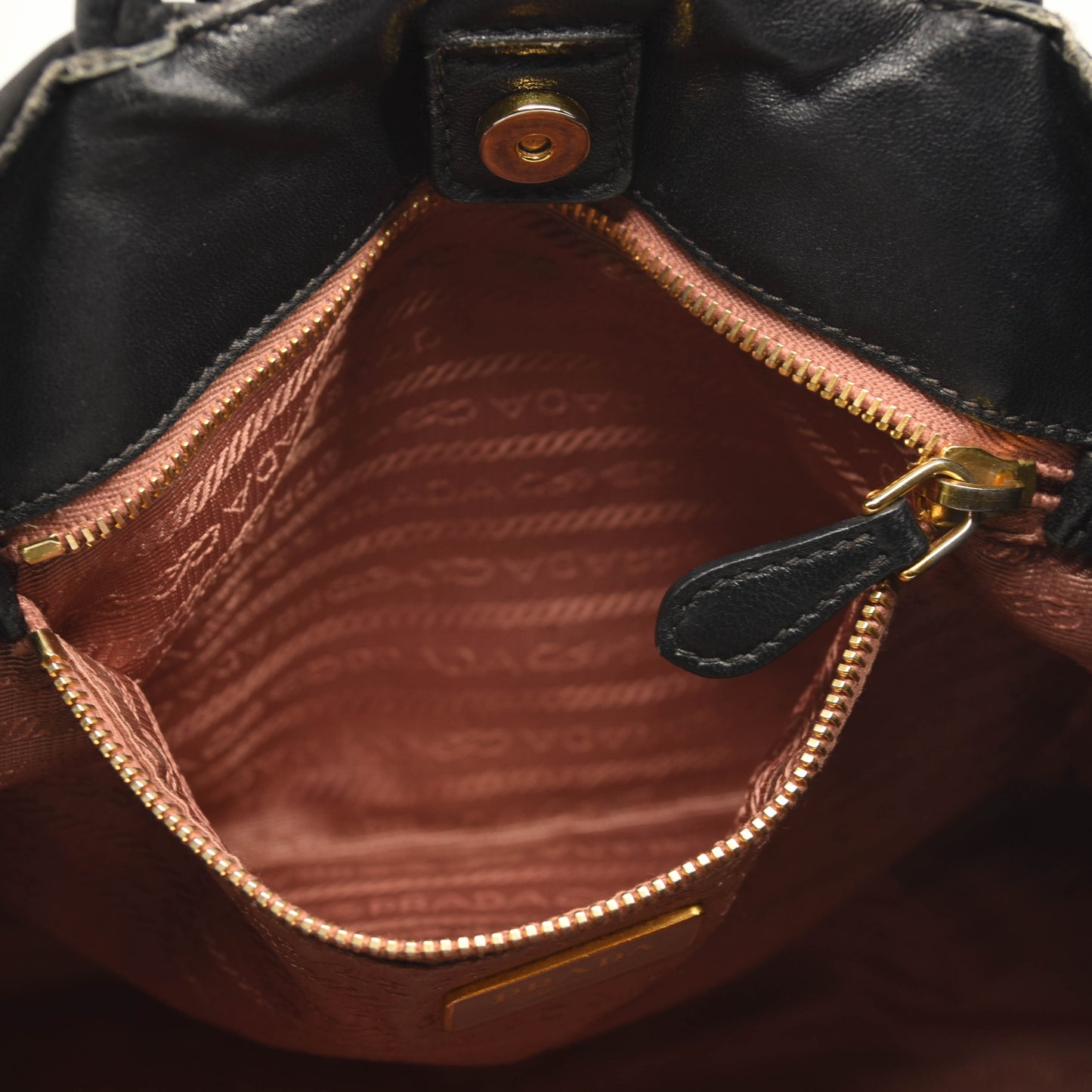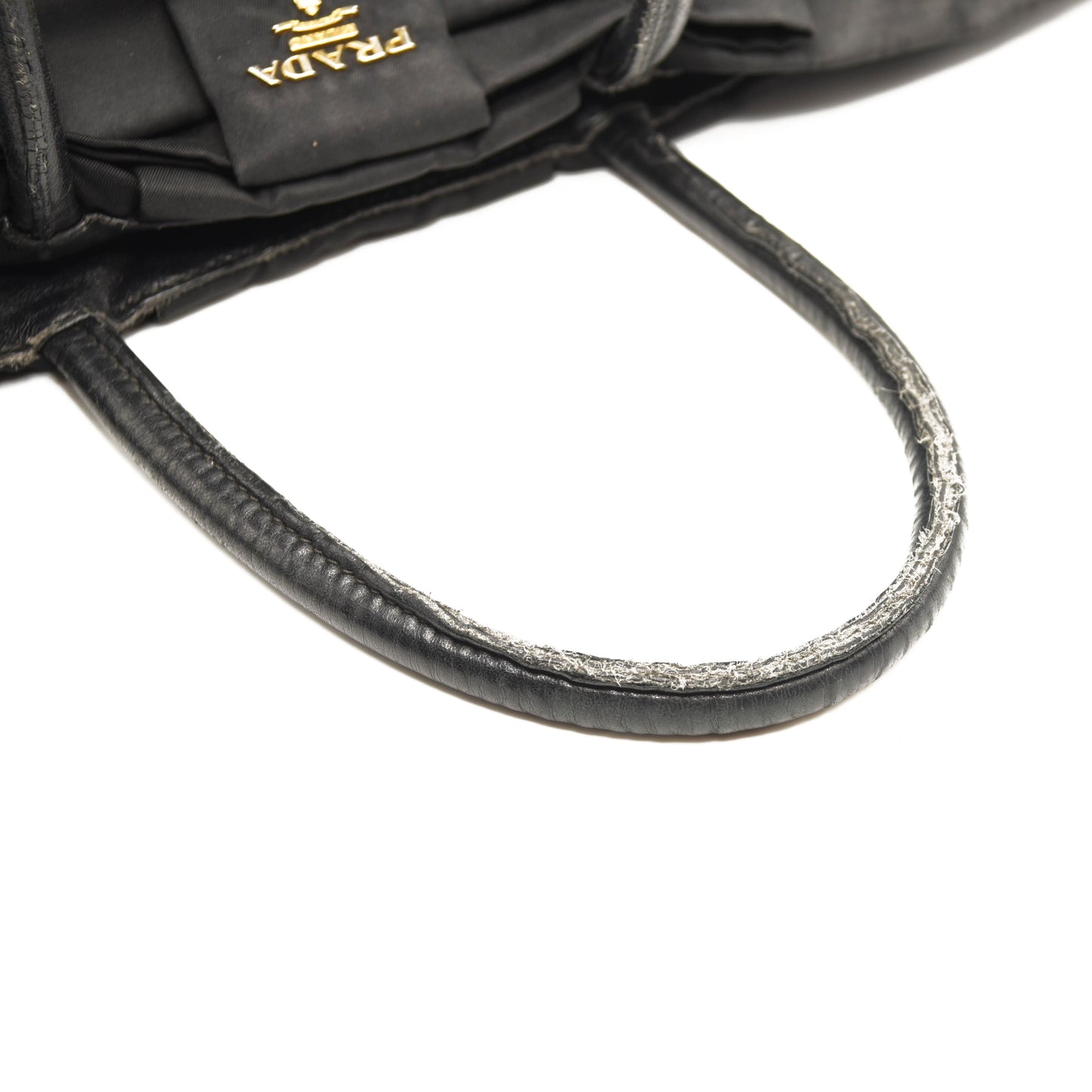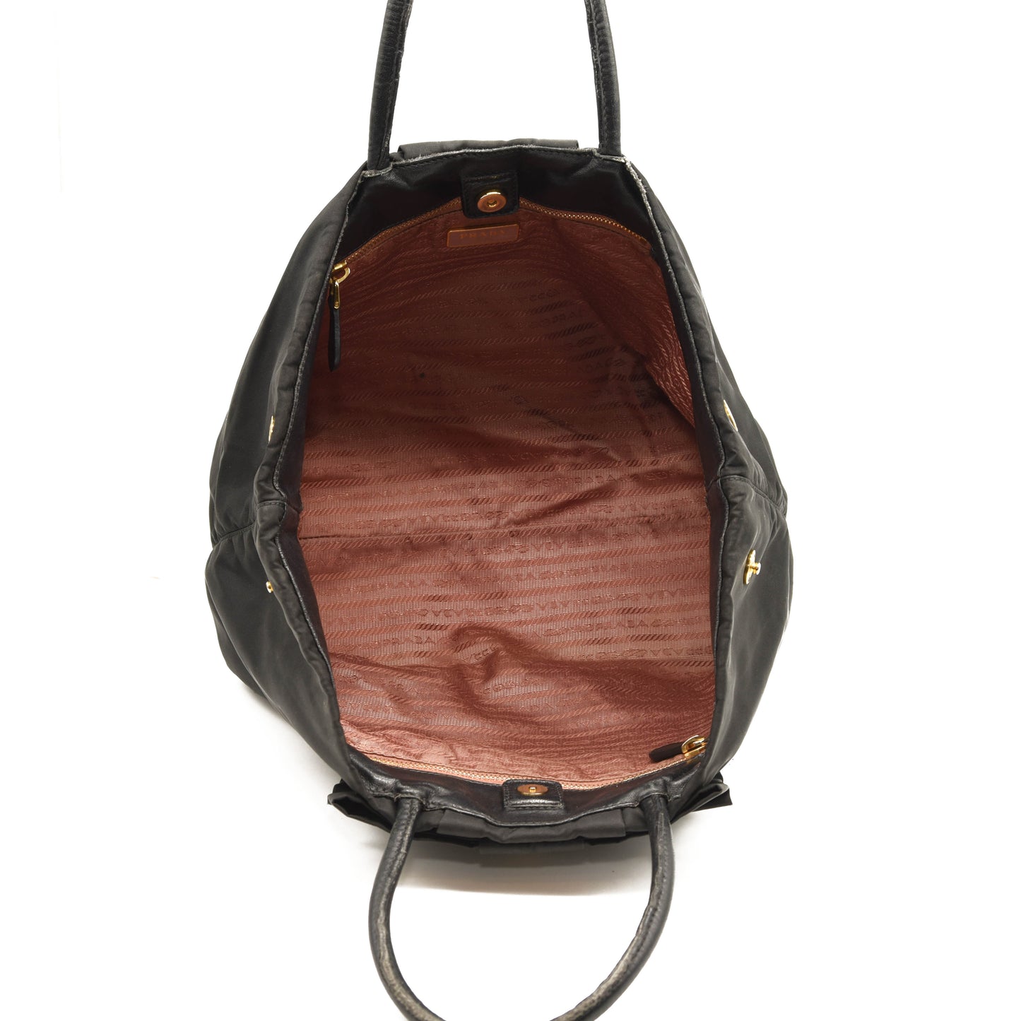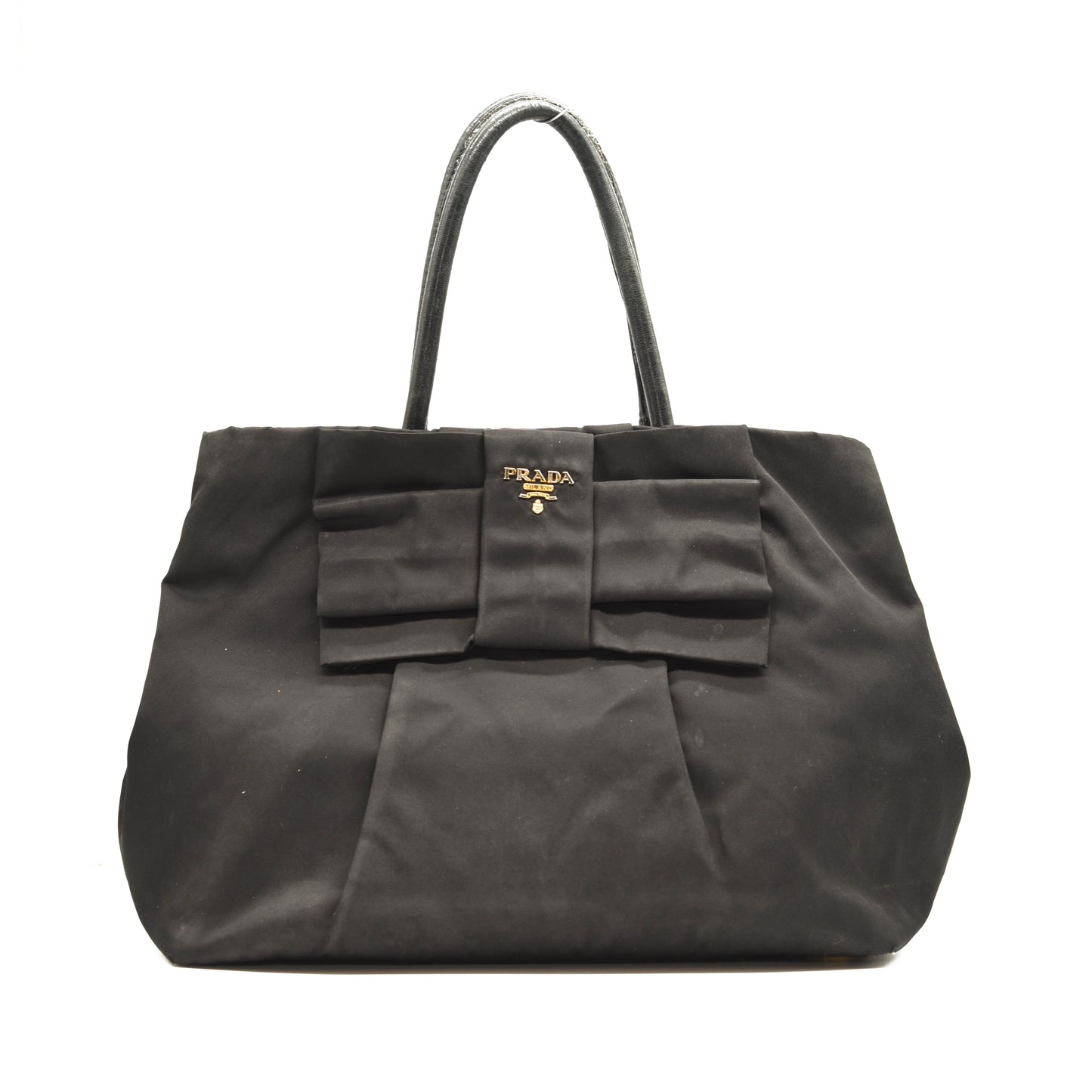 This is an authentic PRADA Tessuto Fiocco Bow Tote Black. This chic satchel is crafted of fine pleated nappa calfskin leather. The bag features rolled leather top handles, a leather shoulder strap with silver clasps, and a top zipper. This top zipper opens to a Prada monogram fabric interior. This is a marvelous tote that is ideal for everyday use, only from Prada!