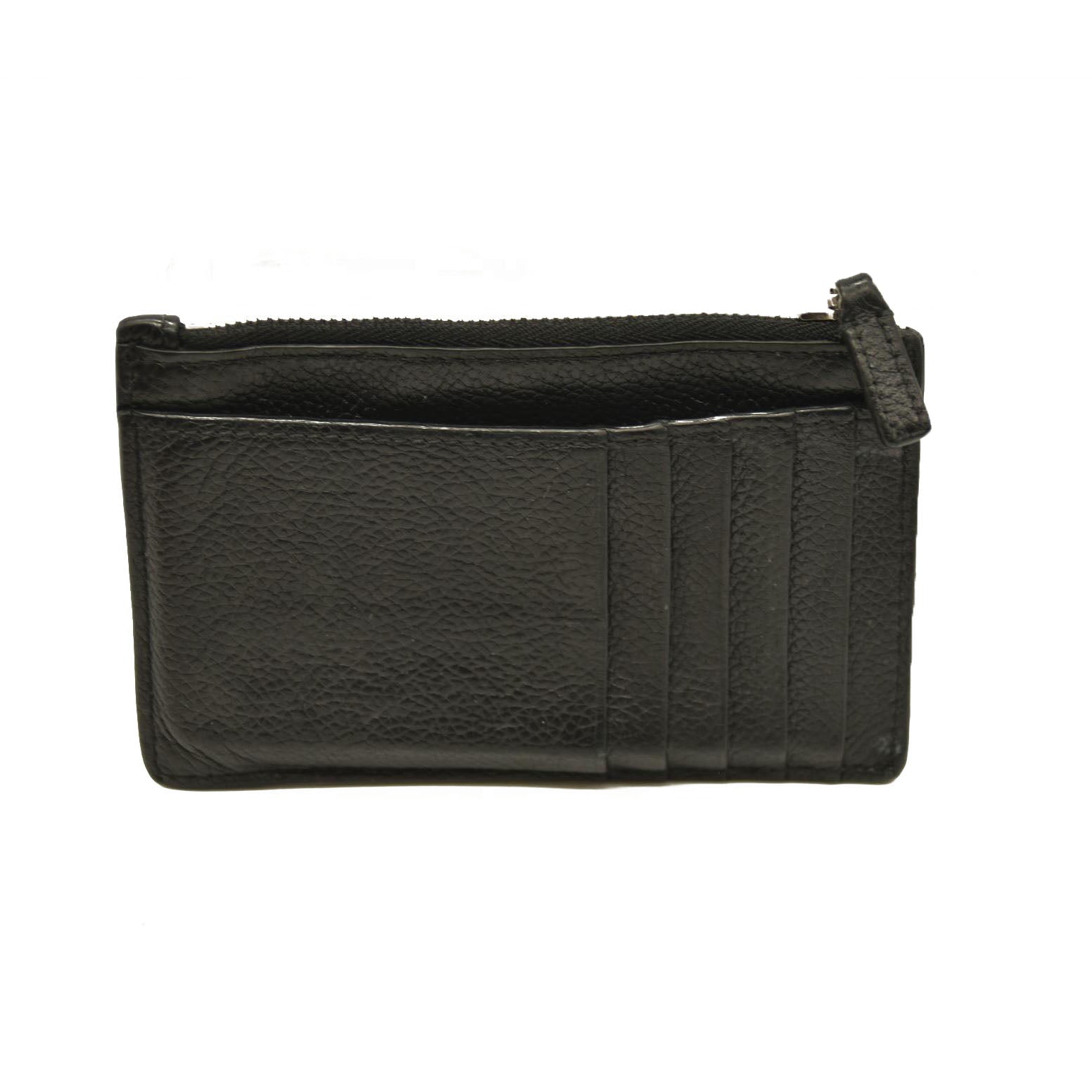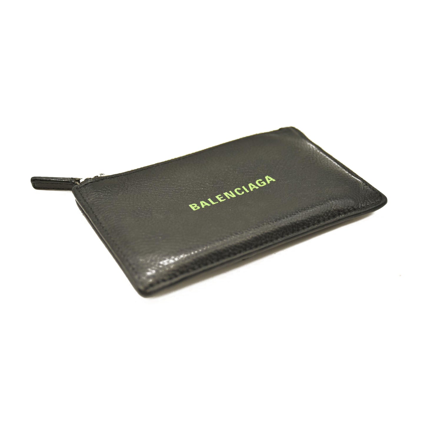 This is an authentic BALENCIAGA Grained Calfskin Logo Long Coin Card Holder in Black. This stylish cardholder is crafted in a black leather exterior. This wallet features BALENCIAGA in green print across the front, card slots on the reverse, and gold hardware. The top zipper opens to a black leather interior.