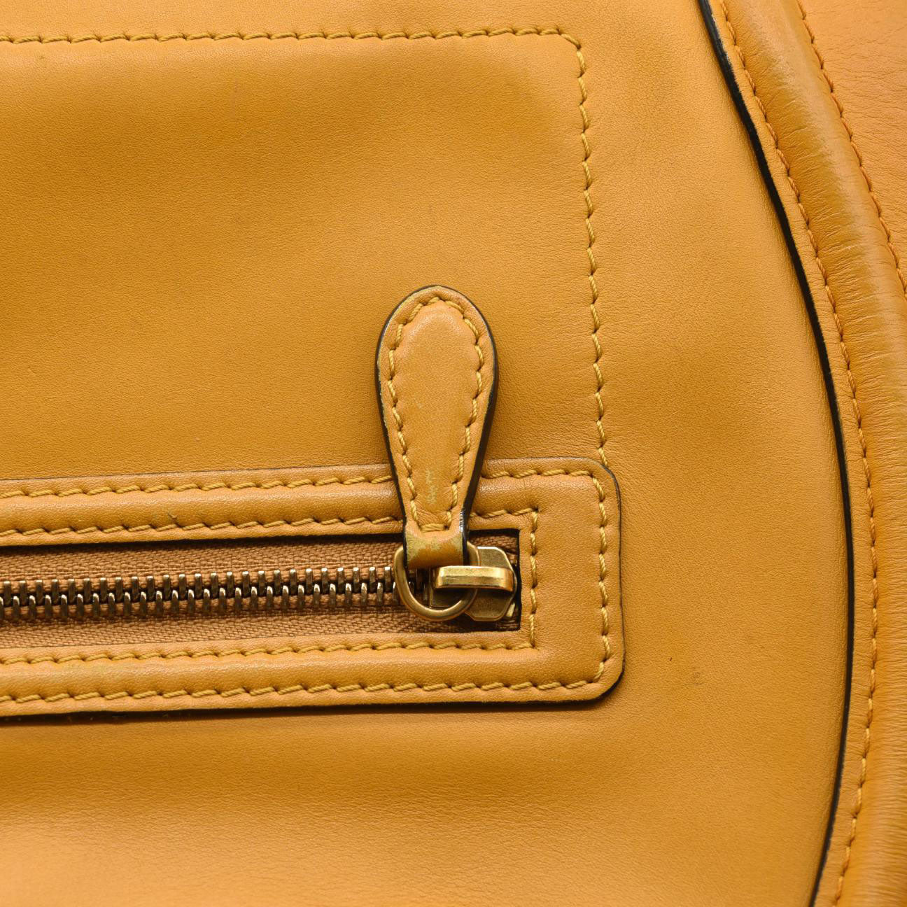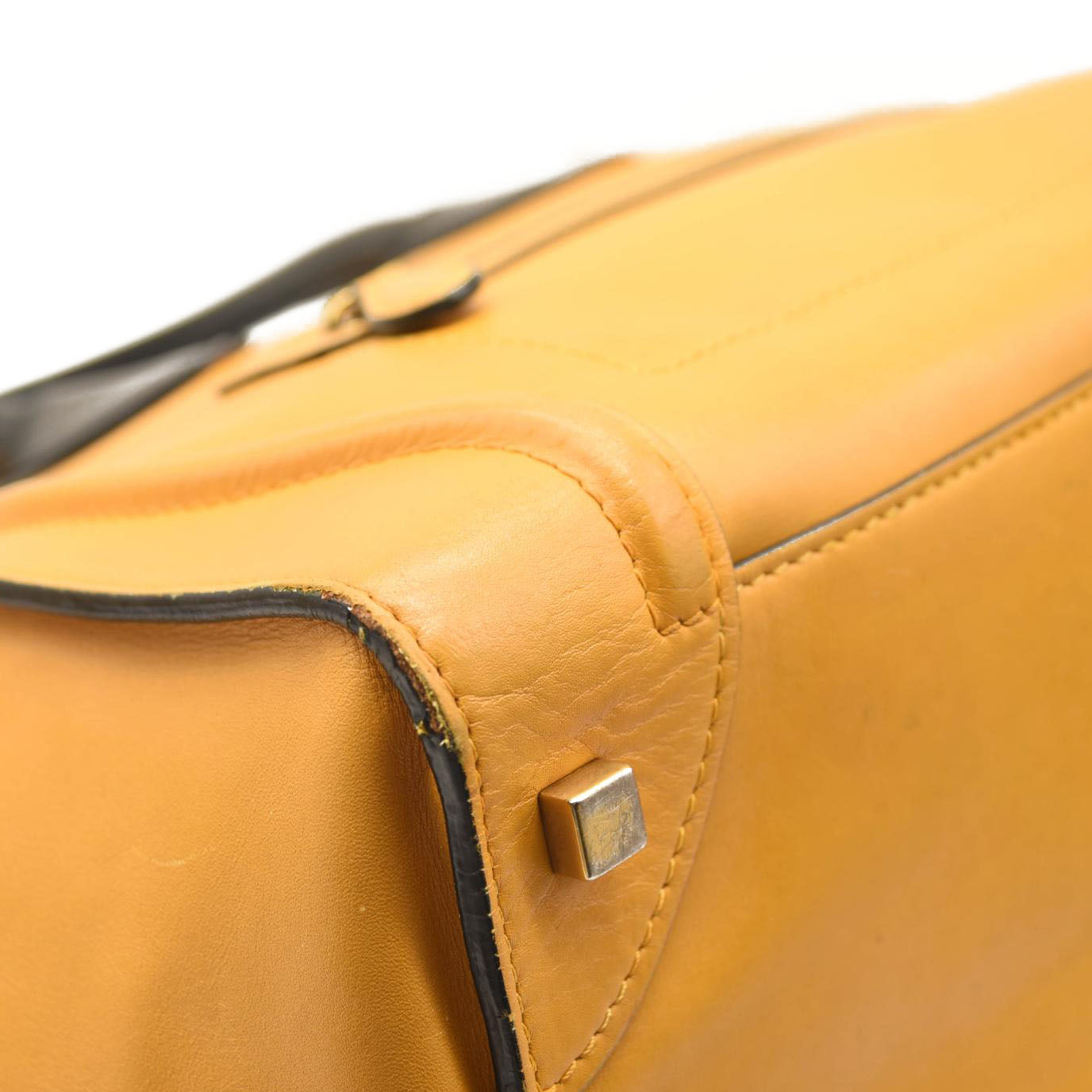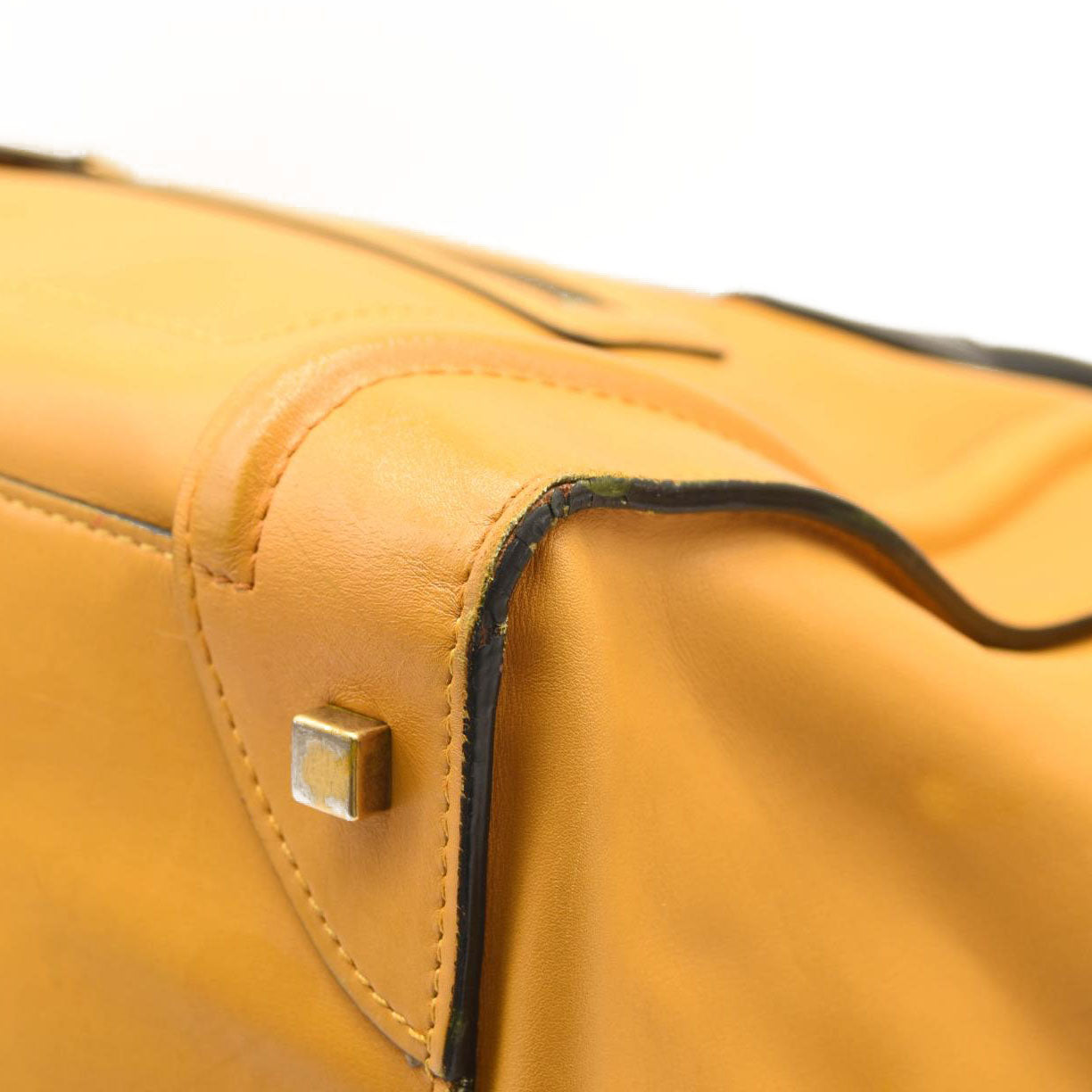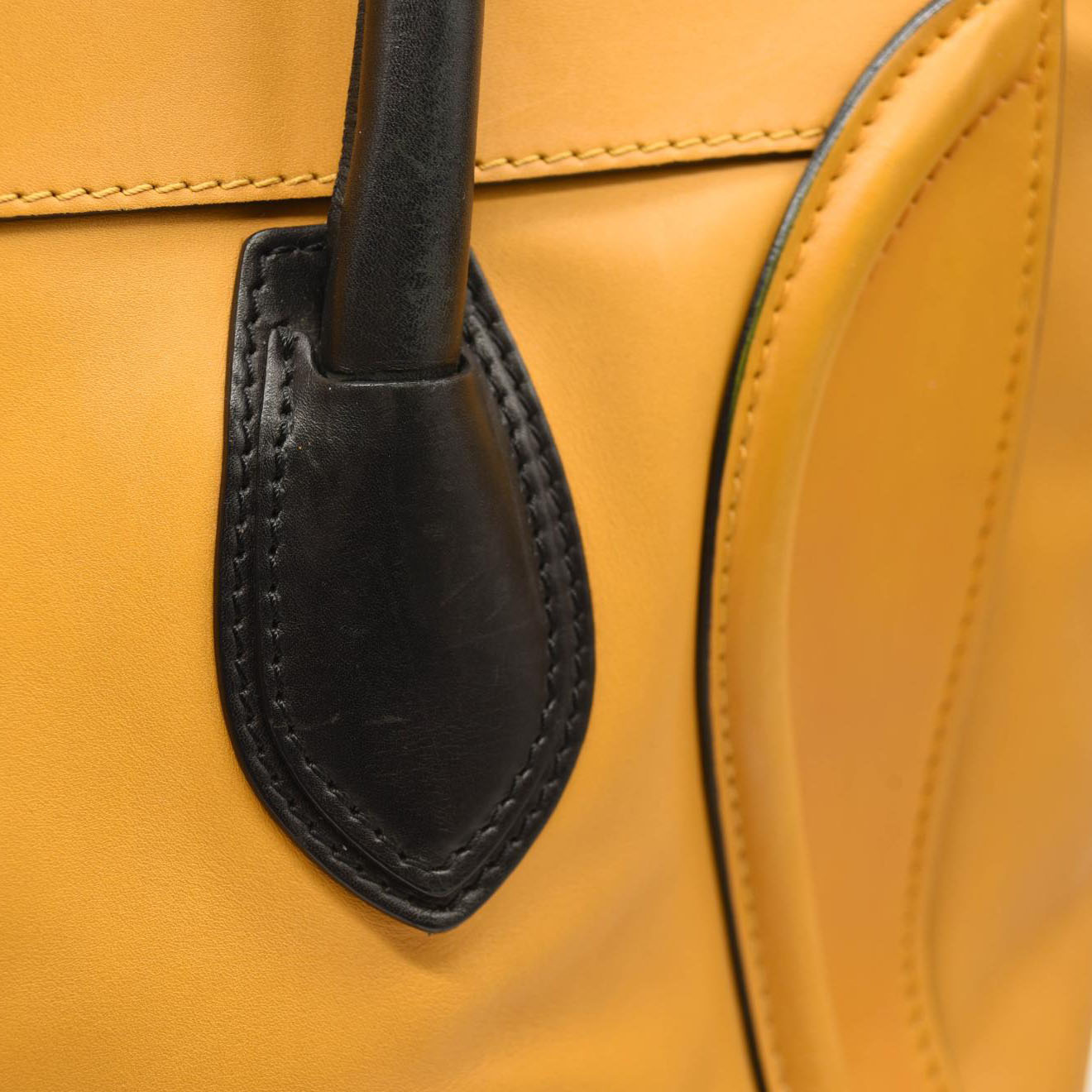 This is an authentic CELINE Drummed Calfskin Mini Luggage in Ocre. This chic travel tote is crafted of luxurious finely grained calfskin leather in yellow and black. The bag features rolled leather top handles, expandable sides, a facing zipper pocket, and a top overextended zipper. This opens to a spacious yellow fabric interior with a zipper and patch pockets. Tote your necessities in style with the sophisticated quality of Celine!