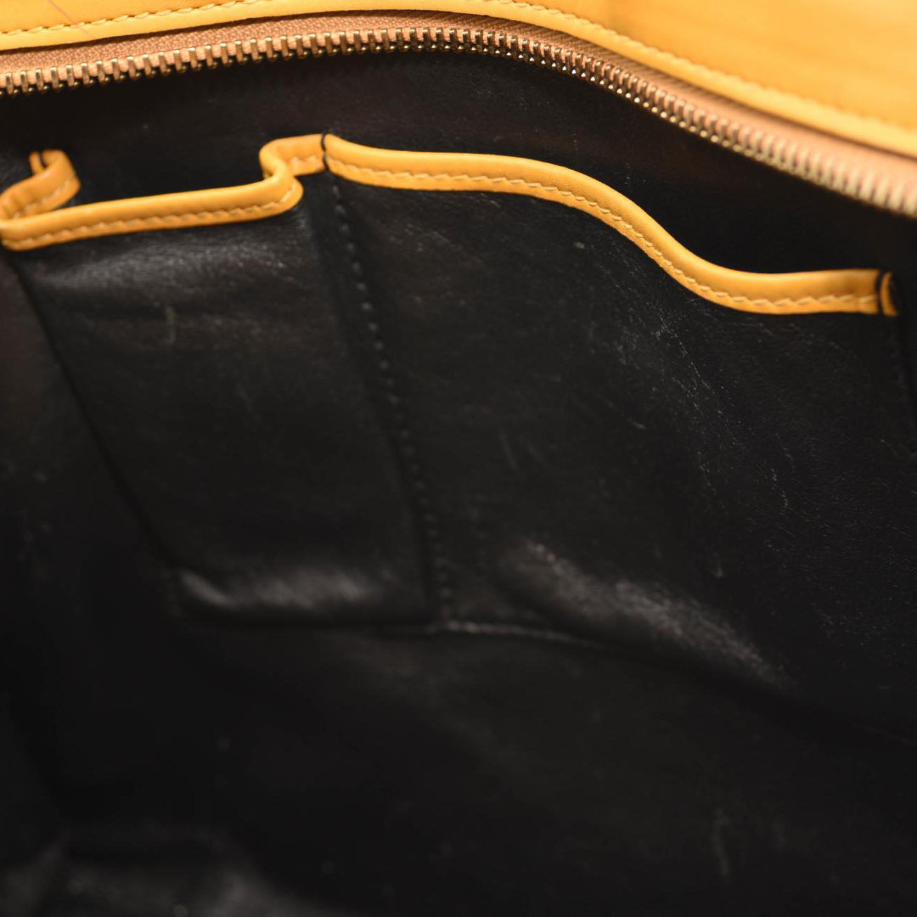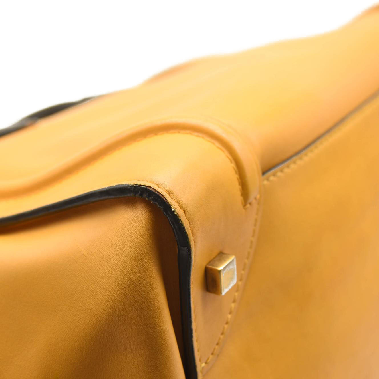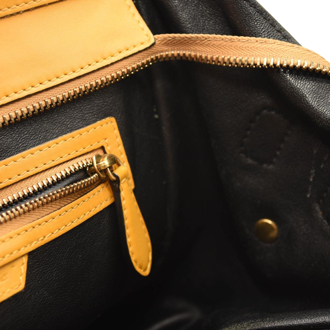This is an authentic CELINE Drummed Calfskin Mini Luggage in Ocre. This chic travel tote is crafted of luxurious finely grained calfskin leather in yellow and black. The bag features rolled leather top handles, expandable sides, a facing zipper pocket, and a top overextended zipper. This opens to a spacious yellow fabric interior with a zipper and patch pockets. Tote your necessities in style with the sophisticated quality of Celine!