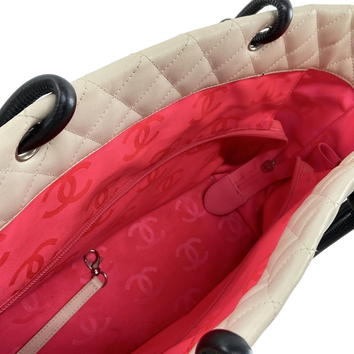 This is an authentic CHANEL Calfskin Quilted Large Cambon Tote in White and Black. This stylish shoulder bag is beautifully crafted of soft diamond quilted calfskin leather in white. The handbag features black leather rope handles that are knotted at the ends, a rear patch pocket and a large black leather Chanel CC logo patch to one side. The top zipper opens to a florescent pink Chanel logo fabric interior with two zipper pockets, a cell phone pocket and two pen holders.