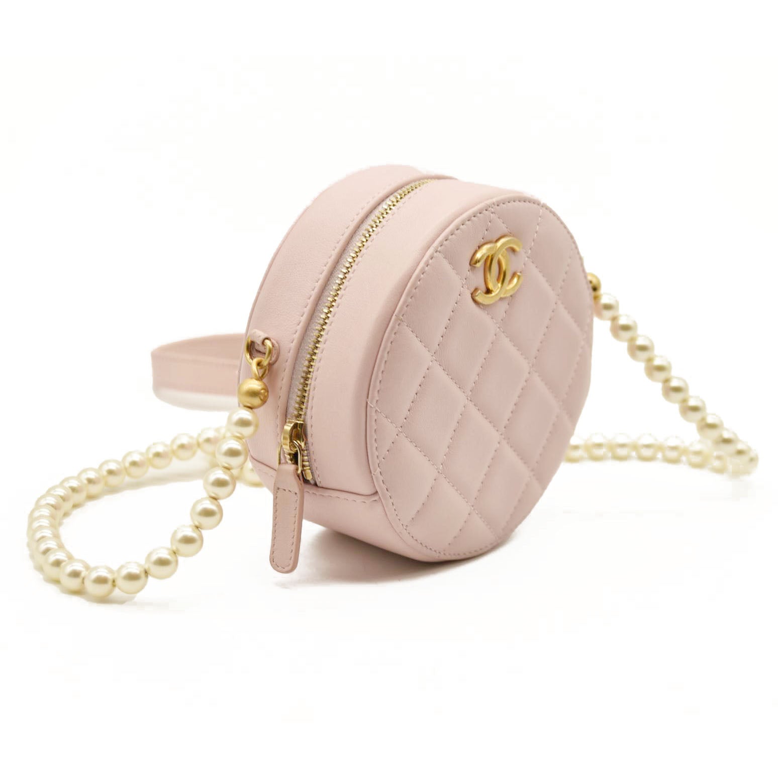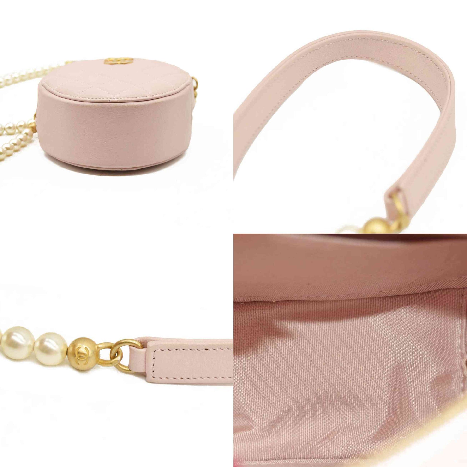 This is an authentic CHANEL Calfskin Quilted Pearl Round Clutch With Chain in Light Pink. This stylish crossbody bag is crafted of luxurious calfskin leather in light pink. The bag features a faux pearl shoulder strap with a leather shoulder pad and an aged gold Chanel CC logo on the front. This shoulder bag opens with a top zipper to a matching fabric interior with patch pockets.