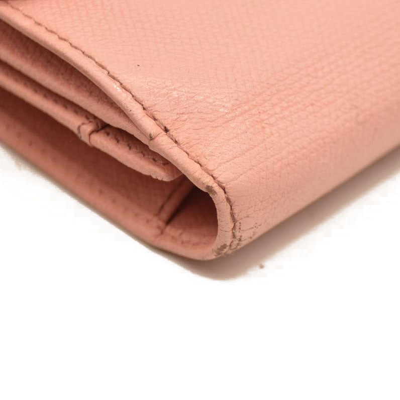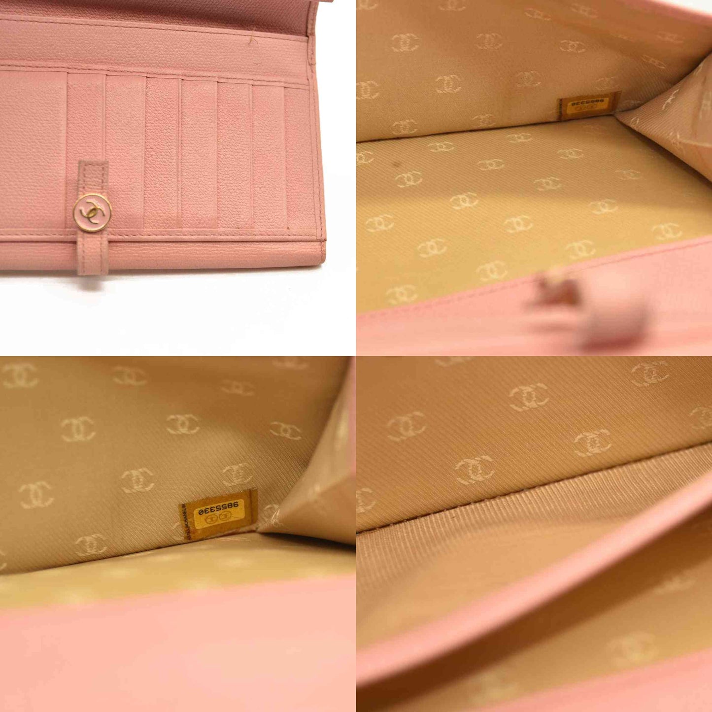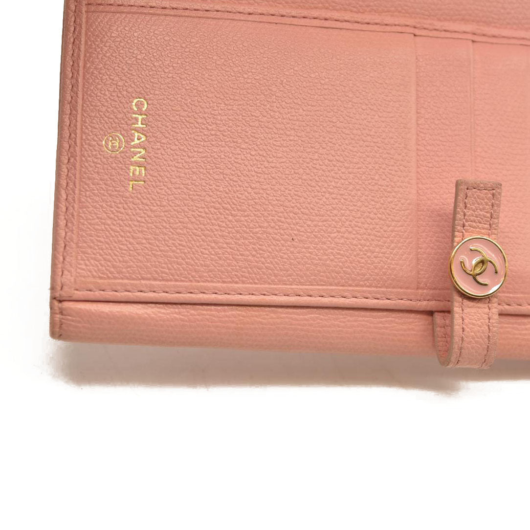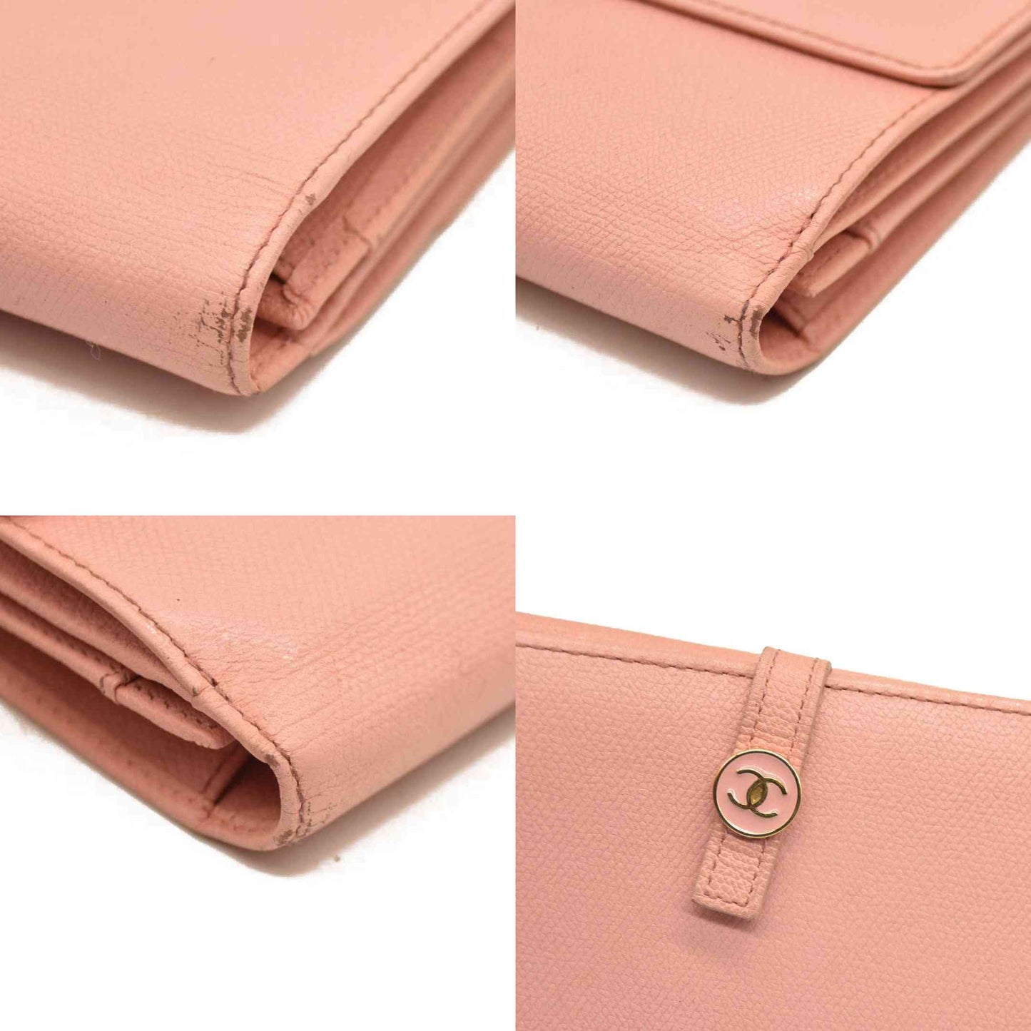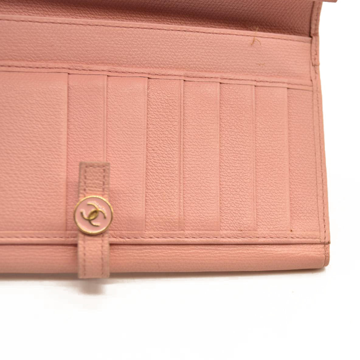 This is an authentic CHANEL Grained Calfskin CC Button Wallet. This wallet is crafted of pink grained calfskin leather. The front features a flap with a rear flap pocket and a small ruthenium Chanel CC frontal logo that opens to a matching leather interior with card slots, patch pockets, and billfolds.