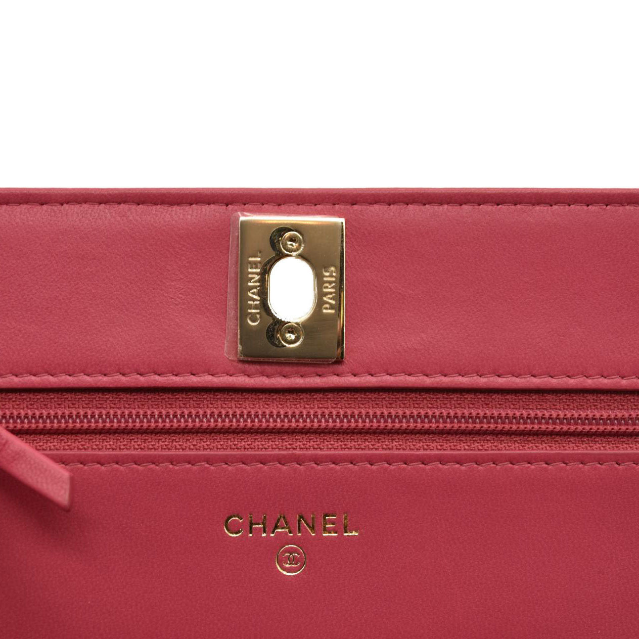 This is an authentic CHANEL Lambskin Chevron Quilted Trendy CC Wallet On Chain WOC in Pink. This stylish wallet is crafted of luxurious chevron quilted lambskin leather in pink. The bag features a long polished gold chain link leather threaded shoulder strap, a front gold Chanel CC closure and a Chanel plate on the top. This unsnaps to a pink fabric and leather interior with a panel of card slots and a zippered pocket. This is a beautiful crossbody for day or evening and just the essentials, from Chanel!