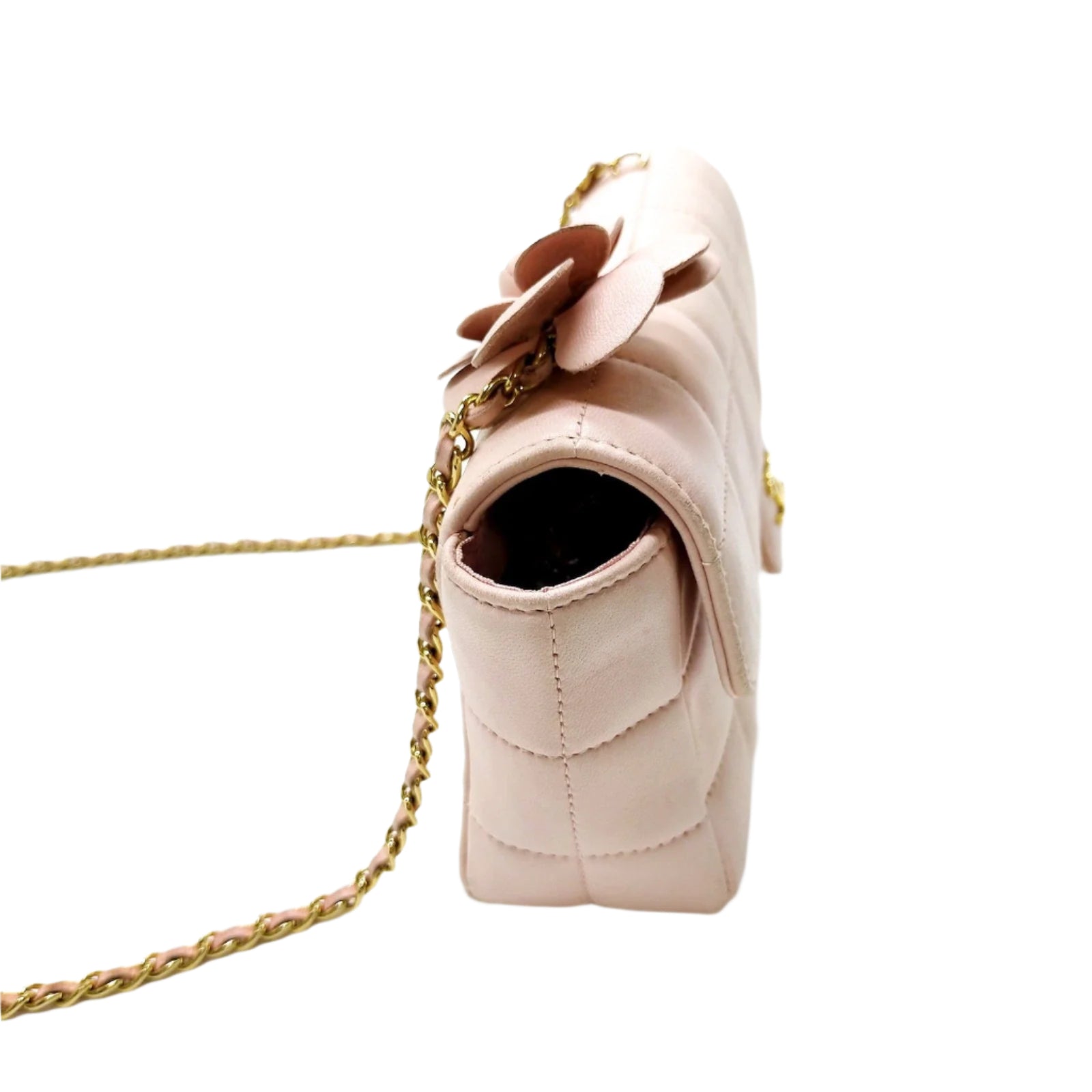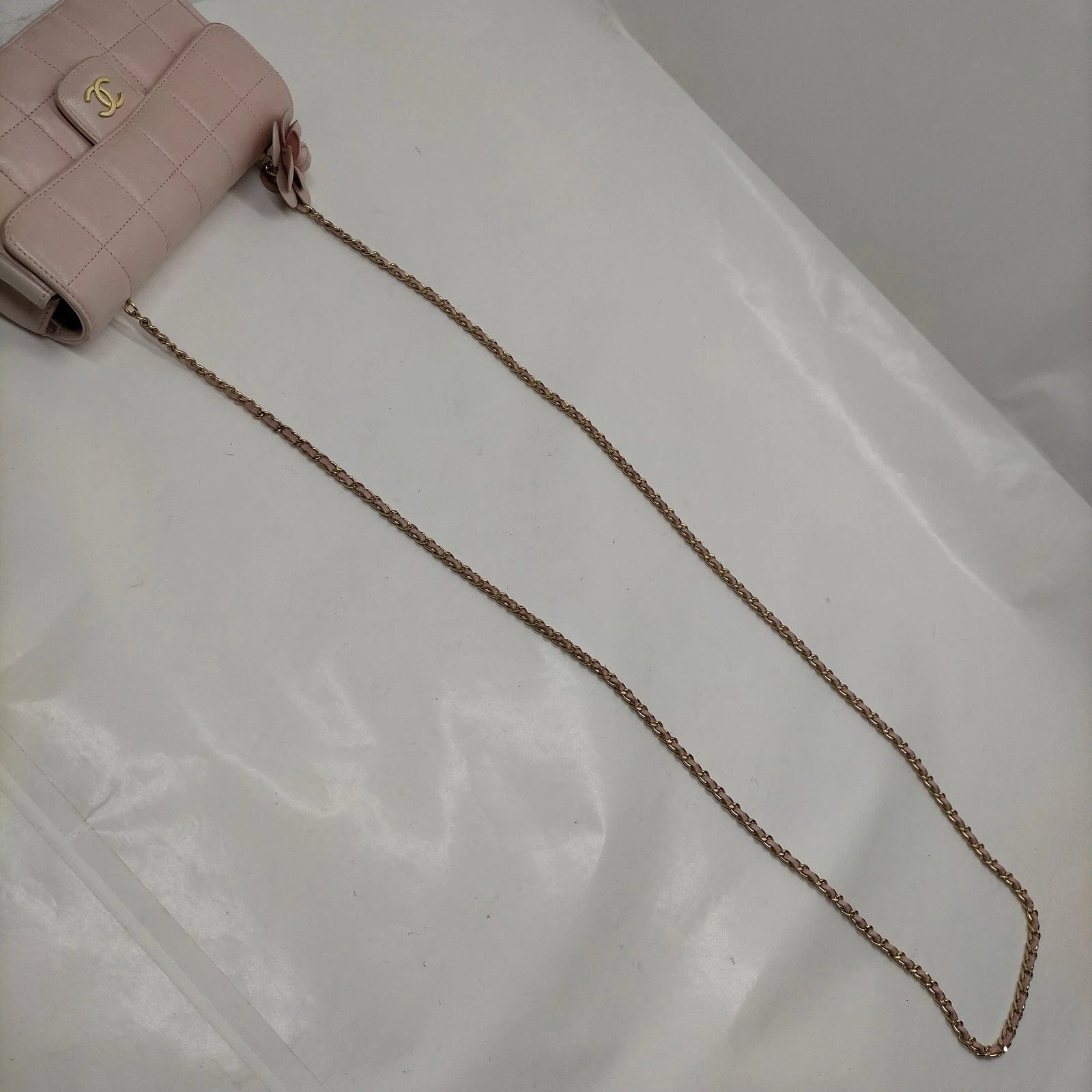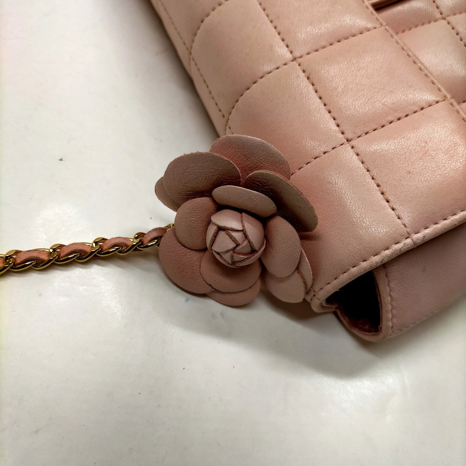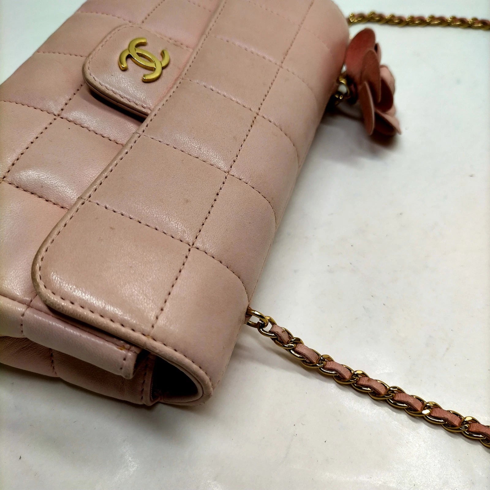 This is an authentic CHANEL Lambskin Quilted Mini Chocolate Bar Camellia Flap in Pink. This chic small shoulder bag is finely crafted of chocolate bar quilted soft lambskin leather in pink. The bag features a long polished gold chain link shoulder strap threaded with leather and a front flap with a layered leather camellia flower and gold Chanel CC logo. This flap opens to a pink fabric interior with a patch pocket.