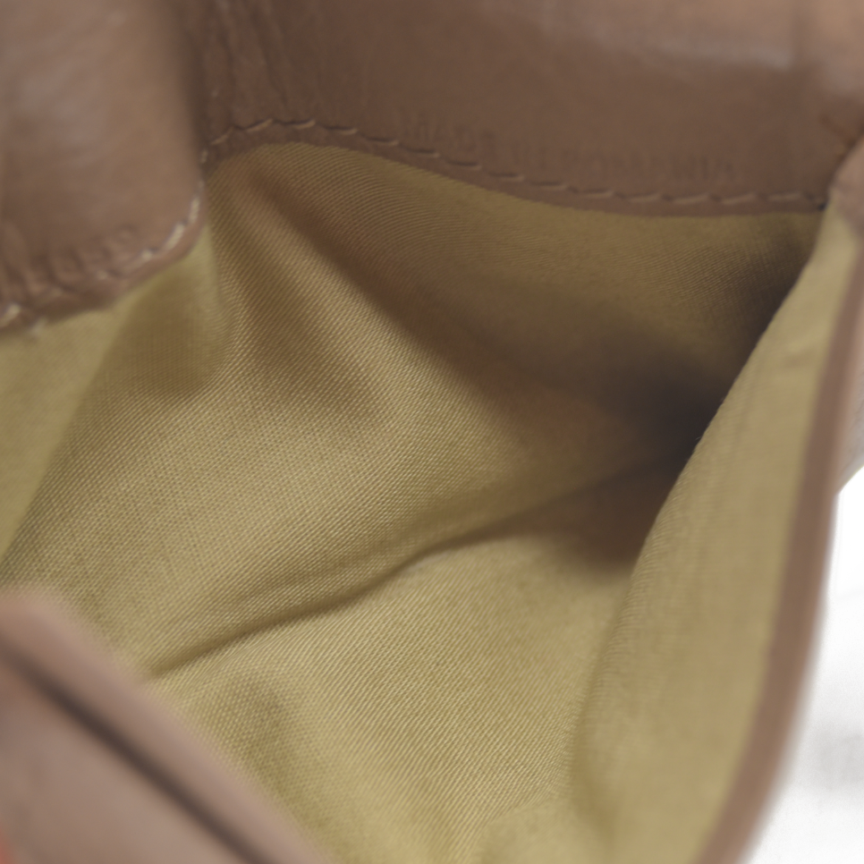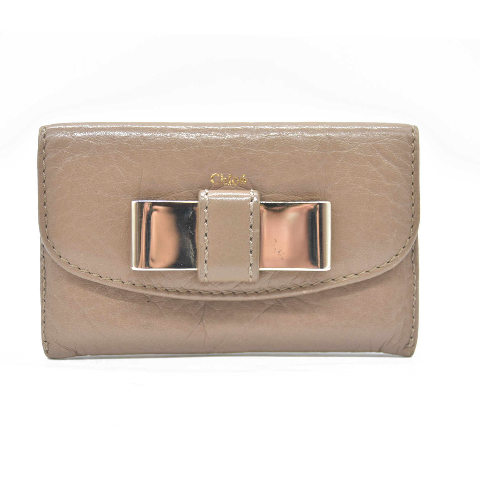 This is an authentic Chloé Lily Leather Card Case in Beige. Crafted from soft beige leather, this compact card holder features a flap closure with a gold-tone metal bow detail. The interior includes multiple card slots, offering both style and functionality.