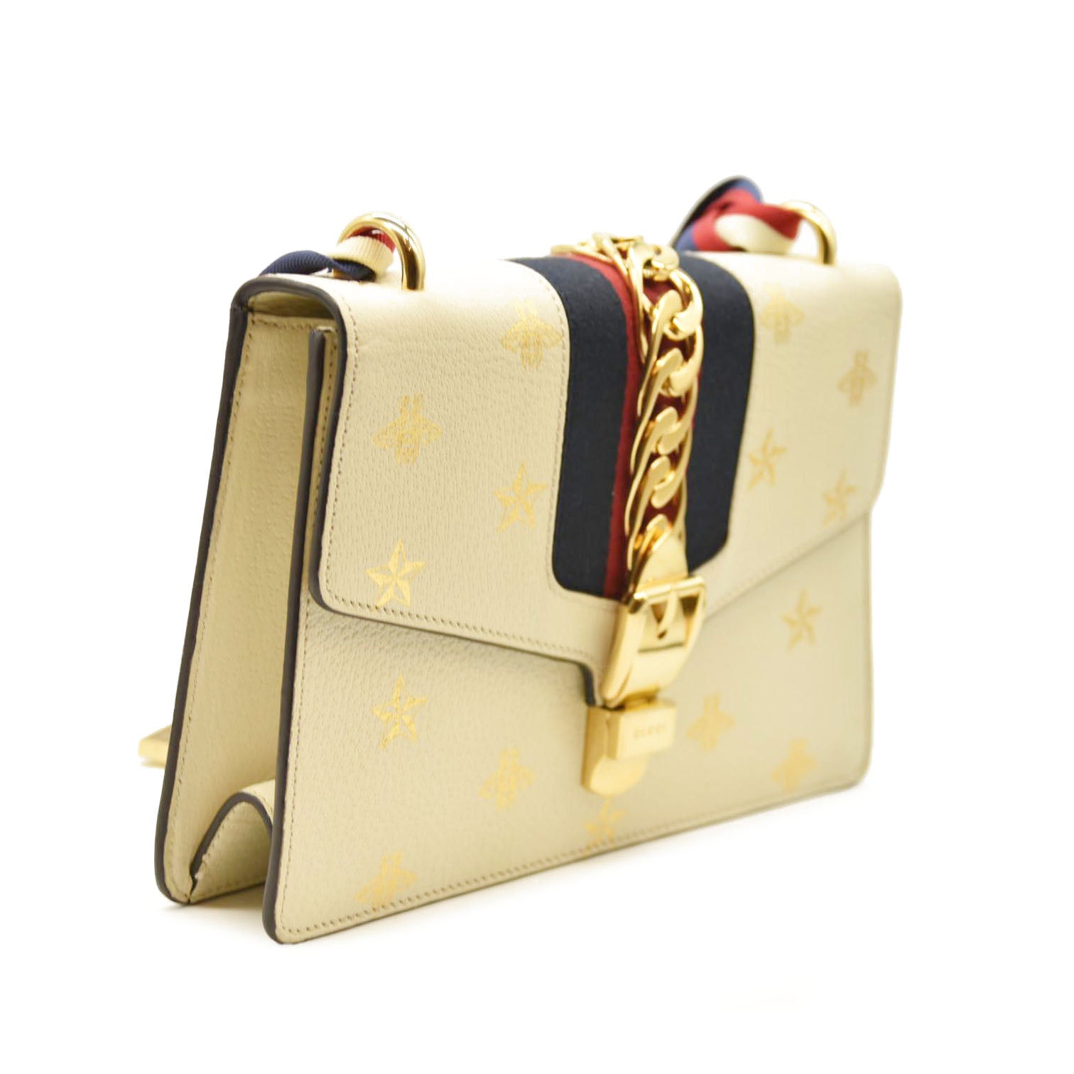 This is an authentic GUCCI Calfskin Small Sylvie Shoulder Bag in Off White. This structured shoulder bag is crafted of smooth calfskin leather in white and features a prominent front flap detailed with a central nylon red and navy blue web stripe embellished with a chain buckle lock closure. This stylish bag has two interchangeable and detachable shoulder straps; one being a classic white leather strap and the other, a red and navy blue webbed stripe ribbon. The top flap opens to a camel microfiber lining interior with zipper and patch pockets.