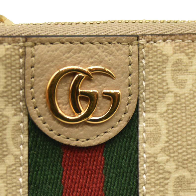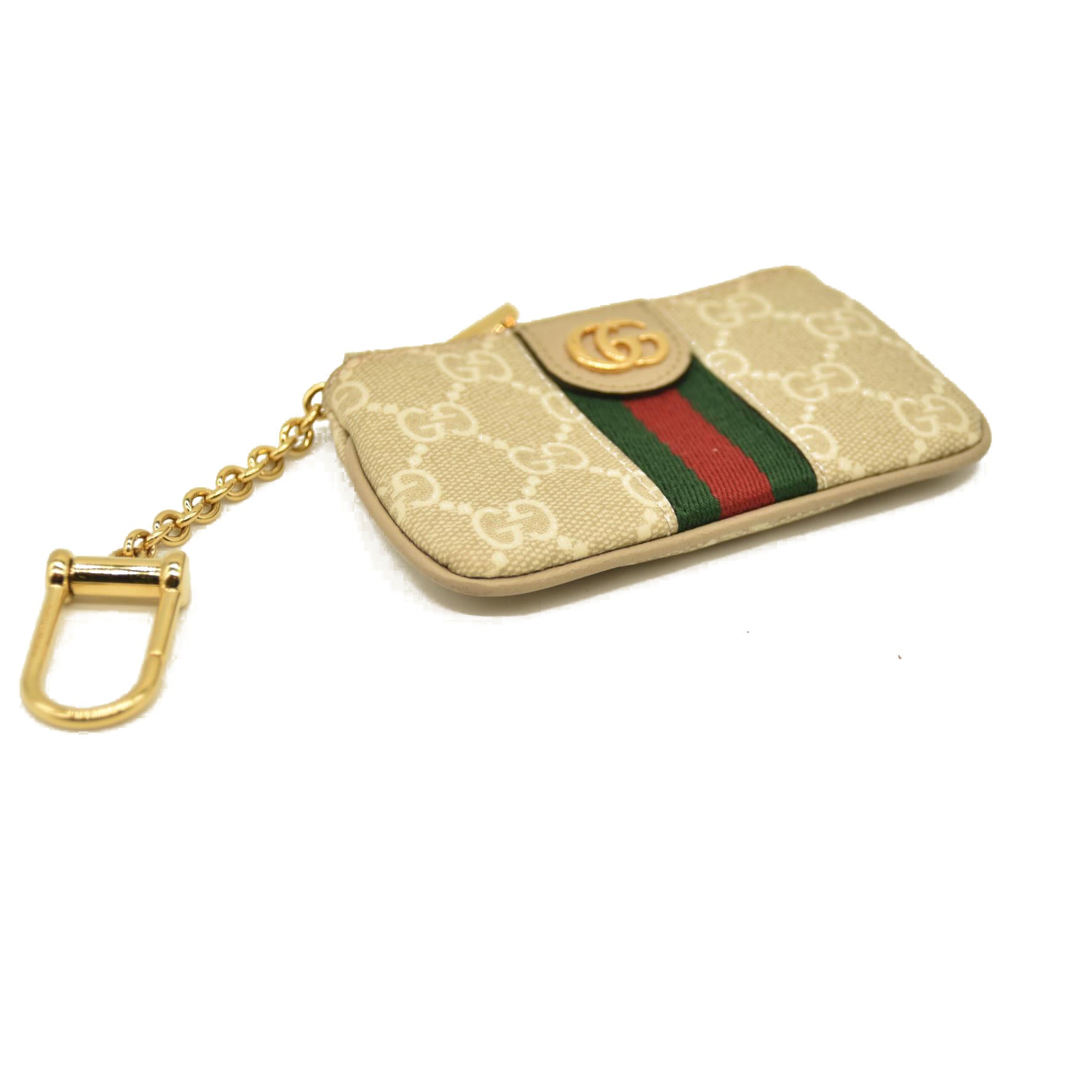 This is an authentic GUCCI GG Supreme Monogram Web Ophidia Key Case in Beige and Mystic White Oatmeal. This coin purse is crafted of coated canvas with the Gucci monogram motif. This petit bag features beige trim, a polished gold GG logo on the front, and a red and green web stripe. The top zipper opens to a beige fabric interior with a D-ring keychain.