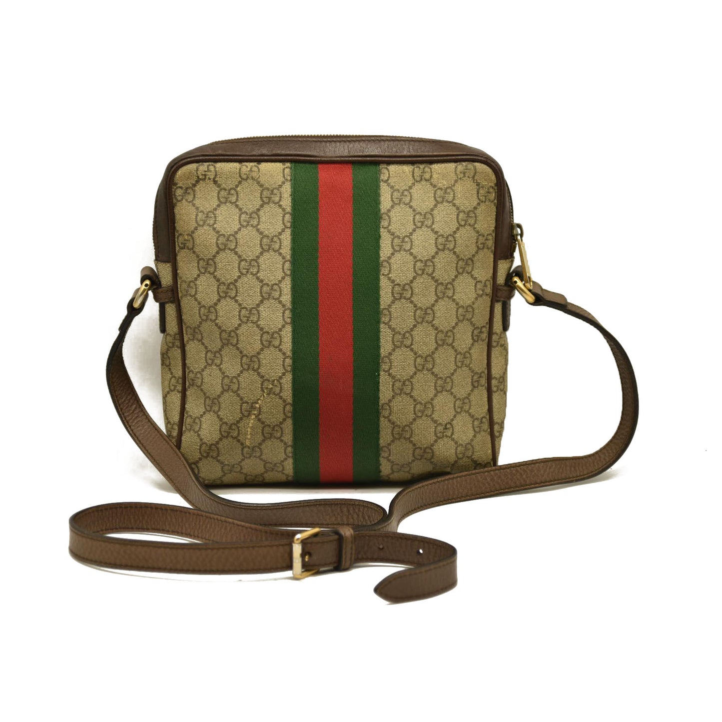 This is the authentic GUCCI GG Supreme Monogram Web Small Ophidia Messenger Bag in Brown. This crossbody bag is crafted of monogram coated canvas with brown leather trim and the classic red and green web stripe down the center. The bag features a brown leather adjustable shoulder strap, a front zipper pocket accented with the classic gold GG logo, and aged gold hardware. The top zipper opens to a linen fabric interior with a zipper and patch pocket.