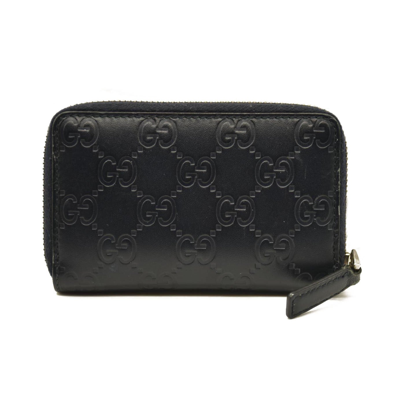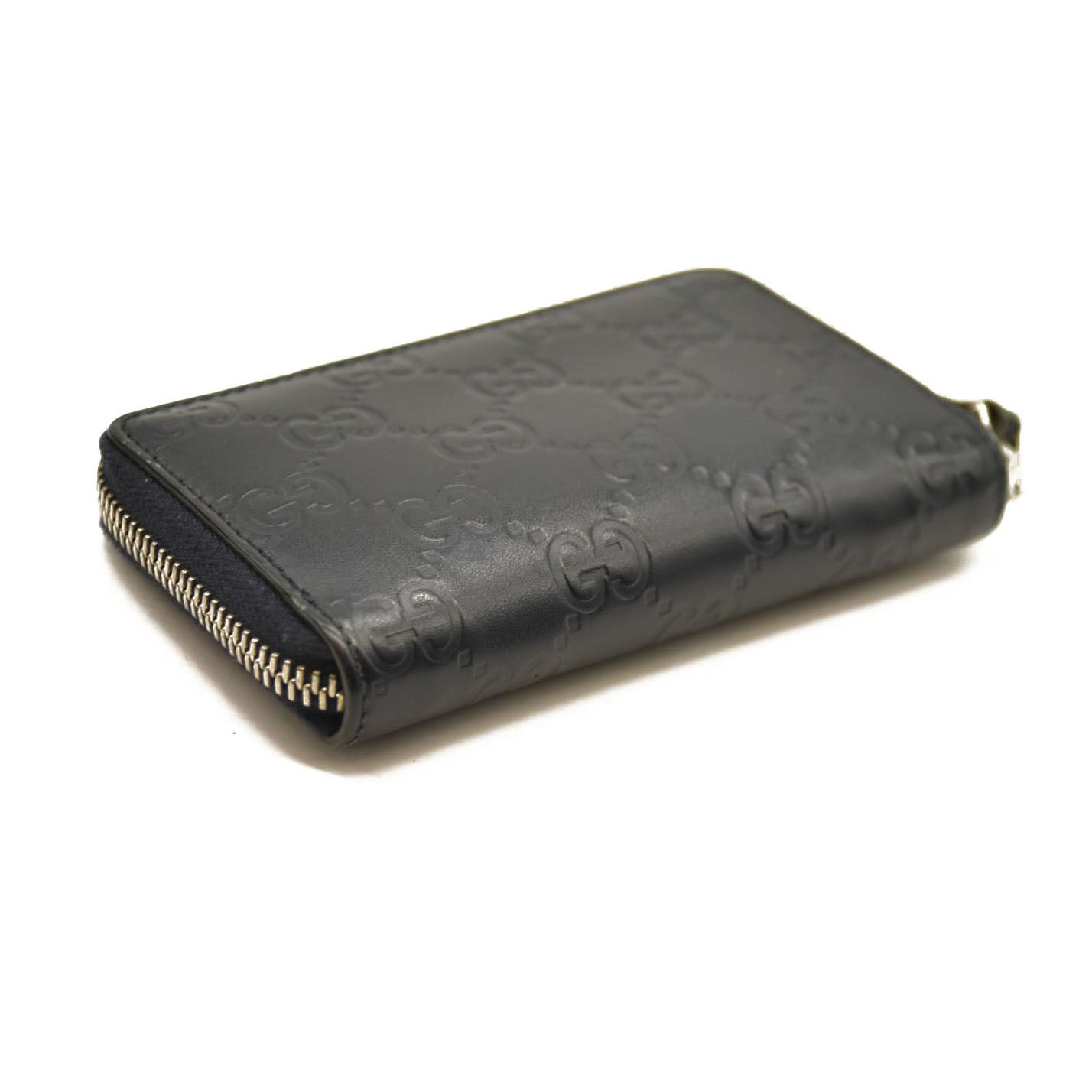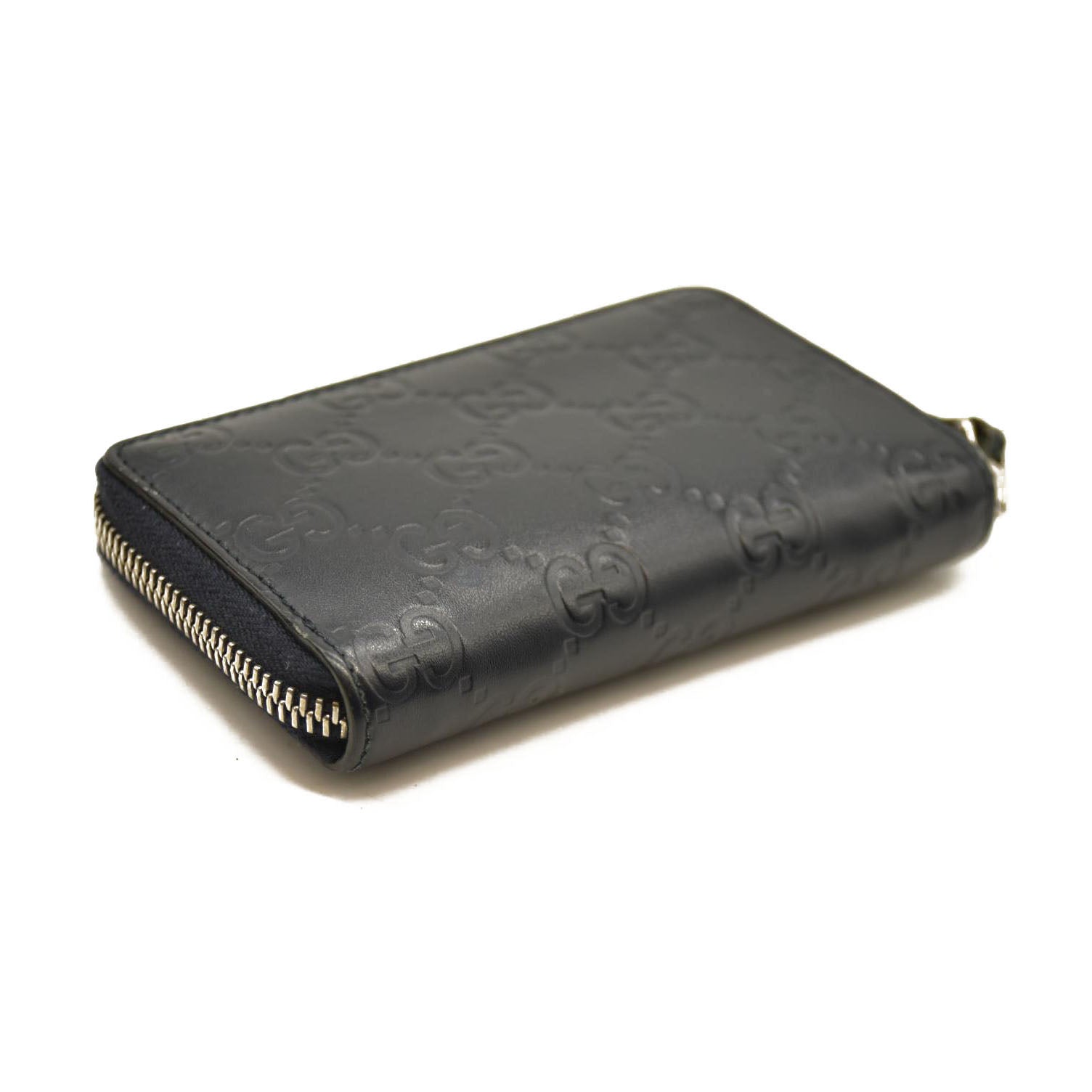 This is an authentic GUCCI Guccissima Zip Around Card Case in Black. This stylish coin purse is crafted of black Gucci monogram embossed leather. The case has a polished silver 3/4 wrap-around zipper opening to a partitioned black leather interior.