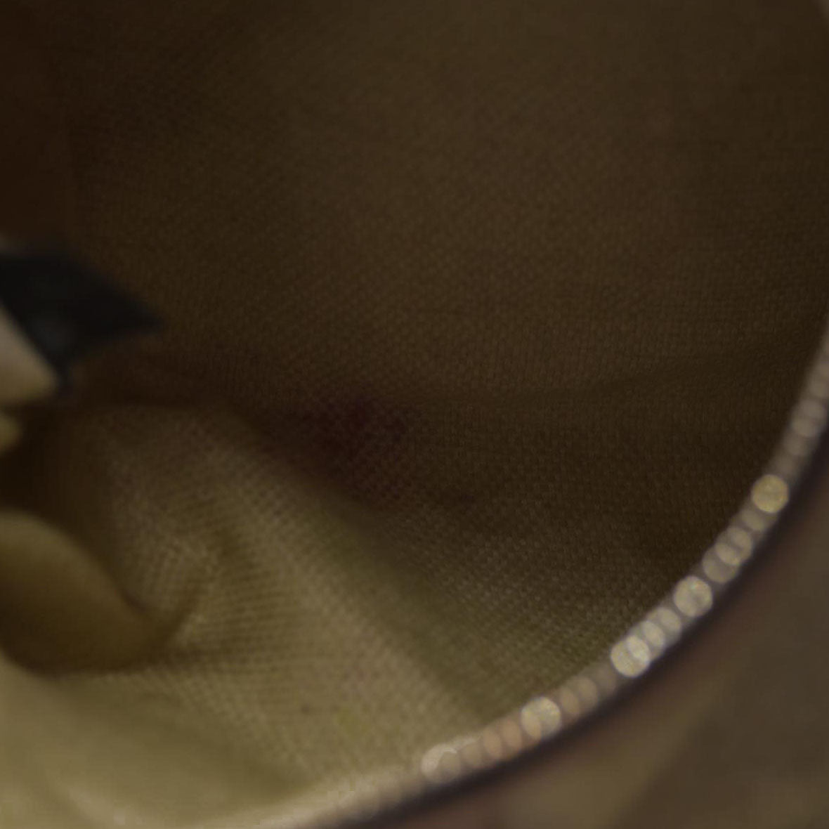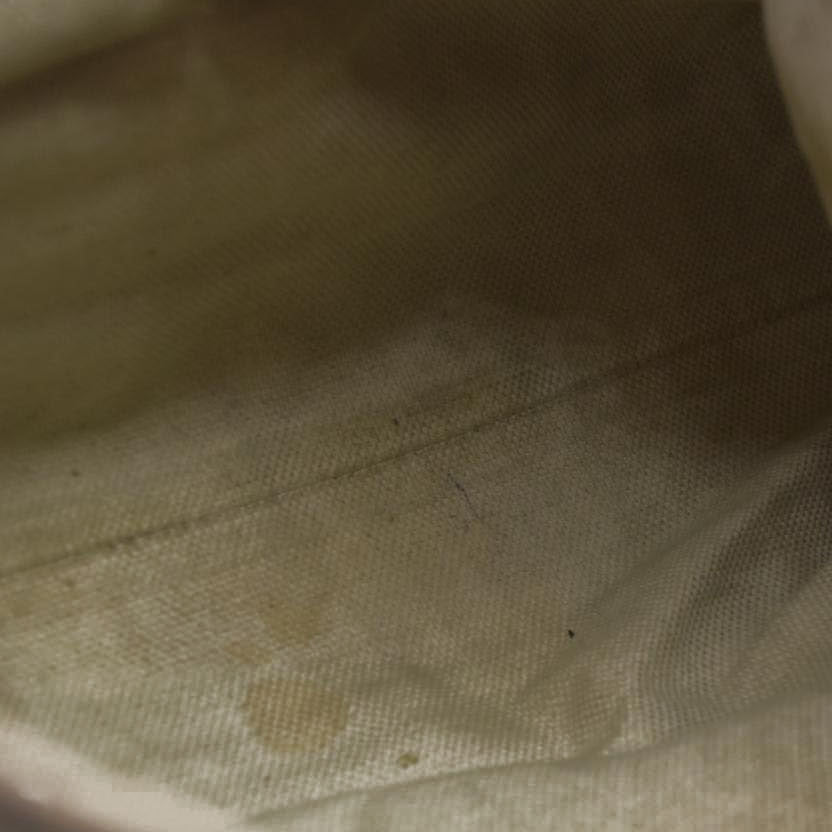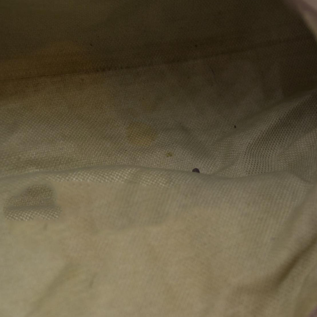 Heavy discoloration at interior and hardware; moderate discoloration at base, back, and strap; minor cracking at strap; minor discoloration at front.