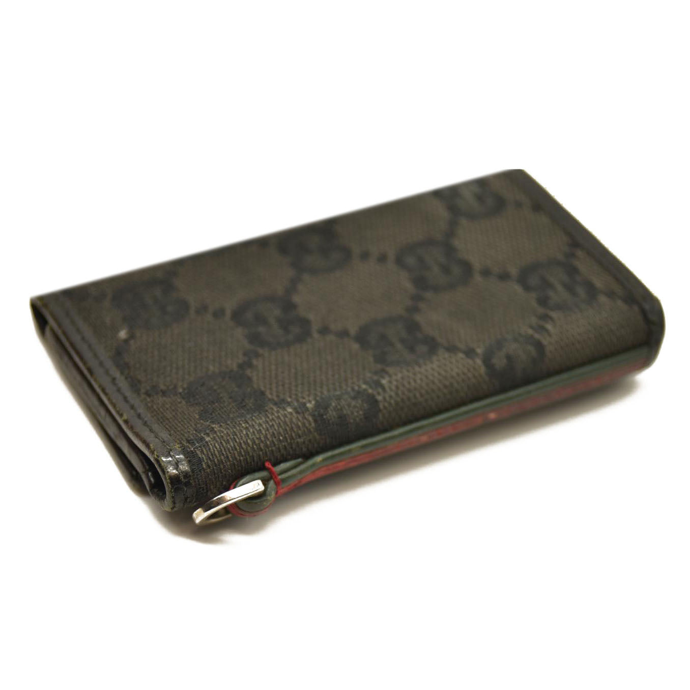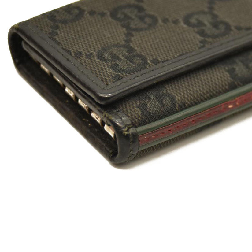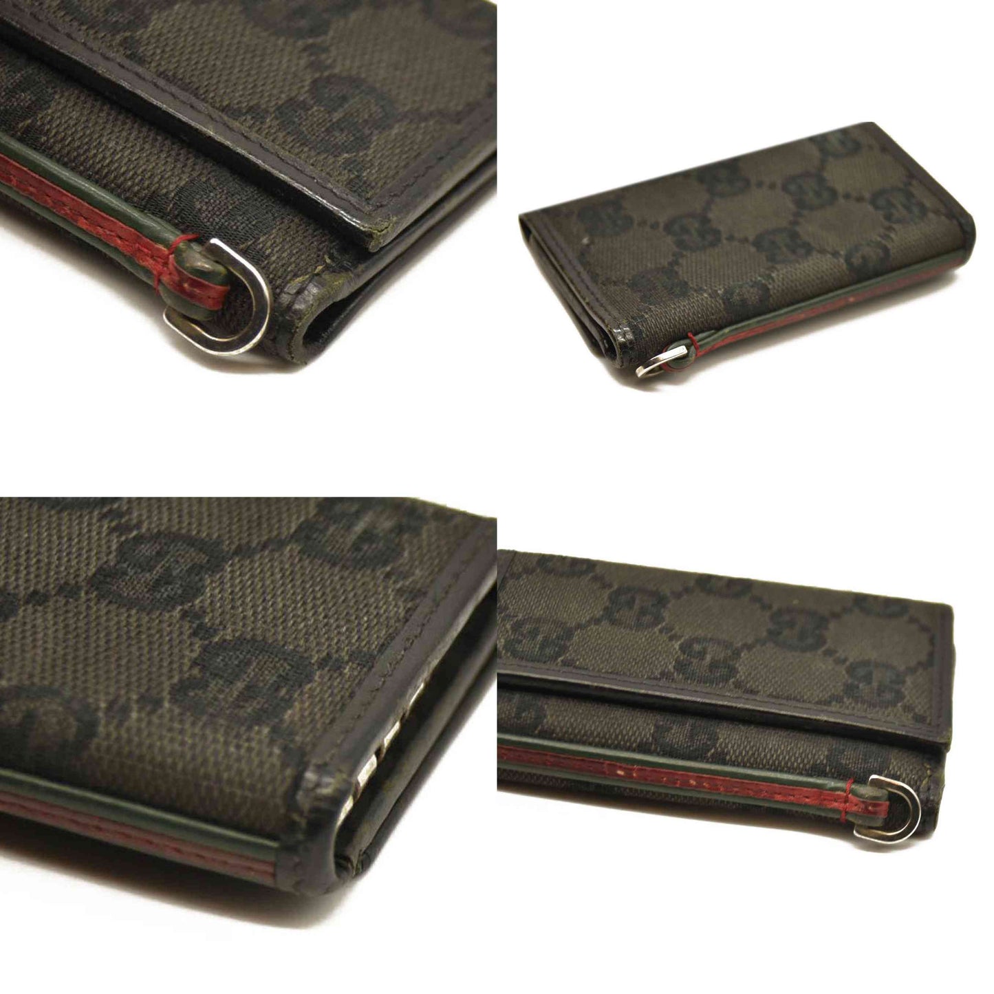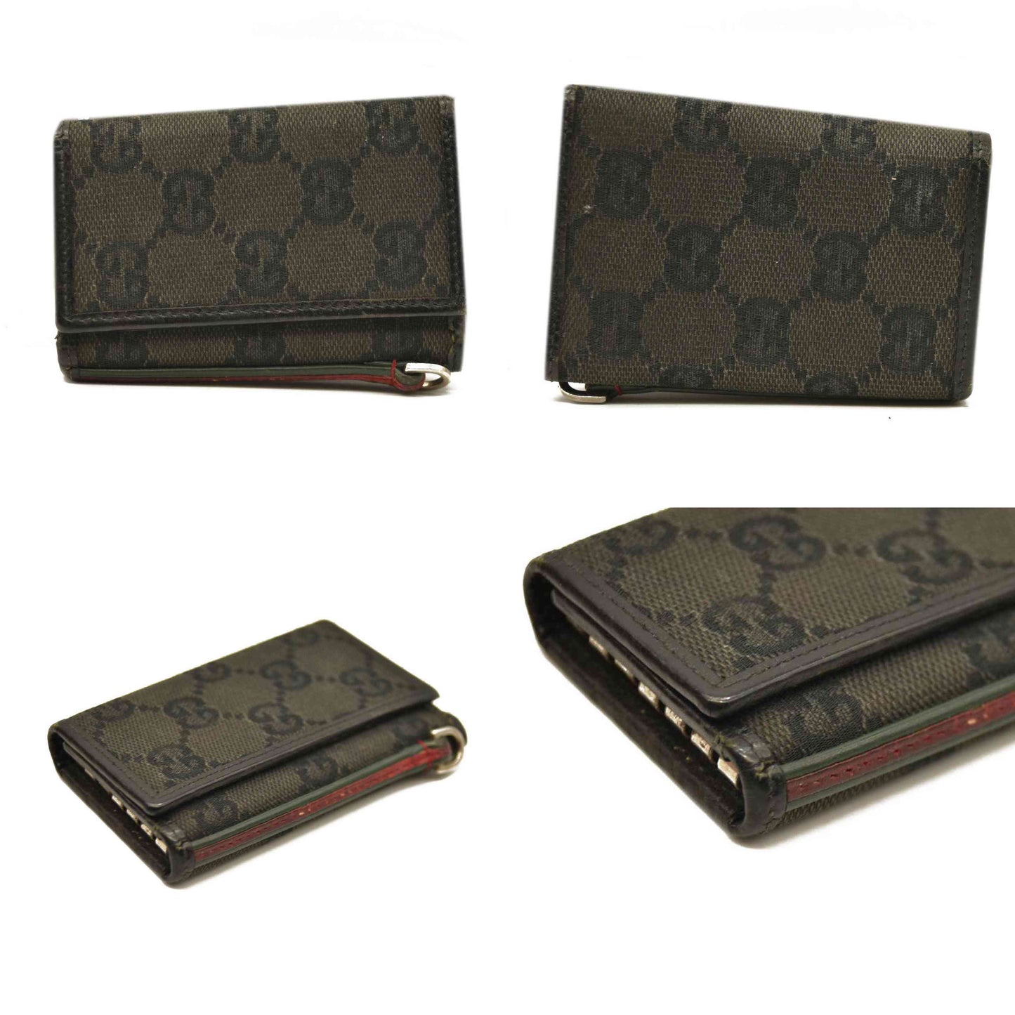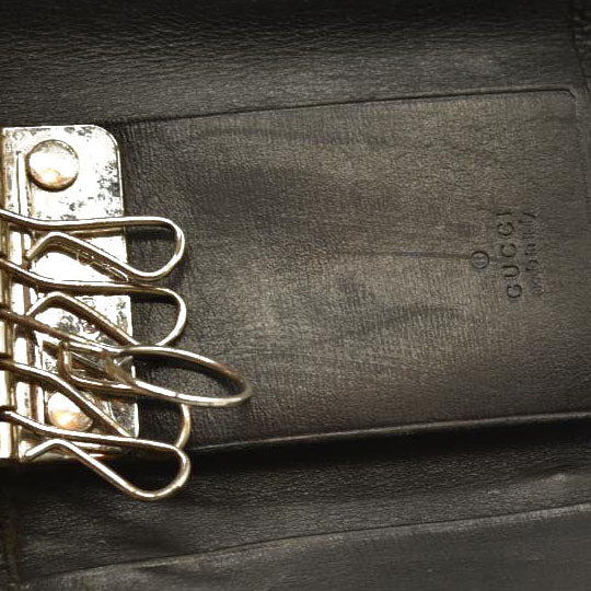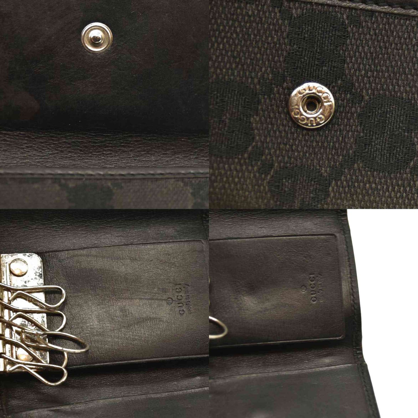 This is an authentic GUCCI Monogram 6 Key Holder Case in Black. The key holder is crafted of black Gucci GG canvas with a black cowhide leather trim. The case opens to a black leather interior with six silver rings for keys and a patched pocket. This is an excellent case with stylish sophistication from Gucci!